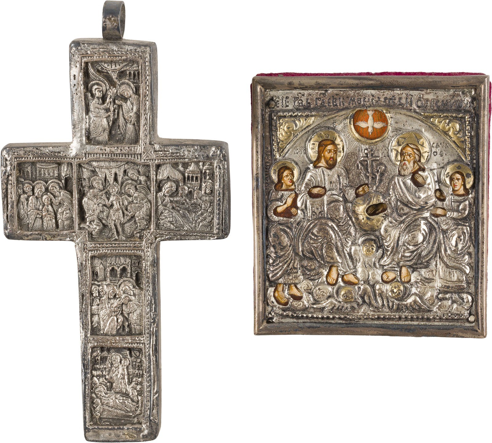 A MINIATURE ICON SHOWING THE NEW TESTAMENT TRINITY AND A CRUCIFIX WITH MAJOR FEASTS Recent Oil on wood panel with velvet backing. Metal, cast in relief. 7.5 x 6.7 cm / 12.5 x 6.5 cm.