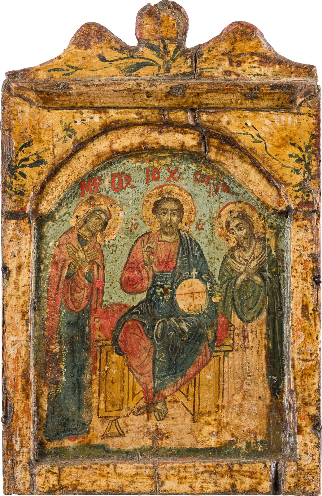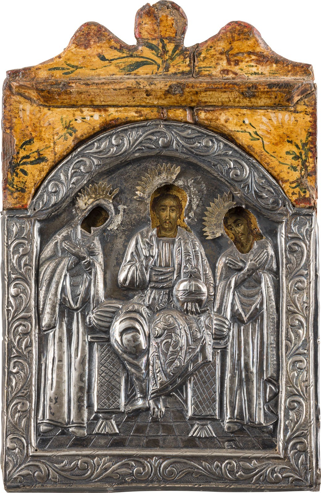 THE CENTRAL PANEL OF A TRIPTYCH SHOWING THE DEISIS WITH SILVER OKLAD Balkans, 18th century Tempera on wood panel. The silver oklad chased and repoussé. Wearings, partially restored. The silver oklad marked '800'. 27 x 17 cm.