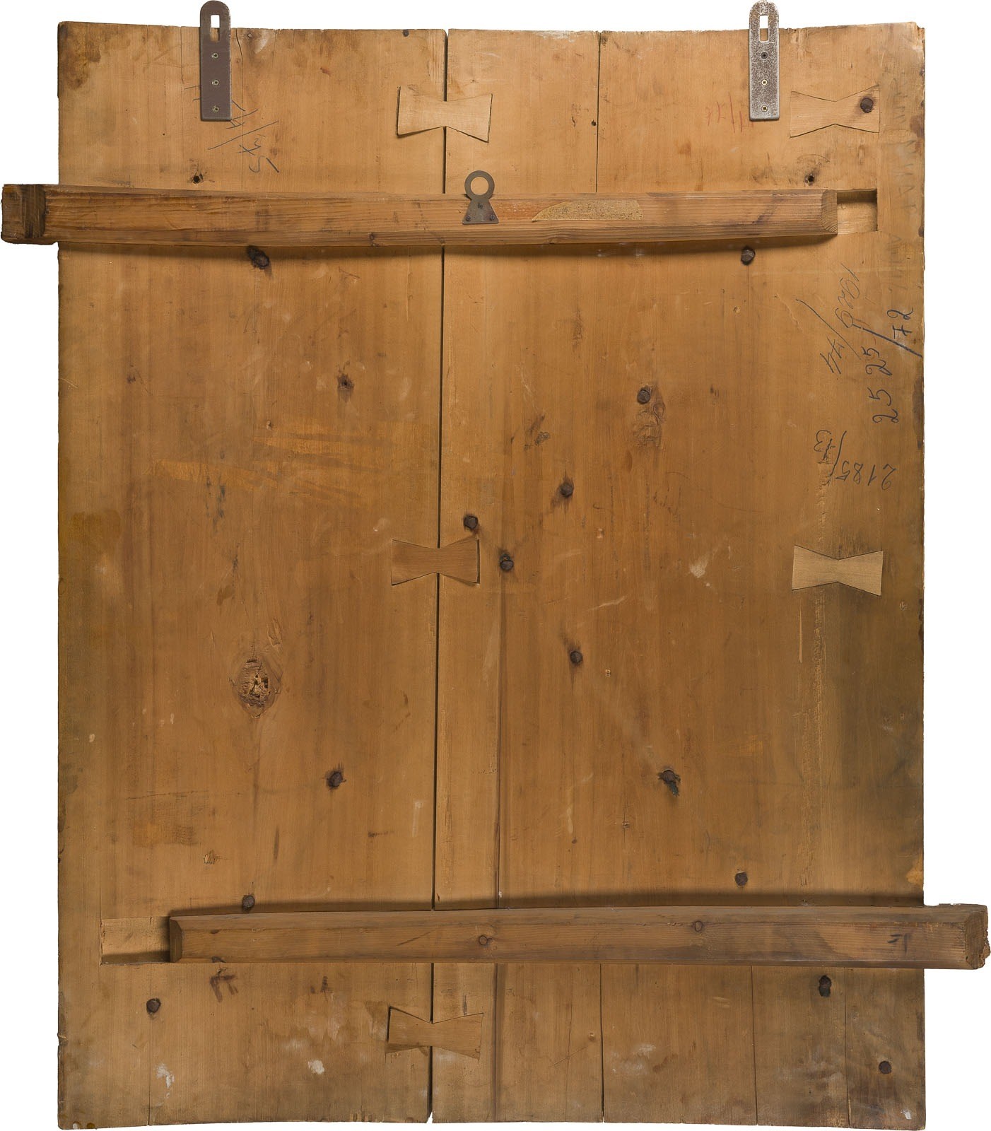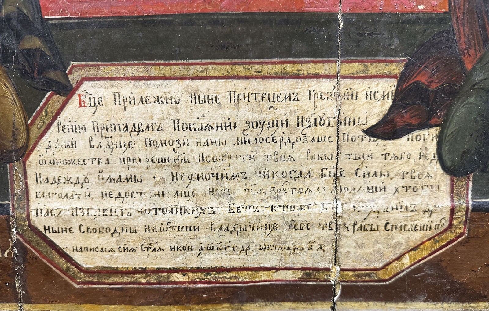 A MONUMENTAL DATED ICON SHOWING THE MOTHER OF GOD OF THE KIEV CAVES FROM A CHURCH ICONOSTASIS Russian, dated 1823 Tempera on gessoed wood panel with kovcheg. The haloes made of silver, covered by a golden lacquer. Vertical crack, paint losses, restorations. 111 x 88 cm.