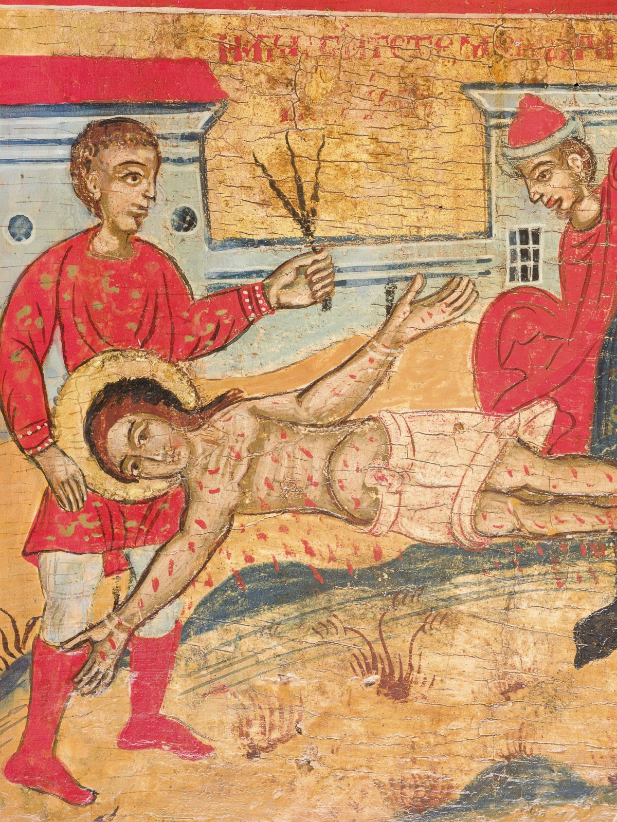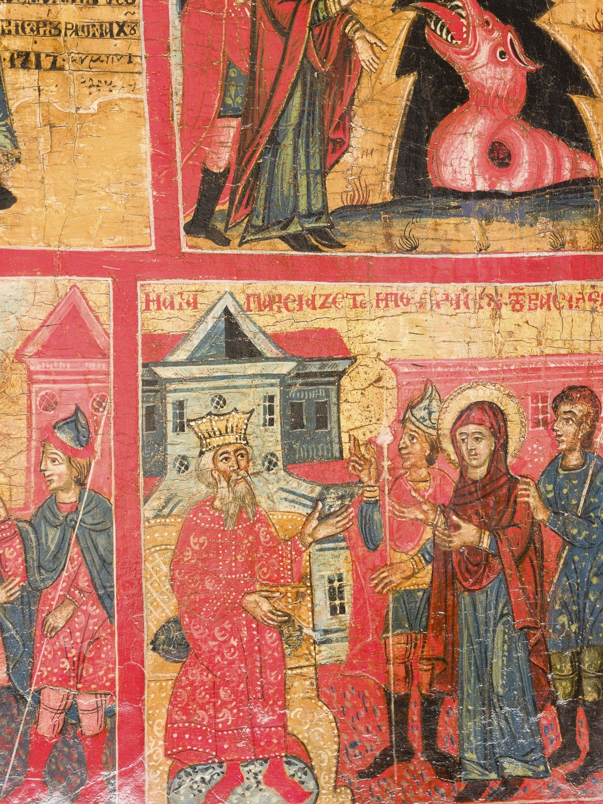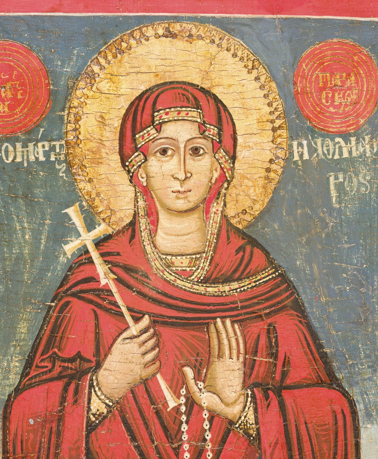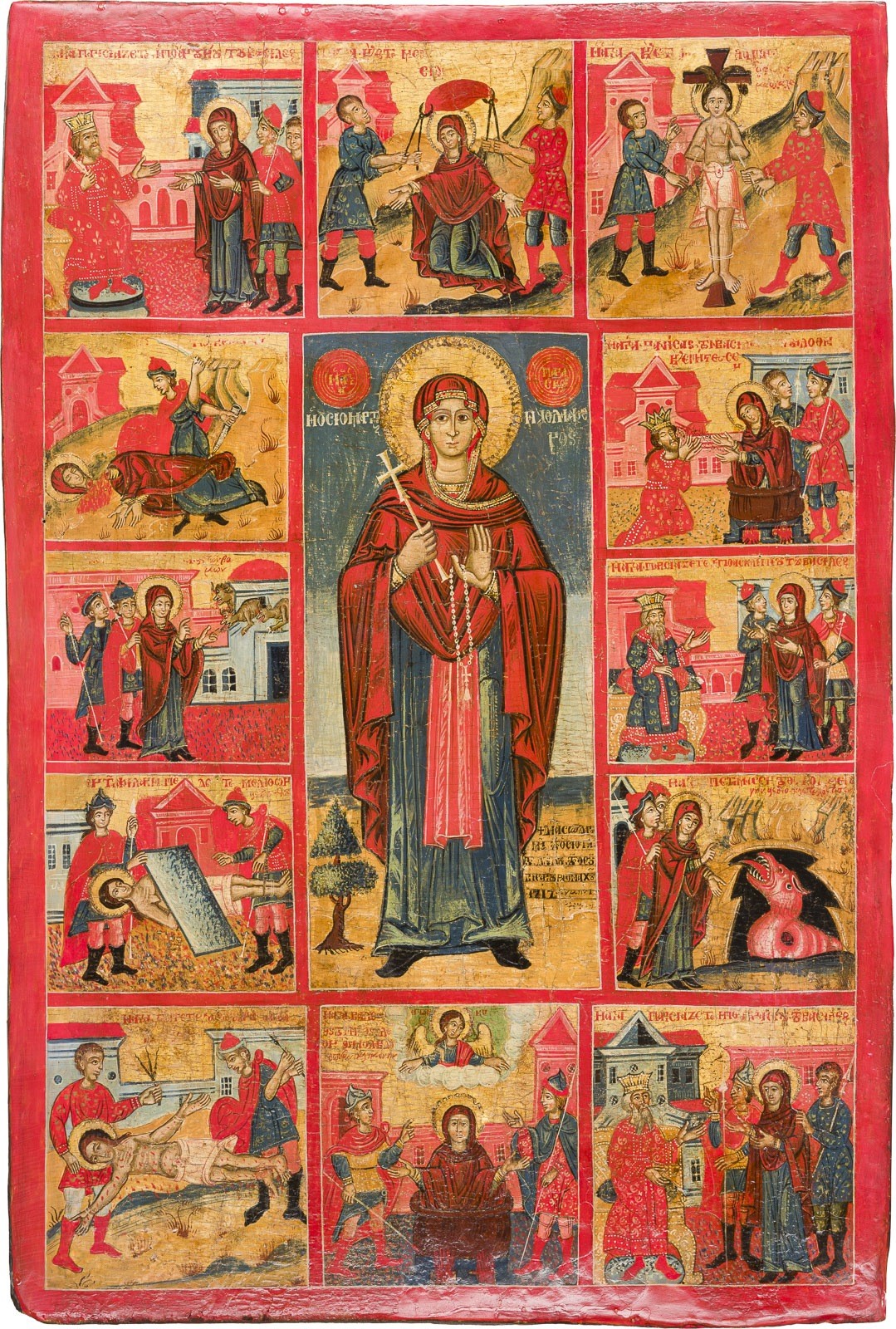 A MONUMENTAL DATED VITA ICON OF ST. PARASKEVA Greek, dated 1717 Tempera on wood panel. Finely painted in great detail and bright colours on a gold ground. St. Paraskeva, depicted frontally and full-length, surrounded by twelve scenes illustrating events from her life and martyrdom. Signed in Greek and dated in the central image. Partially restored. 79 x 53 cm.