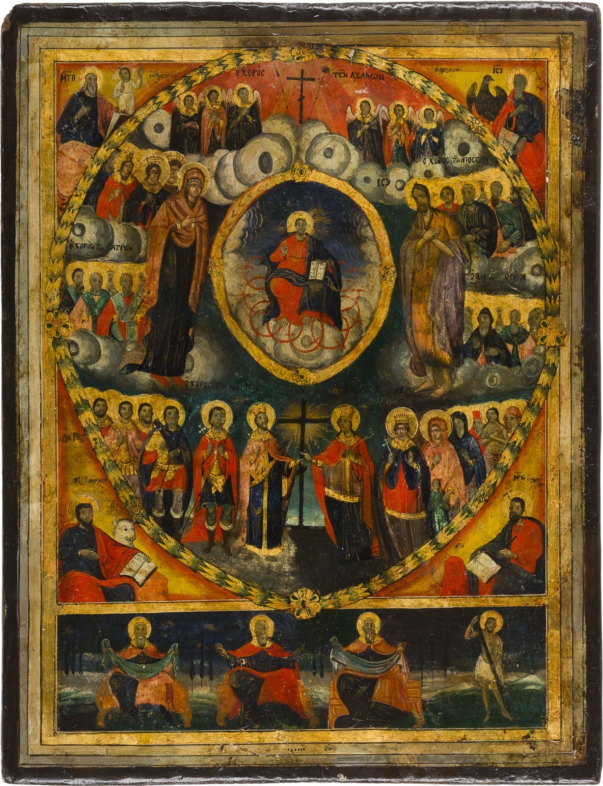 A MONUMENTAL ICON 'ALL SAINTS' Greek, 18th century Tempera on wood panel. The haloes and borders made of gold. The Orthodox saints portrayed according to their ranking in registers, with the Mother of Godand St. John the Forerunner in the pose or prayer interceding between them and Christ, the latter represented enthroned in a circular and radiating glory above, painted with saturated colours and gold. Minimally restored. 64 x 49 cm.