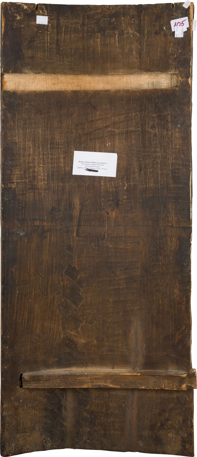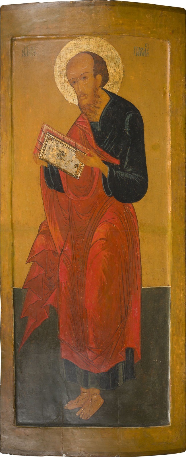 A MONUMENTAL ICON SHOWING THE APOSTLE PAUL FROM A CHURCH ICONOSTASIS Russian, late 17th century Tempera on wood panel with kovcheg. The halo made of gold. Horizontal cut restored, areas of retouching, the edges minimally chipped. 108 x 45.5 cm.