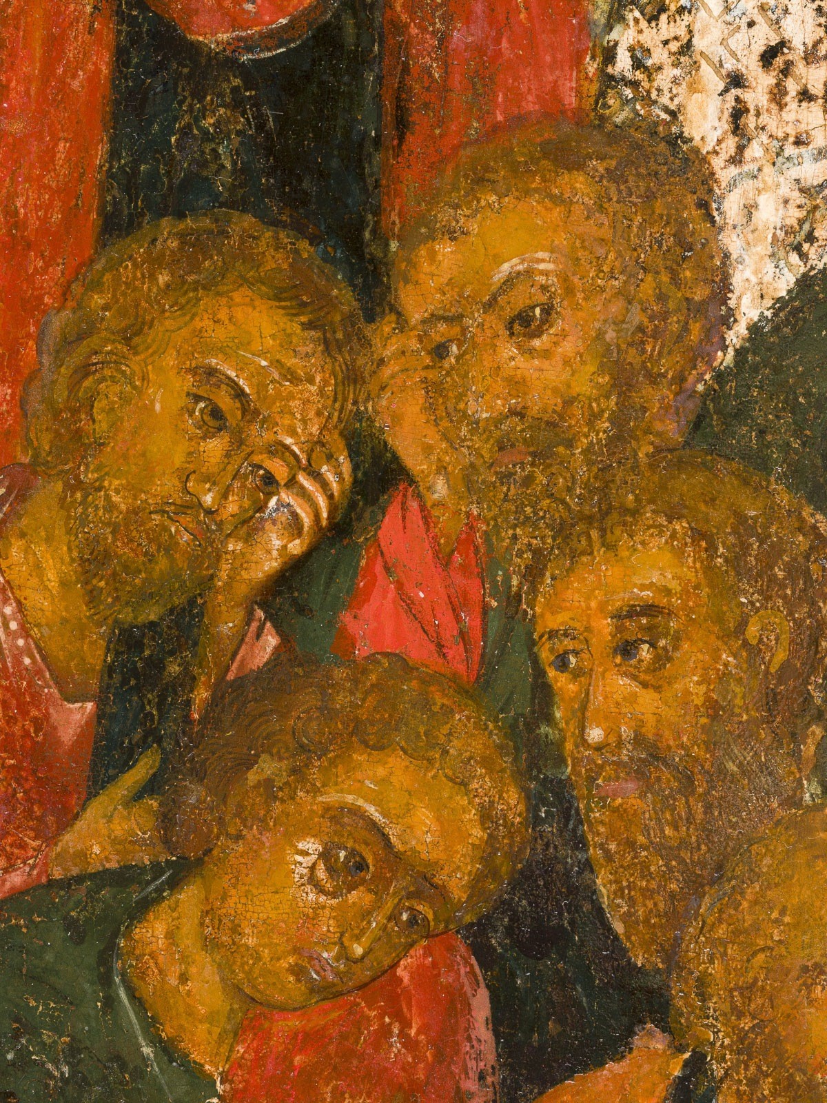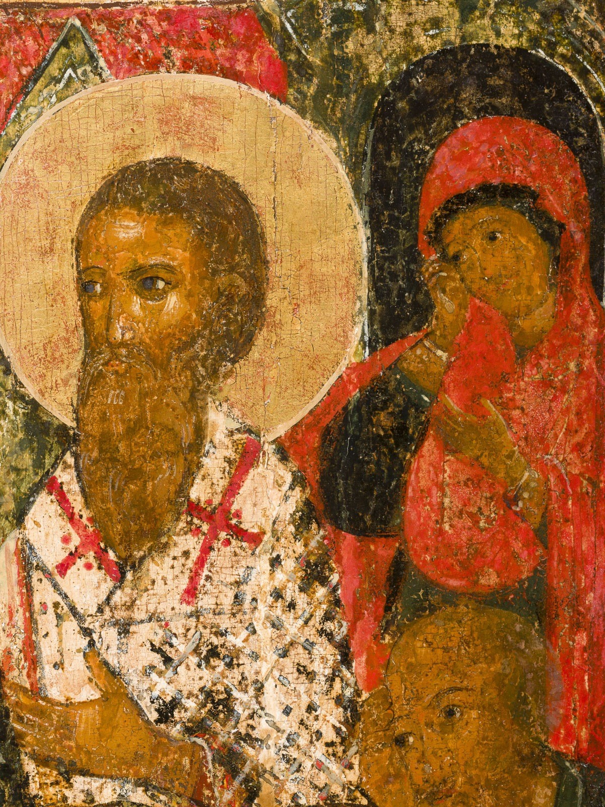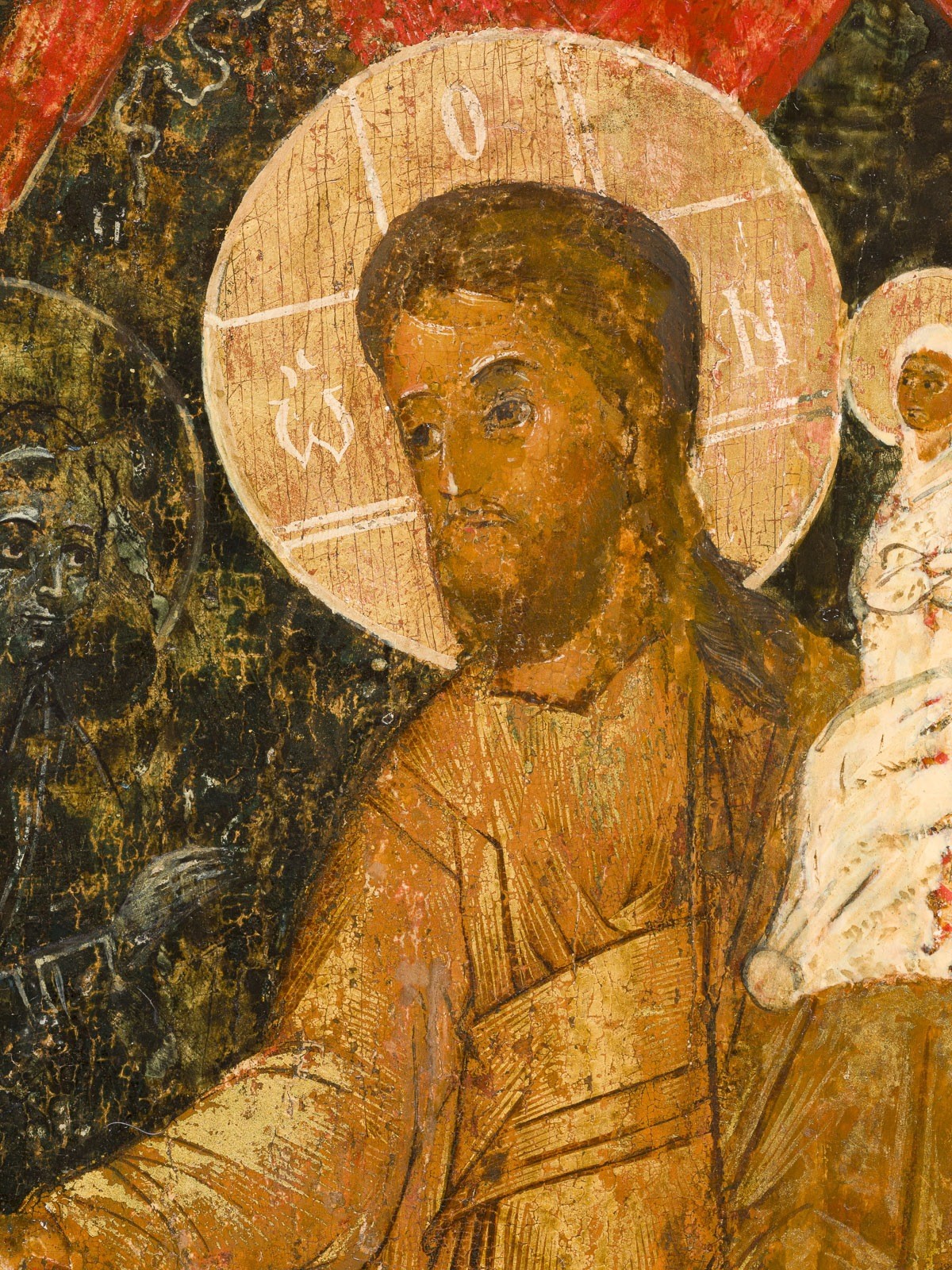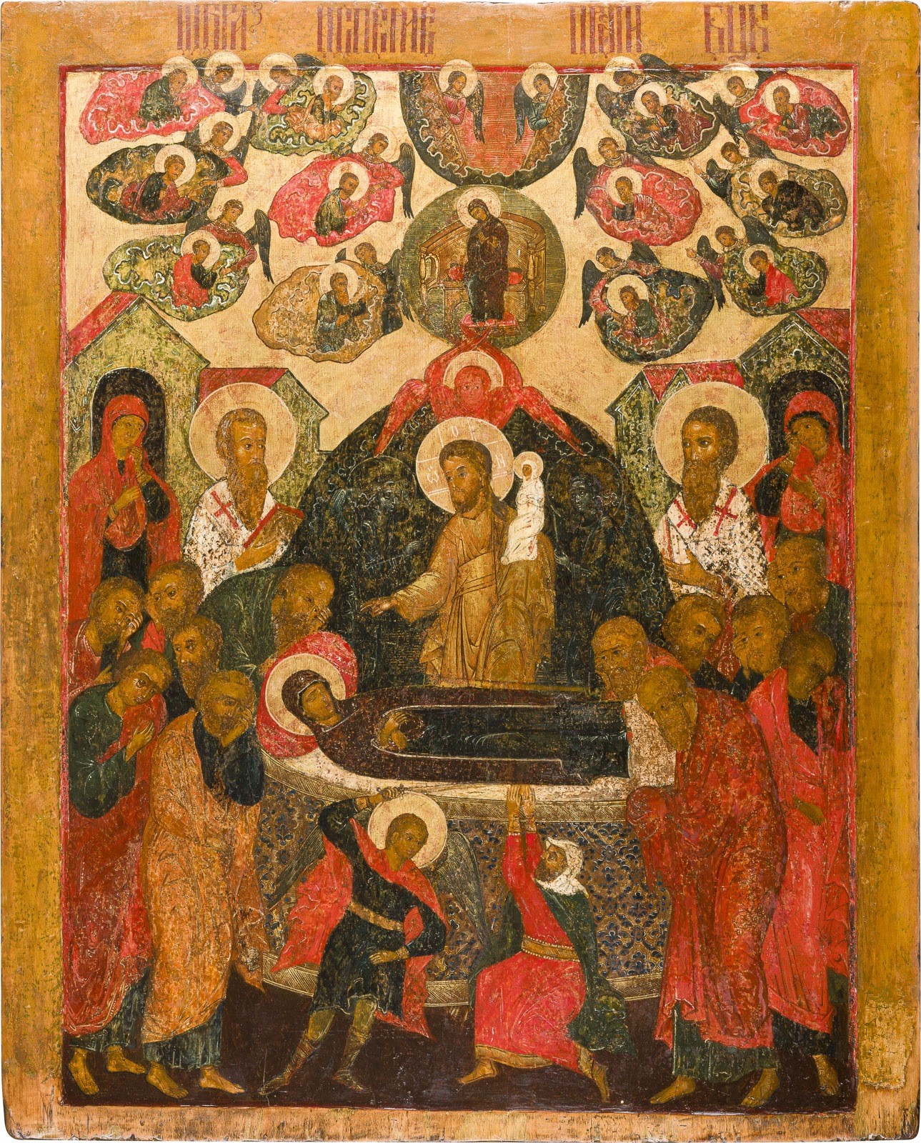 A MONUMENTAL ICON SHOWING THE DORMITION OF THE MOTHER OF GOD FROM A CHURCH ICONOSTASIS Russian, 17th century Egg tempera on wood panel with kovcheg. The Dormition depicts the death of the Mother of God. Tradition relates that when her death grew near, angels brought the apostles from different parts of the world. Christ is shown at center within a mandorla receiving His mother's soul, represented as an infant wrapped in swaddling clothes. Above them a red six-winged seraph. The apostles stand around her. Below a fanatical Jewish priest (sometimes named Iefoniya or Athonios) stands before the bier. Attempting to push it over, he has his hands cut off by a sword-wielding angel. In the heavenly realm the Assumption of the Mother of God, she seated on a throne with her hands extended in supplication, the Apostles on clouds, each accompanied by his guardian angel occupy the upper part of the composition. The saturated colours of the figures standing out against the pastel shades of the constructions in the background. Restored. 99 x 80 cm.