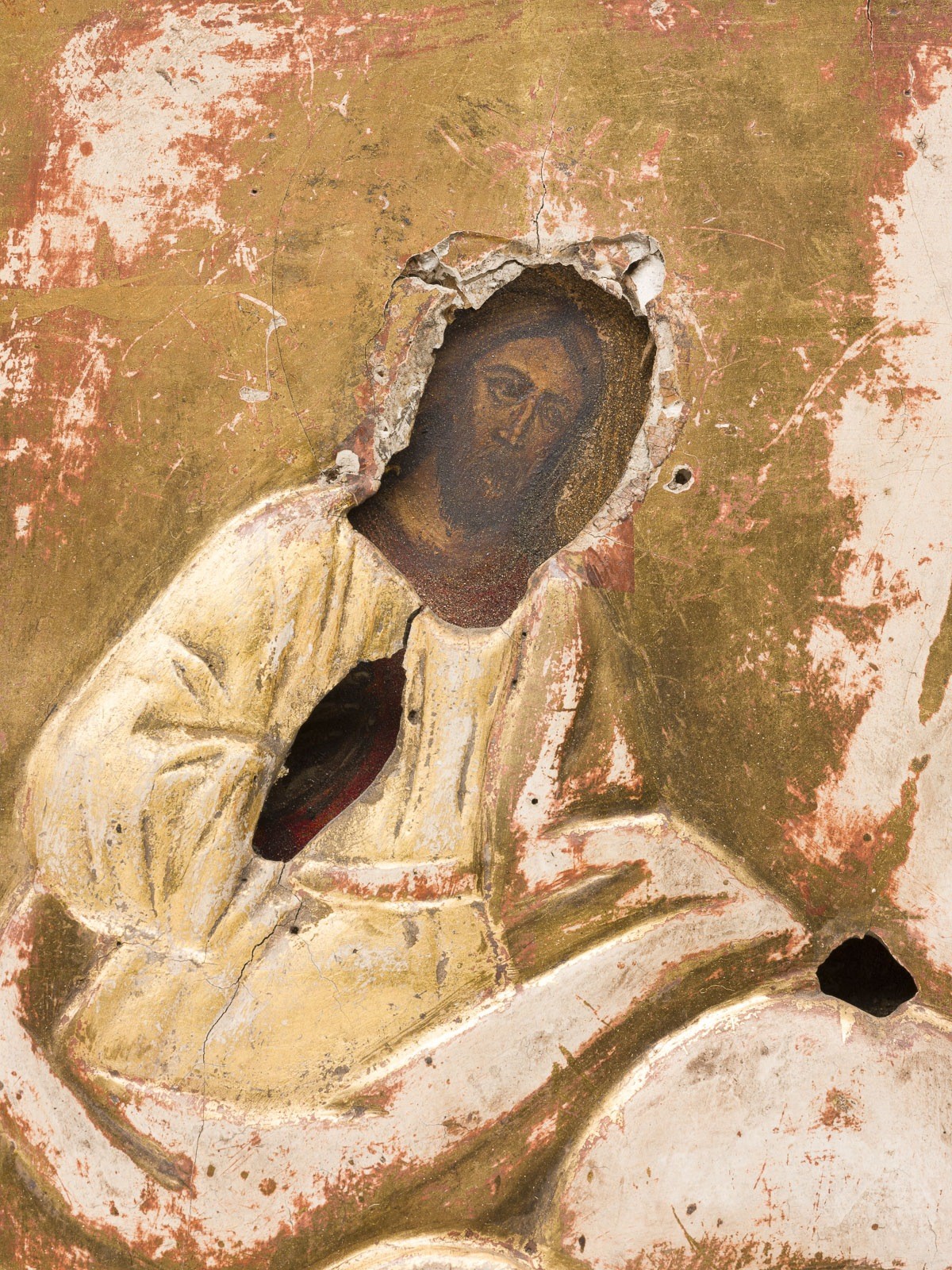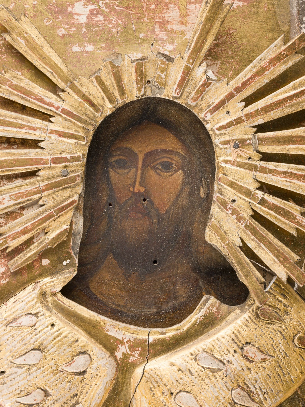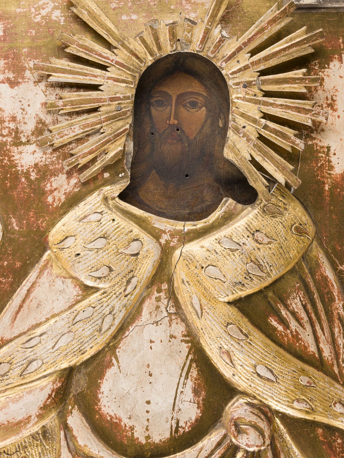 A MONUMENTAL ICON SHOWING ST. ALEXANDER NEVSKY WITH A STUCCO OKLAD Russian, circa 1800 Tempera on wood panel. Overlaid with a gilded stucco oklad. Minor damages to the edges, partially restored. 69.5 x 46.5 cm.