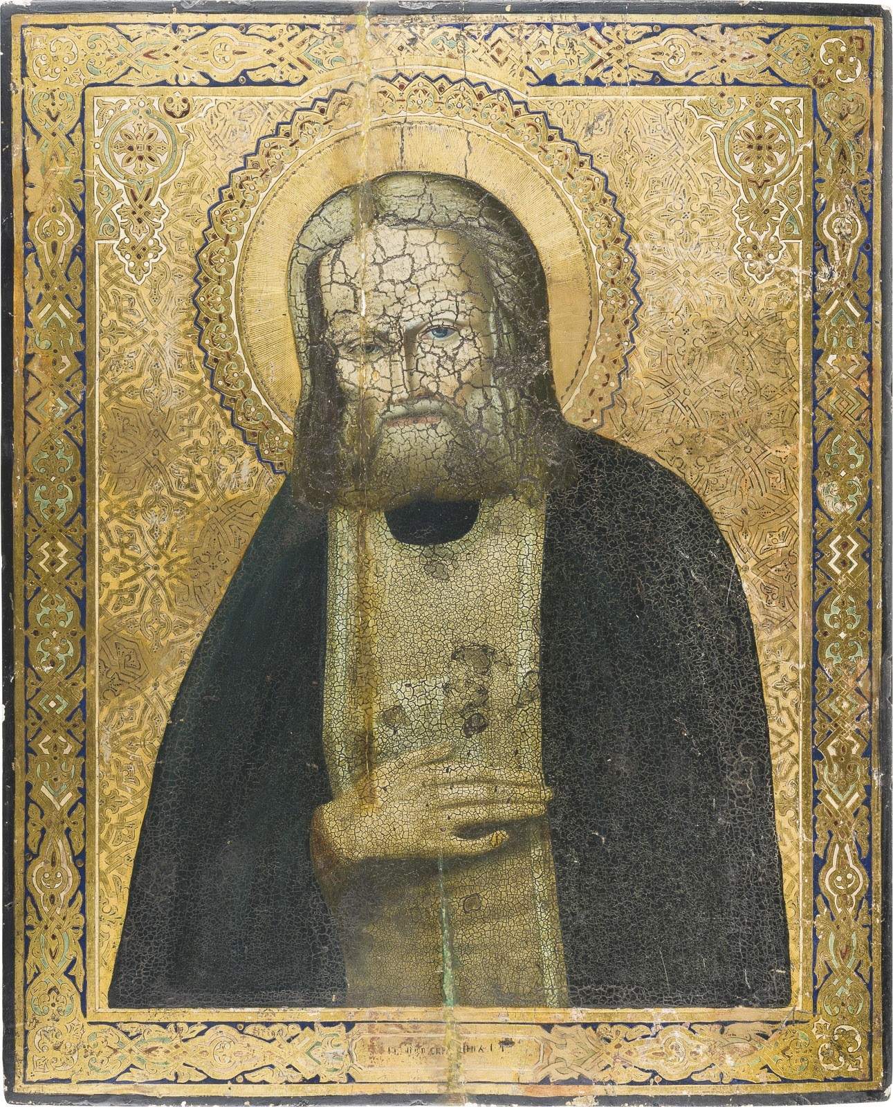 A MONUMENTAL ICON SHOWING ST. SERAPHIM OF SAROV Russian, after 1903 Oil on wood panel. The background ornately incised and the border painted in faux enameling. Vertical crack restored, areas of retouching. 71 x 58 cm.