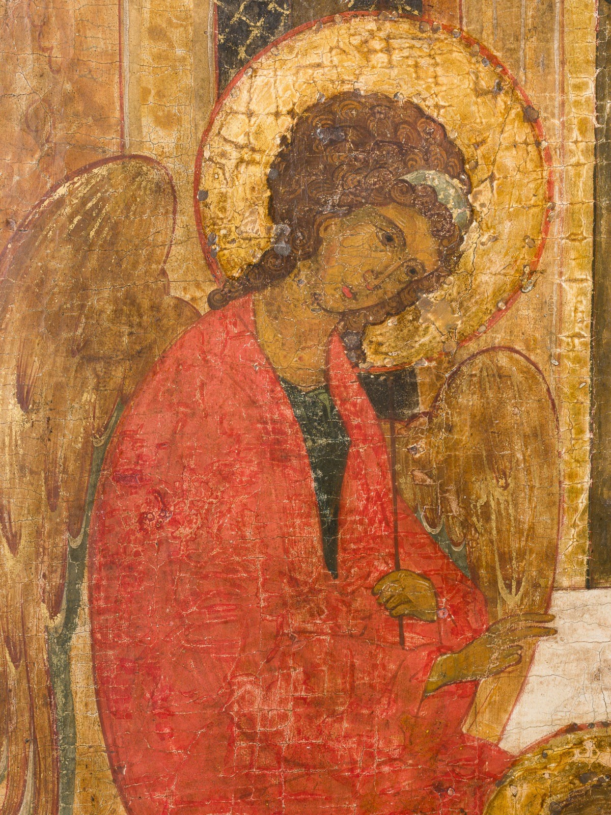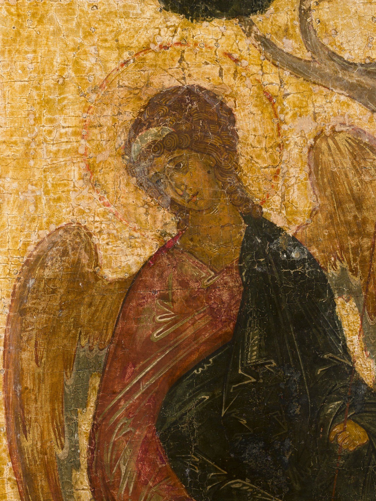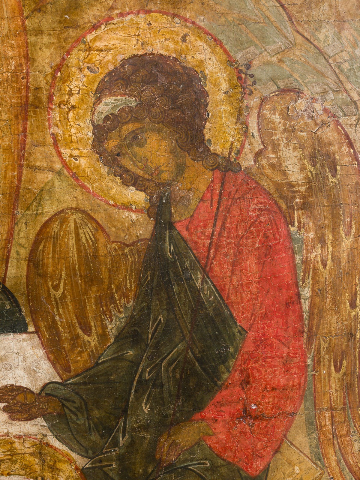 A MONUMENTAL ICON SHOWING THE OLD TESTAMENT TRINITY 20th century (in the style of the 16th century) Tempera on wood panel with kovcheg. Painted on gold ground. Partially restored. 95 x 80.3 cm.
