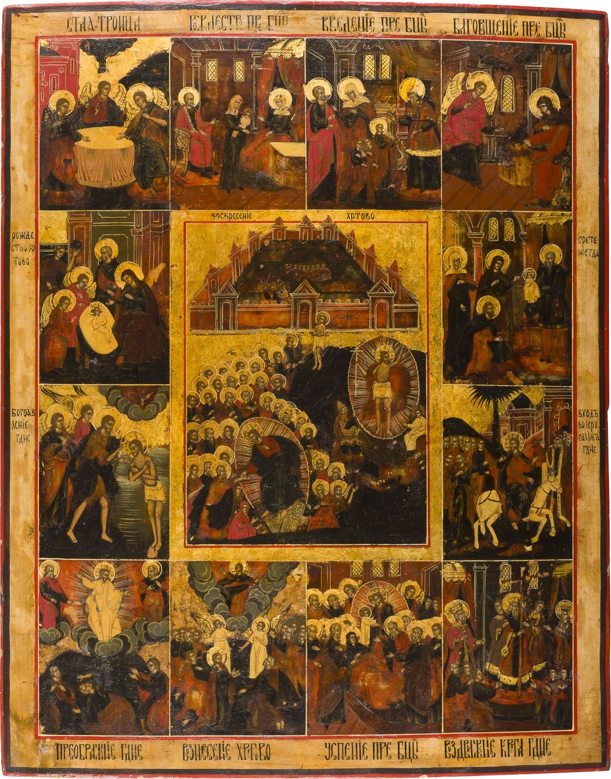 A MONUMENTAL ICON OF THE DESCENT INTO HELL AND THE RESURRECTION OF CHRIST SURROUNDED BY THE MAJOR LITURGICAL FEASTS Russian, 18th century Tempera on wood panel. The haloes and background made of gold. Partially restored. 68 x 53.2 cm.
