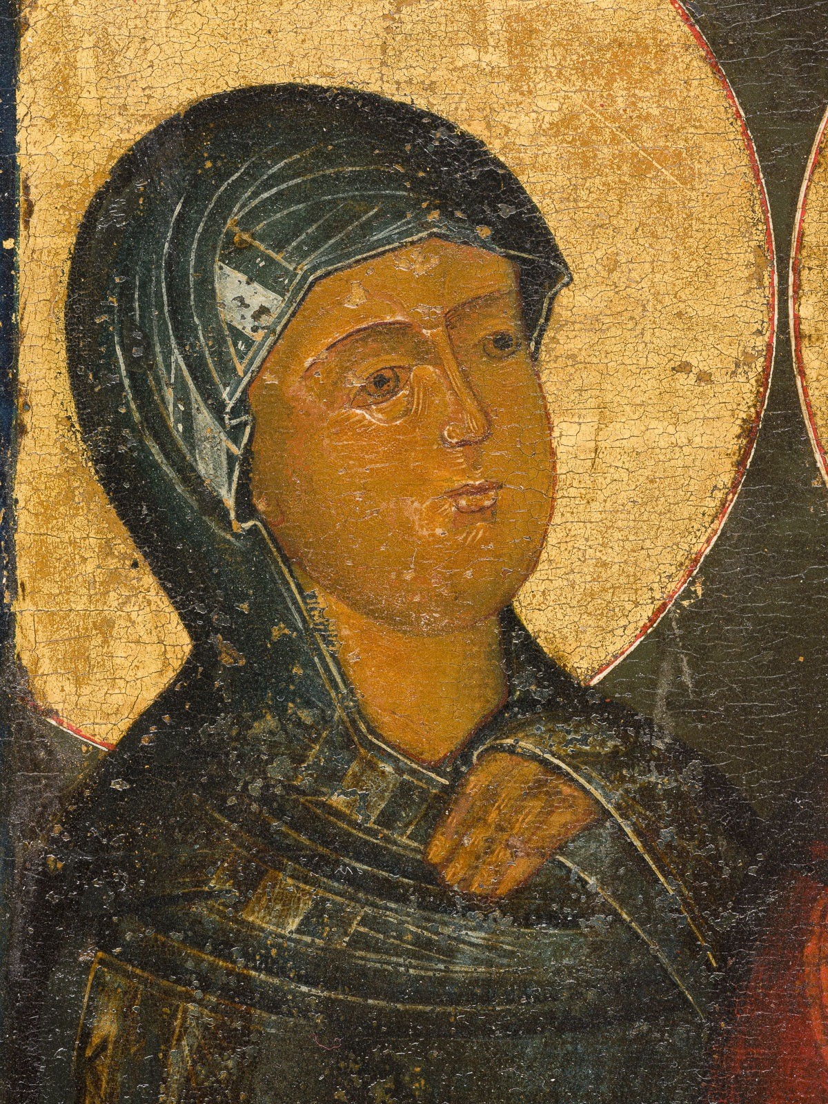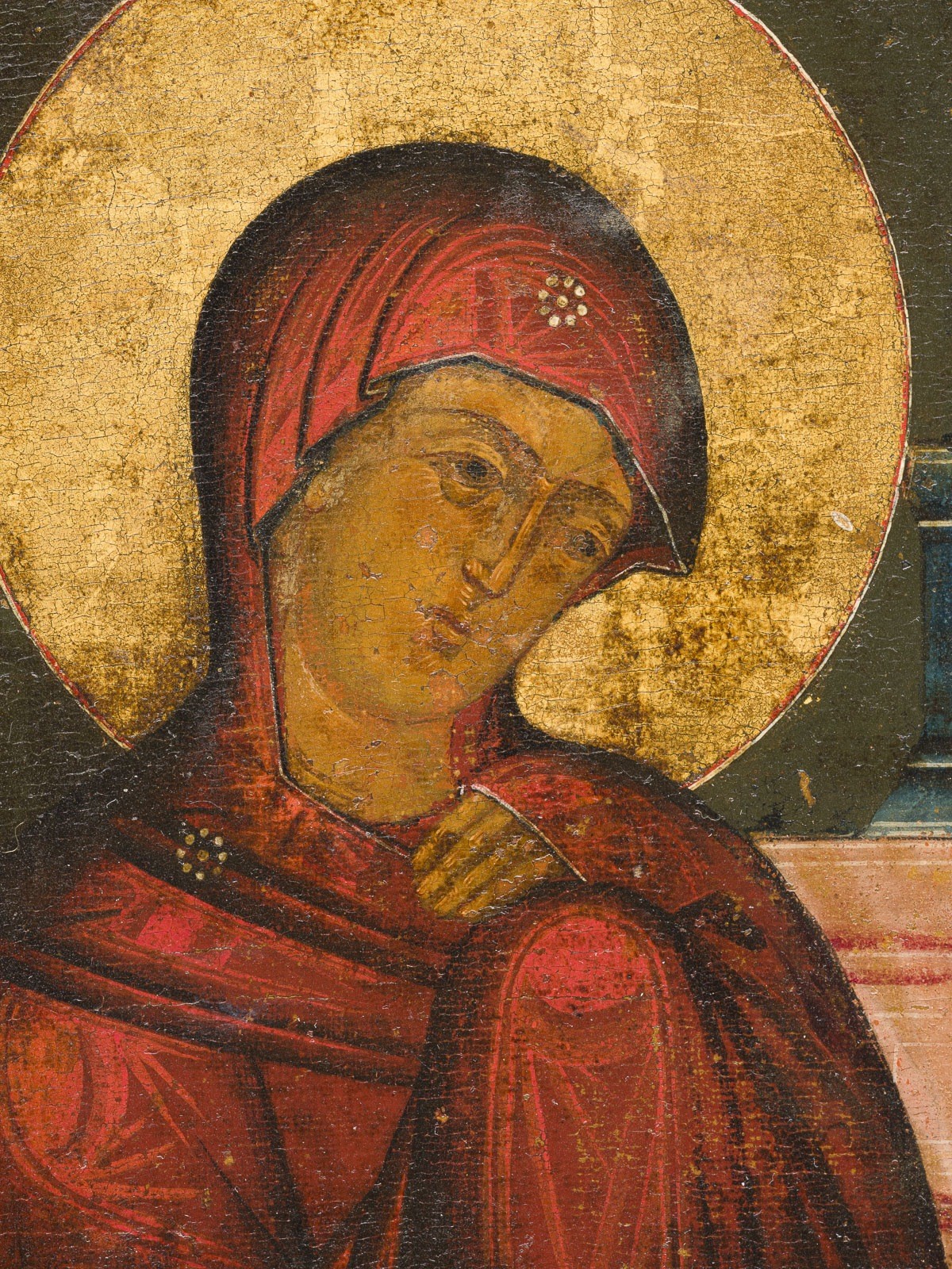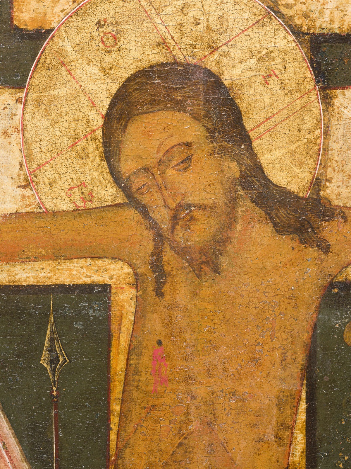 A MONUMENTAL ICON SHOWING THE CRUCIFIXION OF CHRIST FROM A CHURCH ICONOSTASIS Russian, 18th century Tempera on wood panel with kovcheg. The haloes made of gold. Partially restored. 99.4 x 78 cm.