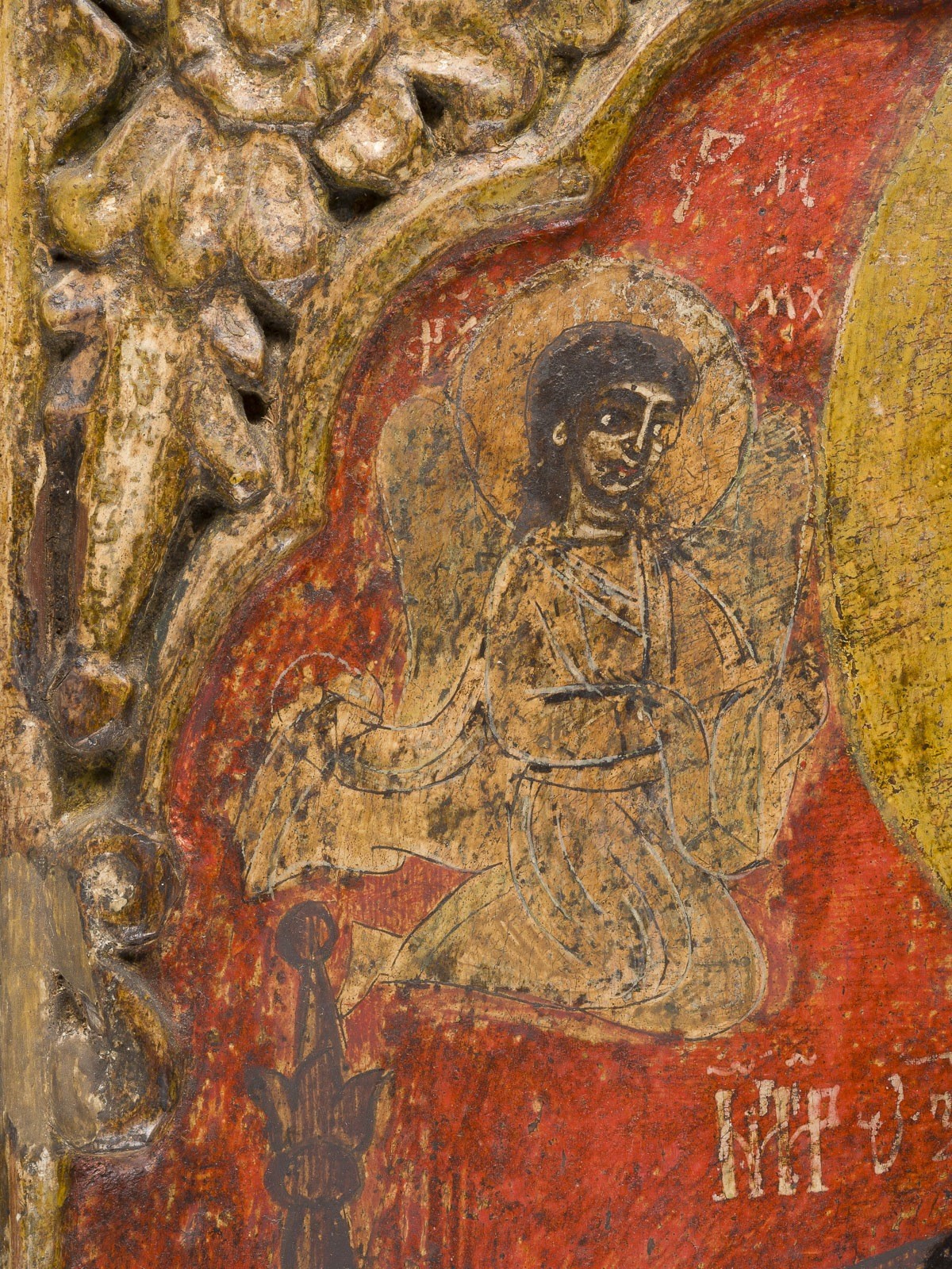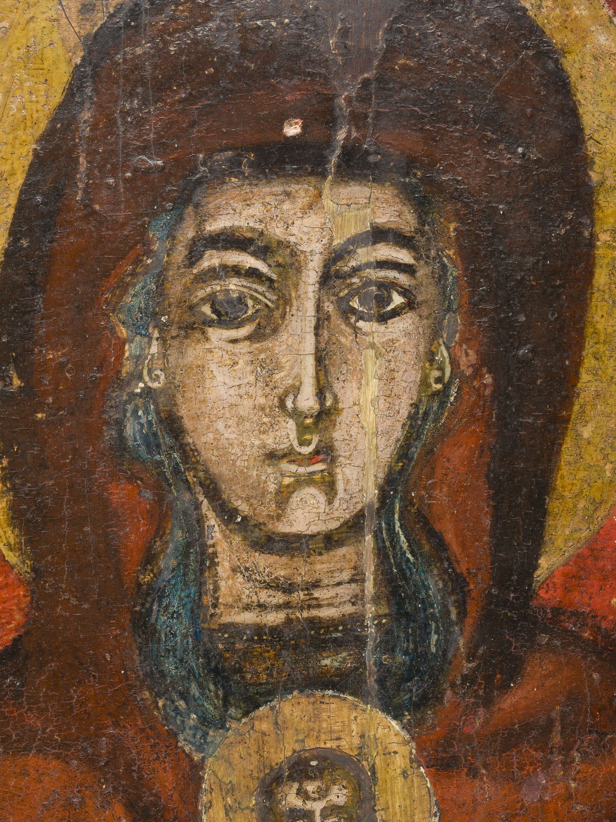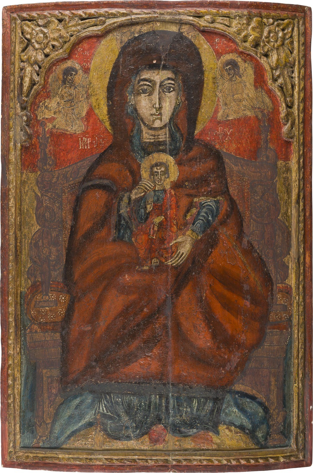 A MONUMENTAL ICON SHOWING THE ENTHRONED MOTHER OF GOD FROM A CHURCH ICONOSTASIS Greek, 16th/17th century Tempera on wood panel. With carved and gilded border. Vertical crackrestored, areas of restoration. 73 x 49.8 cm.