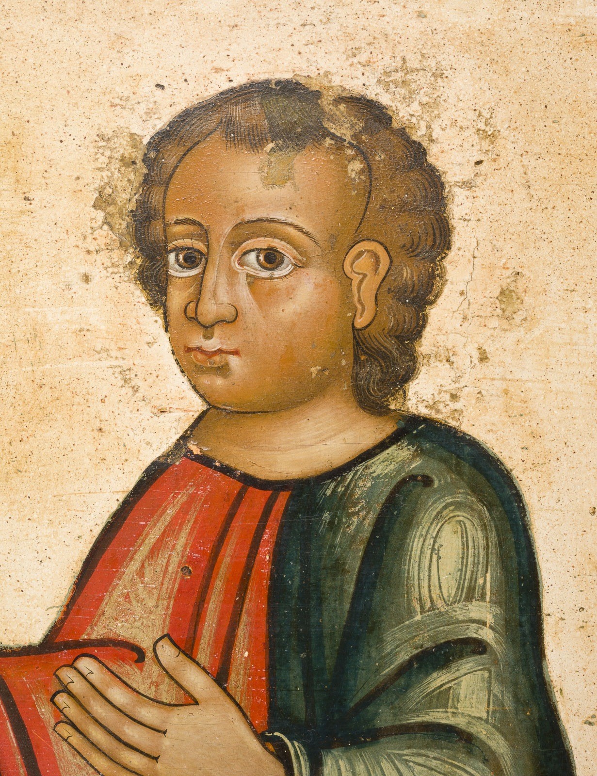 A LARGE ICON SHOWING A PROPHET FROM A CHURCH ICONOSTASIS Russian, circa 1700 Tempera on wood panel. The background and the border stripped to the levkas. Minor paint losses, minimally restored. 91.5 x 38.2 cm.