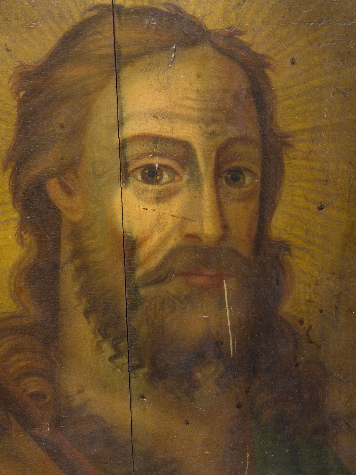 A MONUMENTAL ICON SHOWING ST. JOHN THE FORERUNNER FROM A CHURCH ICONOSTASIS Balkans, early 19th century Oil on wood panel. Vertical crack, minor damages to the edges. 76.6 x 54 cm.