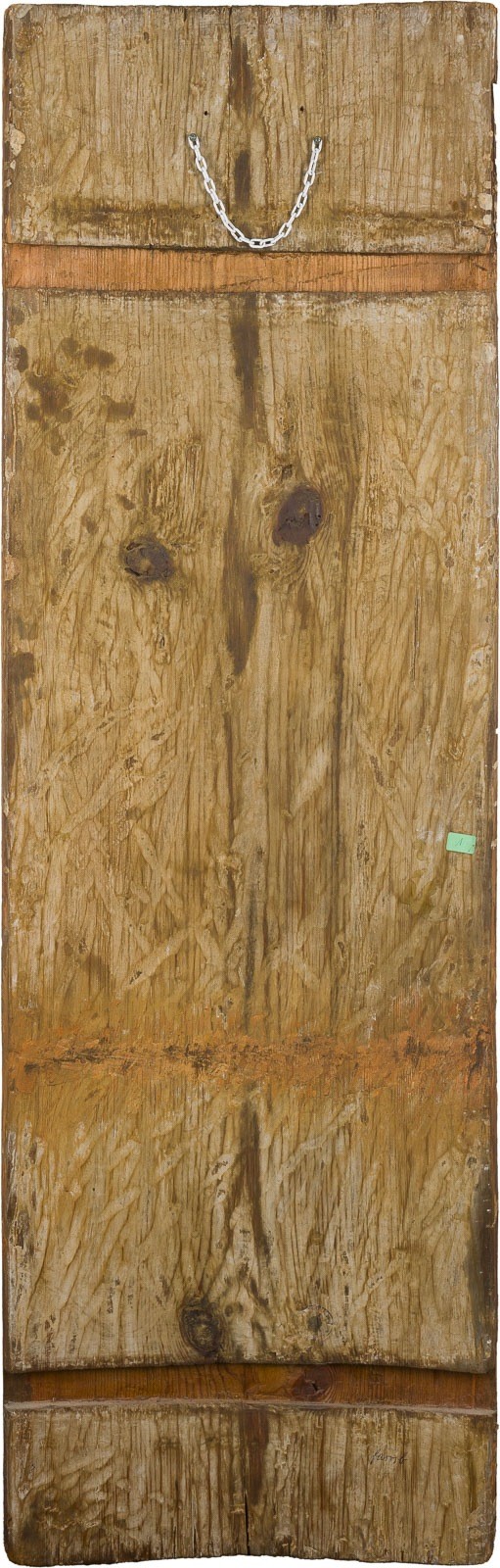 A MONUMENTAL ICON SHOWING KING DAVID FROM A CHURCH ICONOSTASIS Russian, early 17th century Tempera on wood panel with kovcheg. His crown made of silver and gold emulating pearl decoration. The facial features accentuated with delicate white brushstrokes, the vestments with saturated colours. The background and border stripped to gesso, horizontal cut restored. 109 x 34.5 cm.