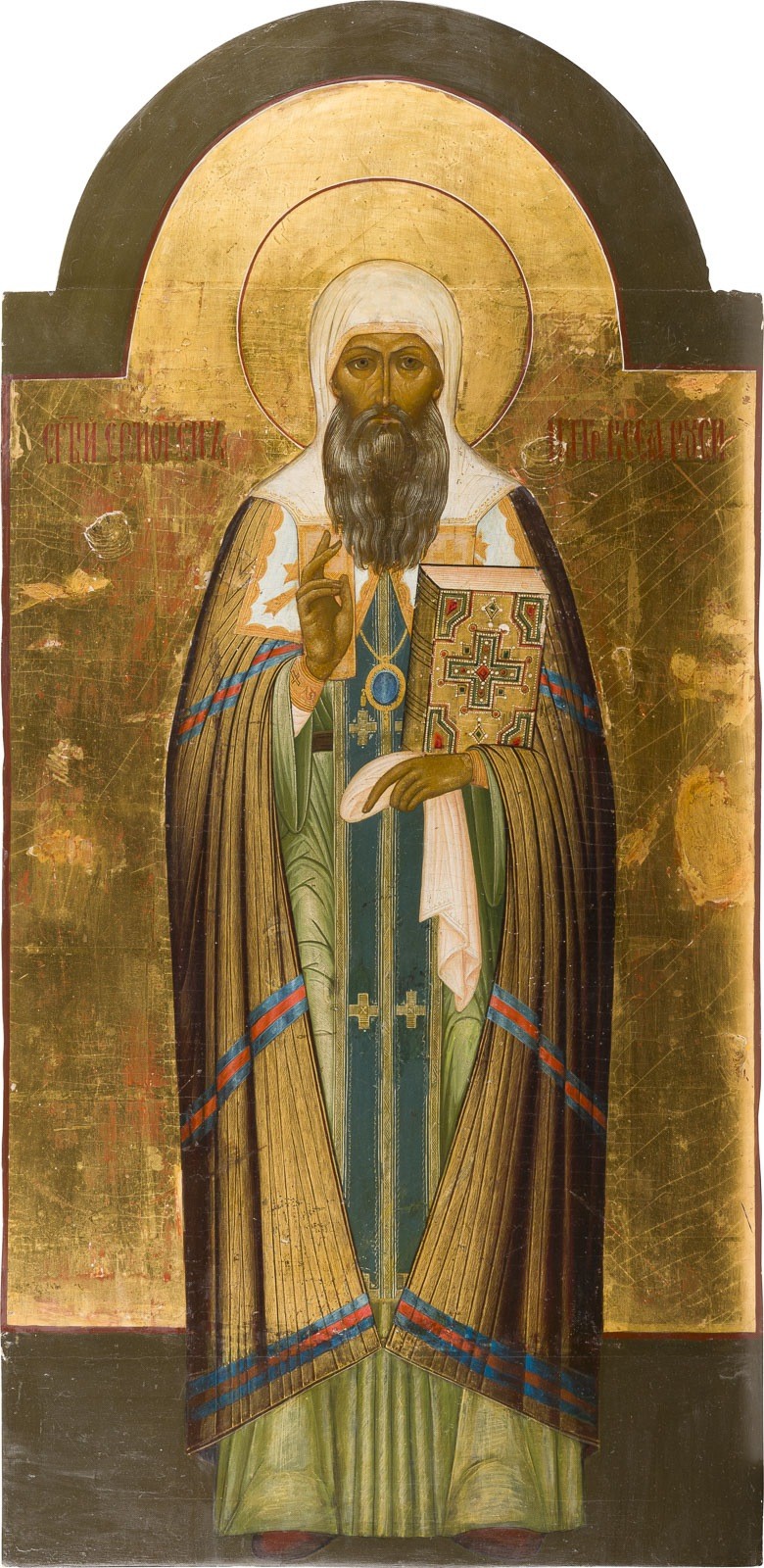 A MONUMENTAL ICON SHOWING THE PATRIARCH GERMOGEN Russian, probably Moscow, 1913 Tempera on wood panel. Finely executed in great details. Of arch form. Saint Ermogen Patriarch of Moscow traditionally painted on a shiny golden ground with olive green borders. Portrayed frontal, full-length, blessing and bearing the Gospelbook, the saint dressed in full Patriarchal attire, including the sakkos with cruciform decoration. Minimally worn and restored. 96.5 x 47 cm. The body of the hieromartyr Hermogenes was buried in the Chudov monastery, but in 1654 was transferred to the Moscow Dormition cathedral. The purported relics of Patriarch Germogen were accidentally found in one of the crypts of the Chudov Monastery during the 1913 repair works. In connection with the Romanov Dynasty Tercentenary, celebrated that same year, the remains were canonized and transferred to the nearby Dormition Cathedral.