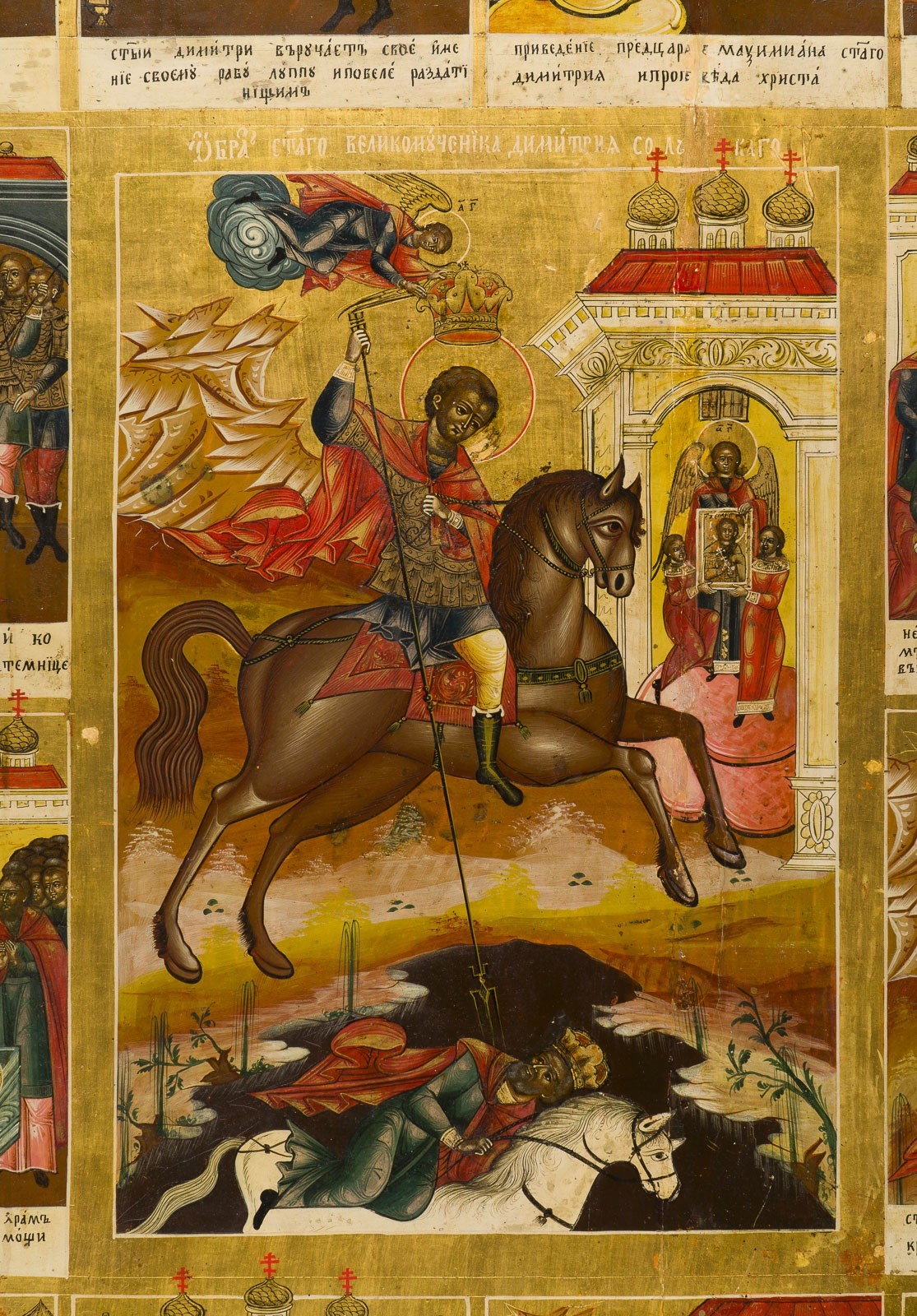 A MONUMENTAL ICON SHOWING ST. DEMETRIOS WITH TWELVE SCENES FROM HIS LIFE Russian, early 19th century Tempera on wood panel. The haloes and background made of gold. Vertical crack restored, areas of retouching. 120.5 x 86 cm.