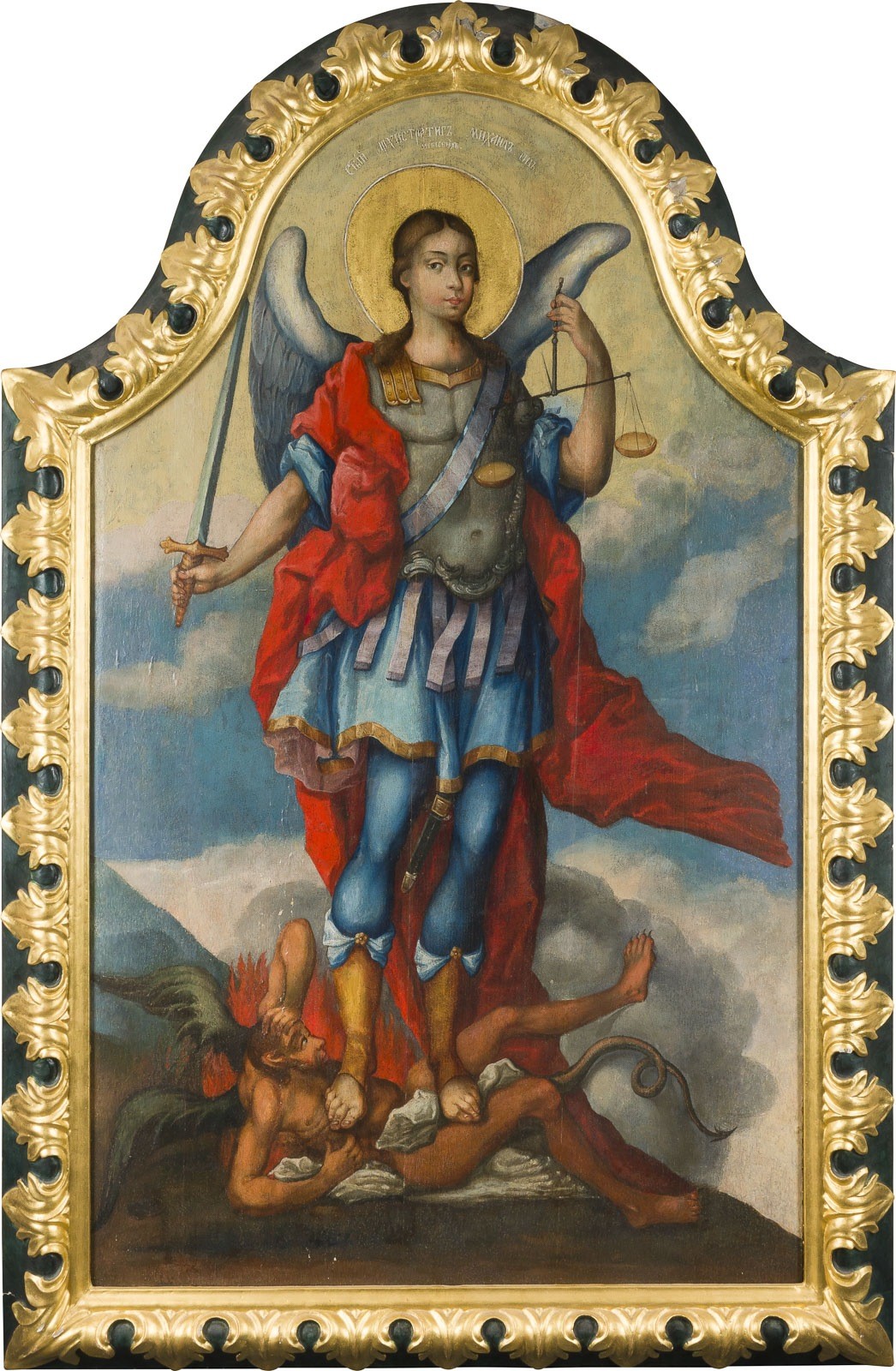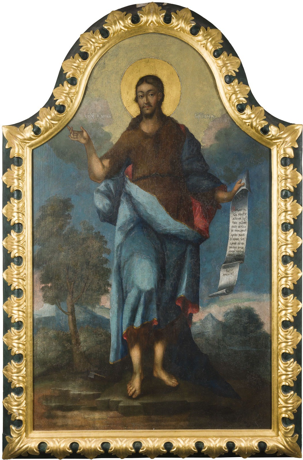 A PAIR OF MONUMENTAL ICONS FROM A CHURCH ICONOSTASIS SHOWING ST. JOHN THE FORERUNNER AND THE ARCHANGEL MICHAEL AS ANGEL OF DEATH Carpathian region, 18th century Oil on wood panels. The haloes made of gold. Areas of retouching. 124.5 x 82 cm (with frame).
