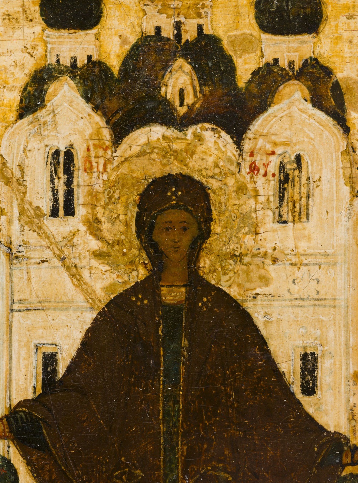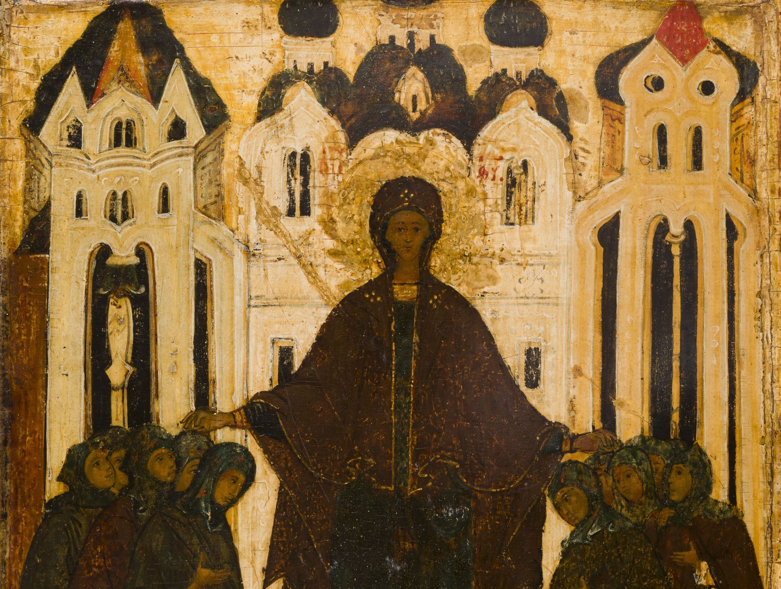 AN IMPORTANT ICON 'YOU ARE A WALL TO THE VIRGINS, O VIRGIN THEOTOKOS' Russian, Novgorod, mid-16th century Single panel with one back splint. Kovcheg, egg tempera on gesso, gold ground. The rare composition illustrates the 10th Ikos of the famous Akathist Hymn to the Mother of God, in which Mary is praised as teacher and protector of all the faithful. At the centre the Theotokos is enthroned with outstretched arms, surrounded by nuns, thereby emphasizing virginity and asceticism. The iconography goes back to Byzantine prototypes and found a particularly vivid expression in Novgorodian icon painting of the 16th century. Through the close connection of text and image, this icon is a vivid example of the liturgical and theological depth of the Orthodox pictorial tradition. Minor restorations. Minor restorations. 27.8 x 21 cm.