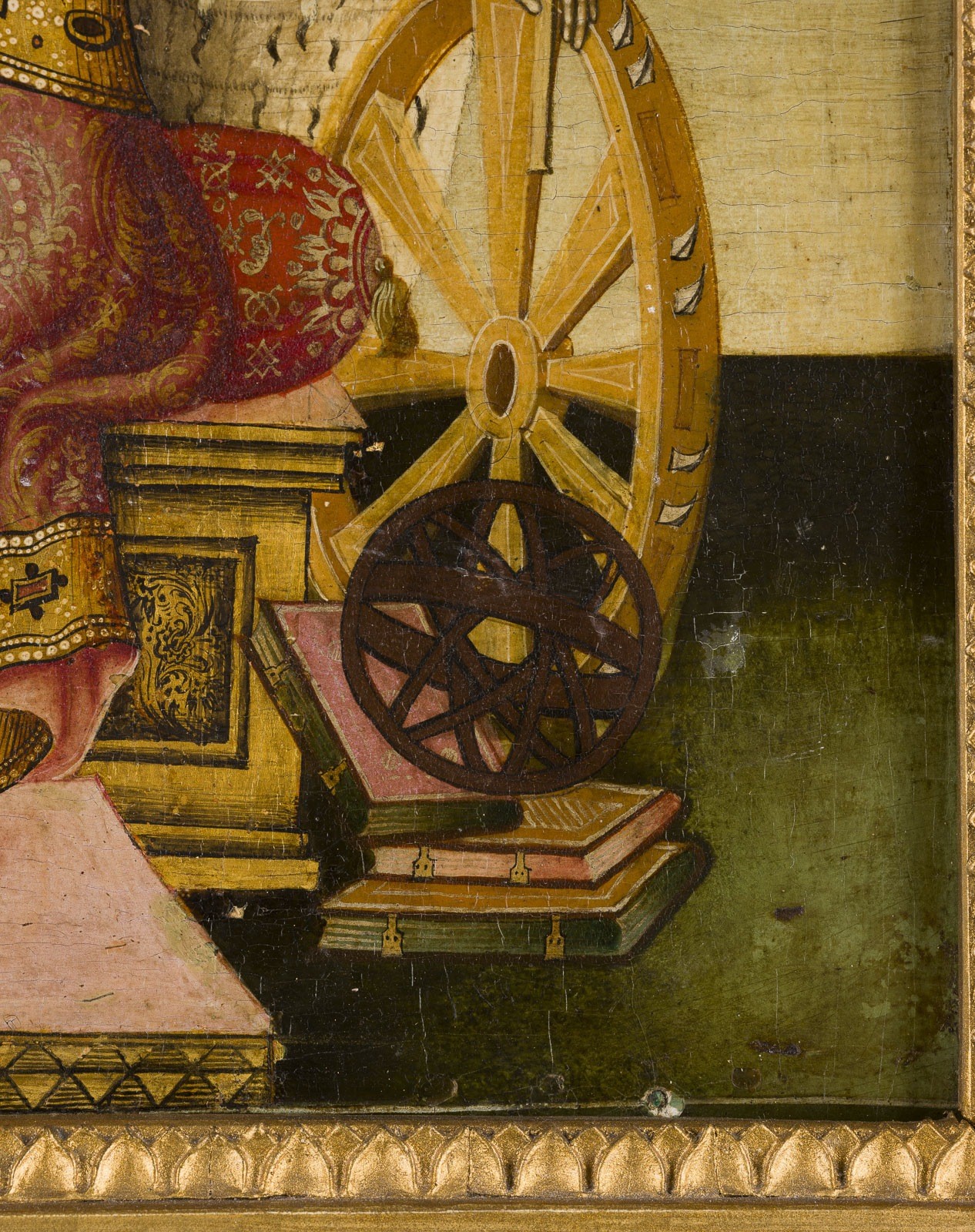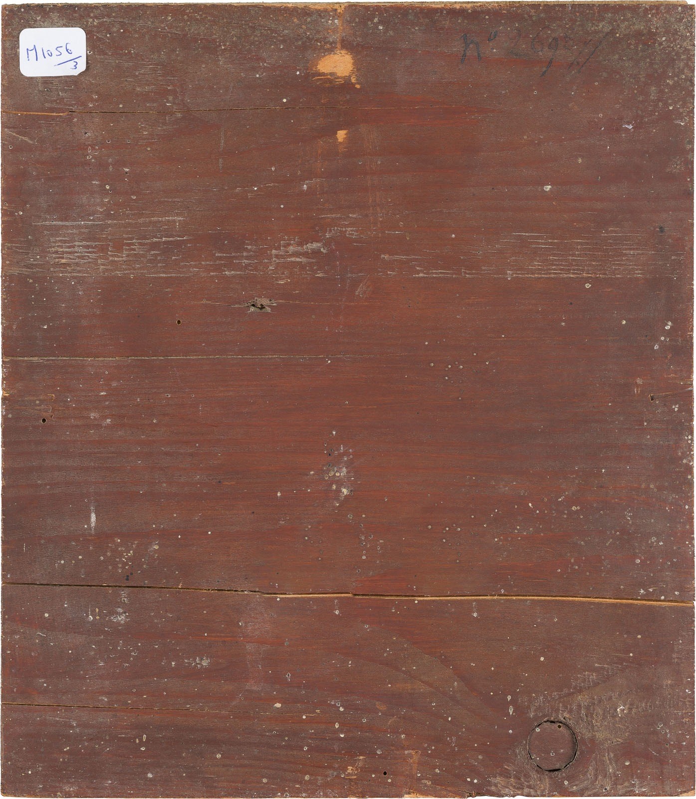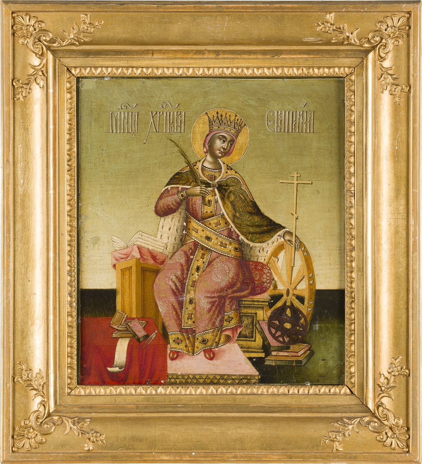 AN IMPORTANT ICON OF SAINT CATHERINE Russian, Moscow Kremlin Armoury, probably Tikhon Ivanov Filatyev, late 17th century Tempera on wood panel, later laid down on a secondary panel. Gilded halo and garment borders, with fine chrysography. 26.5 x 23 cm (excluding frame). The Saint is shown seated on a throne, holding the martyr's palm, with the wheel of her torture at her feet, a sword resting across her lap and a book in her left hand, set against a green ground. Her robes are enriched with delicate gold folds, the flesh modelled in subtle olive and brown tones with white highlights - characteristic of the masters of the Moscow Kremlin Armoury at the end of the 17th century. One of the earliest Russian examples of the so-called "Sinai-Cretan" iconography of St Catherine, created under the influence of Western European prototypes. Literature: Icons. Icon Museum Frankfurt a.M., Frankfurt 2005, cat. no. 97 (very similar). Expertise: Comes with Certificate of Authenticity from well-known icon expert V. V. Baranov.