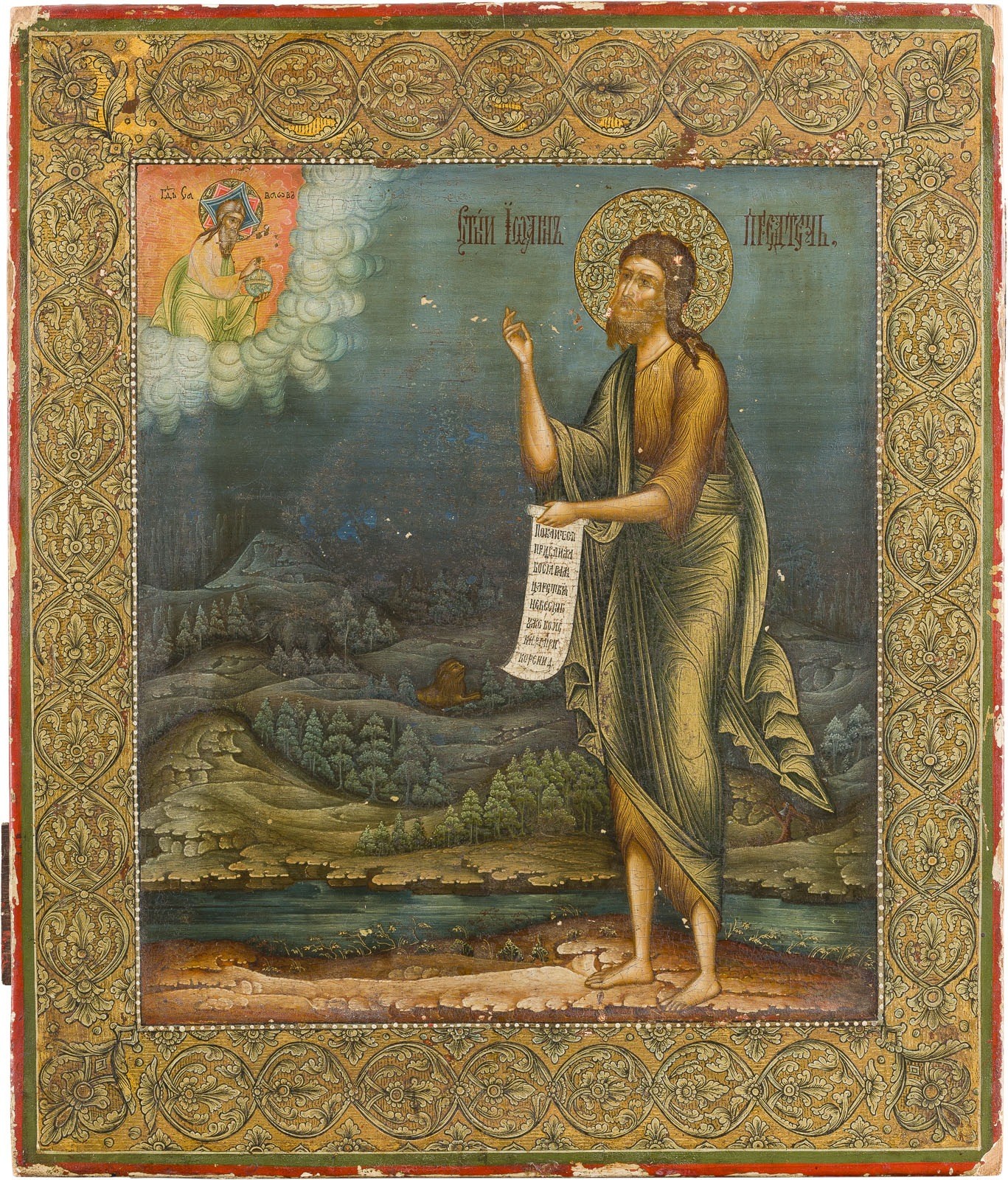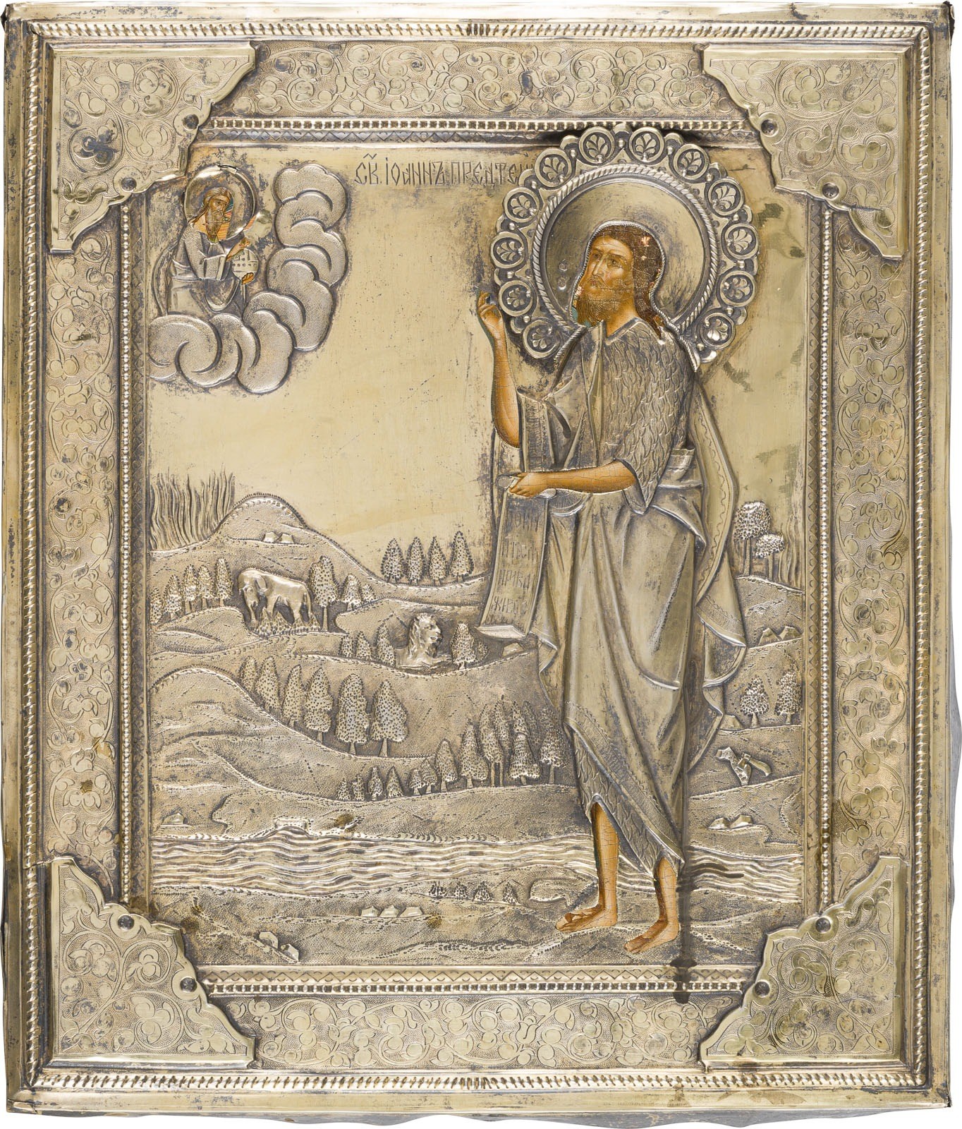 A MUSEUM-QUALITY ICON OF SAINT JOHN THE FORERUNNER IN THE WILDERNESS WITH SILVER-GILT OKLAD Russian, Moscow, attributed to Iosif Semenovich Chirkiov (icon), Russian, St. Petersburg, 1898-1903 (oklad) Tempera on wood panel with kovcheg, overlaid with a finely chased and engraved silver-gilt oklad, struck with the assayer's mark, '84' standard and master's mark 'E.A.'. Executed in extremely fine painting, with a decorative acanthus-leaf border and, in the background, a wooded river landscape with lion and elephant. Minor paint losses, oklad slightly rubbed. 31 x 26.3 cm.