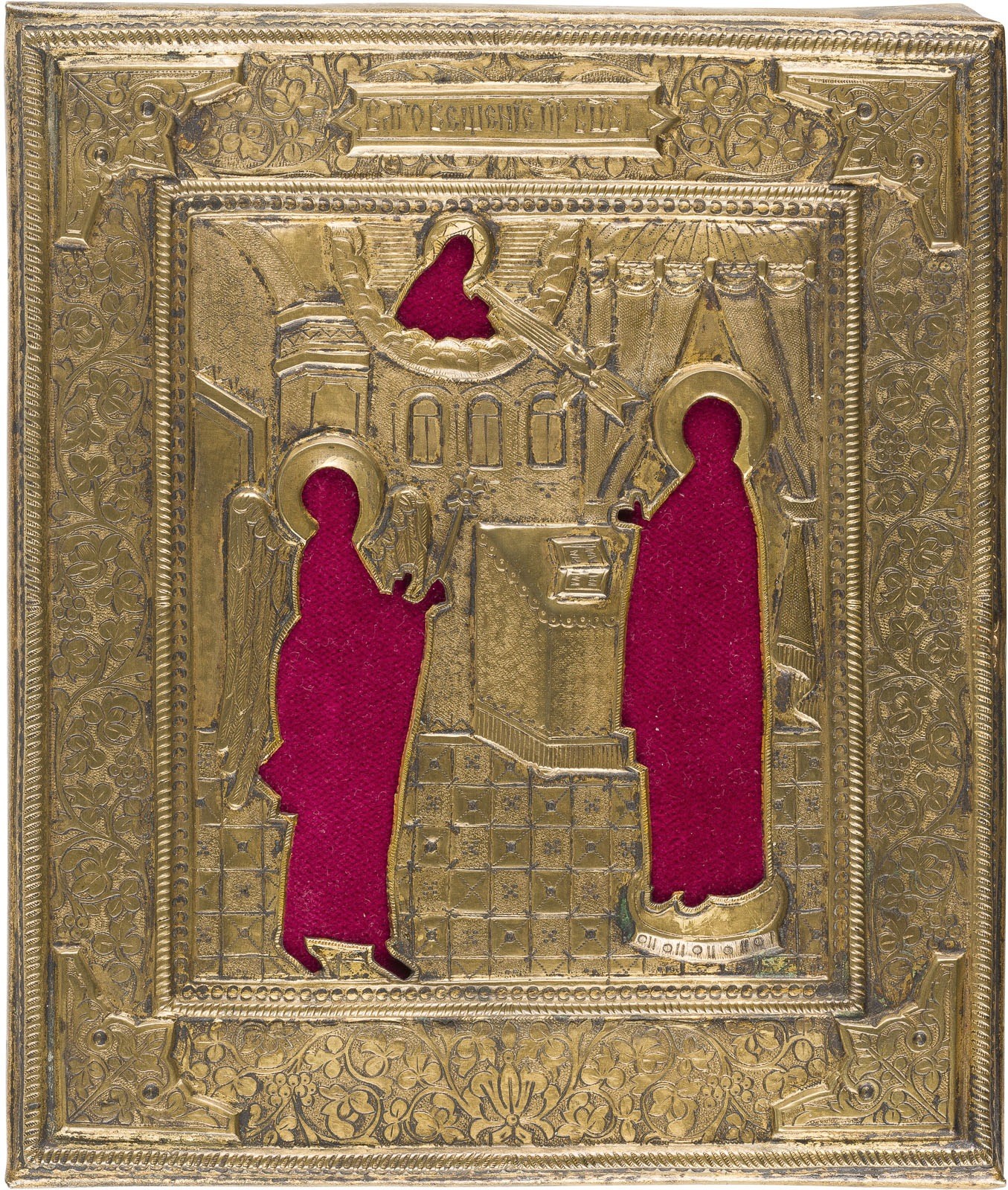 AN OKLAD OF A SMALL ICON SHOWING THE ANNUNCIATION Russian, 19th century Brass-gilded, engraved and punched with scrolling foliage. 18.2 x 15.2 cm.