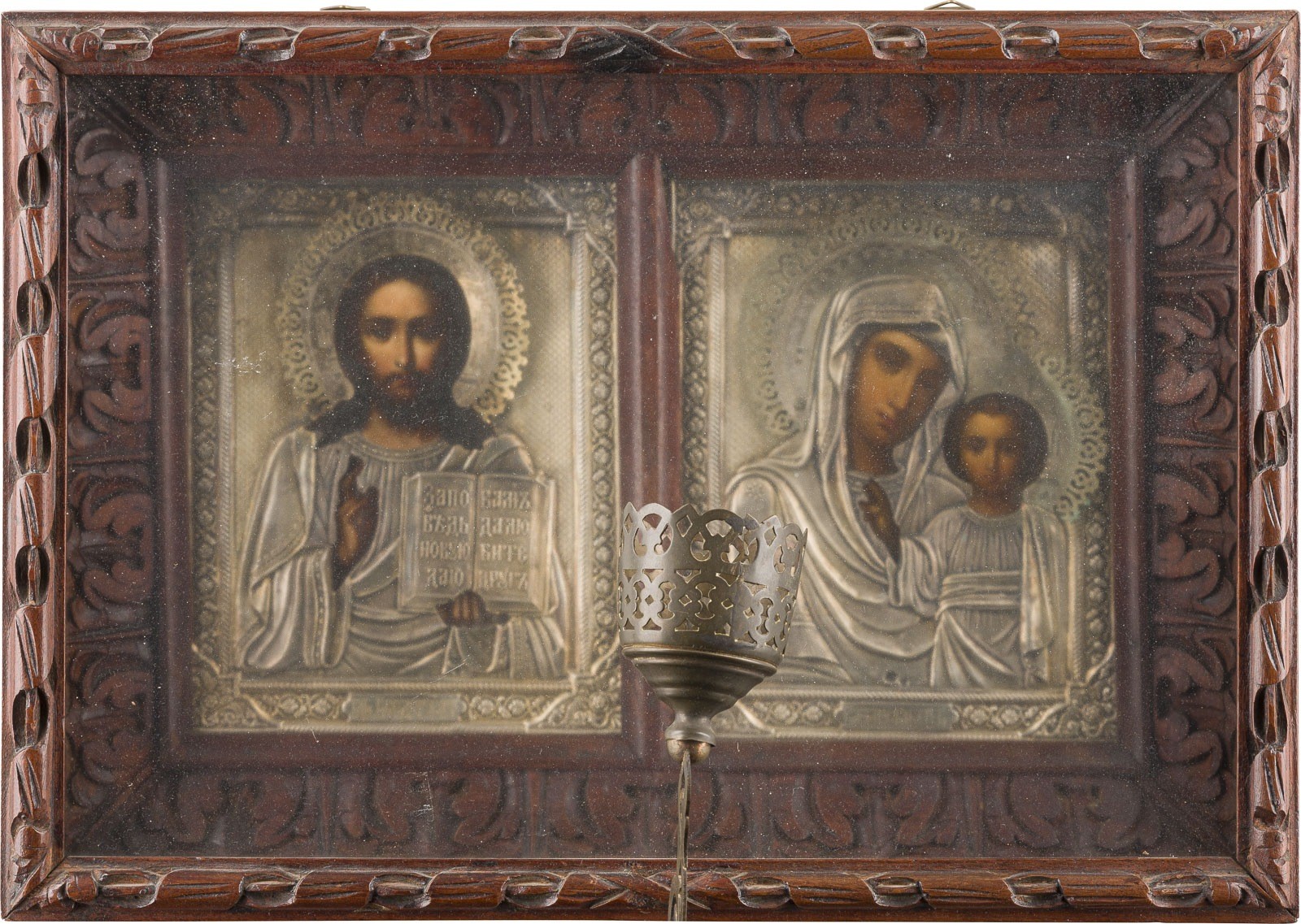 A PAIR OF WEDDING ICONS SHOWING CHRIST PANTOKRATOR AND THE KAZANSKAYA MOTHER OF GOD WITH SILVER-GILT OKLADS WITHIN KYOT Russian, circa 1900 (icons), Russian, Moscow, Semen Galkin, 1896-1908 (oklads) Oil on wood panels with velvet backing. The oklad chased and repoussé with a border of palmettes. Marked with assayer's mark, 84 standard and master's mark 'SG' in Cyrillic. 27.5 x 39.3 cm (with glazed kyot).