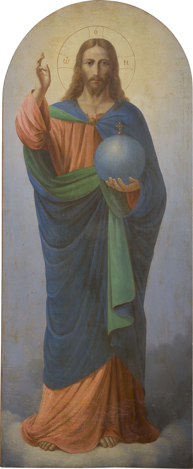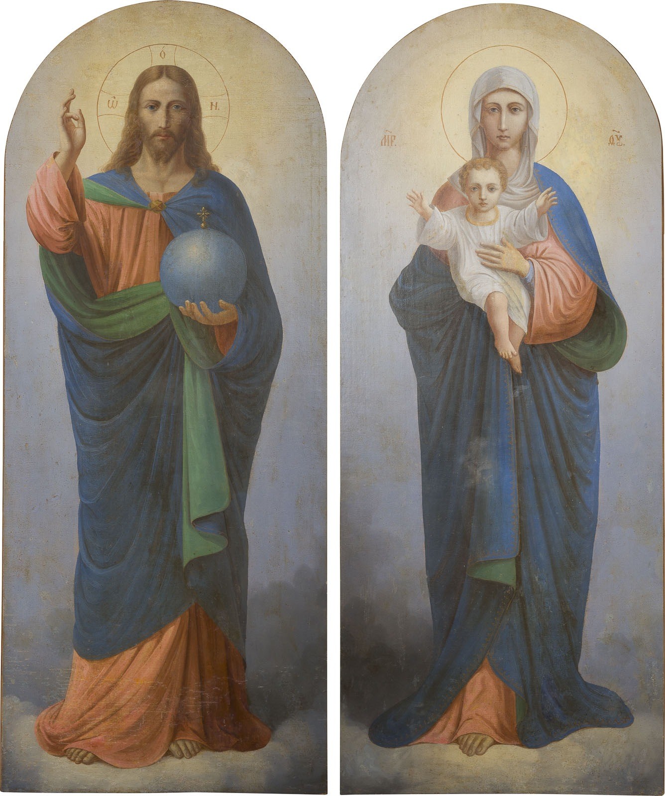 PAAR MONUMENTALE IKONEN MIT CHRISTUS DEM WELTENHERRSCHER UND DER GOTTESMUTTER VASNETSOVSKAJA