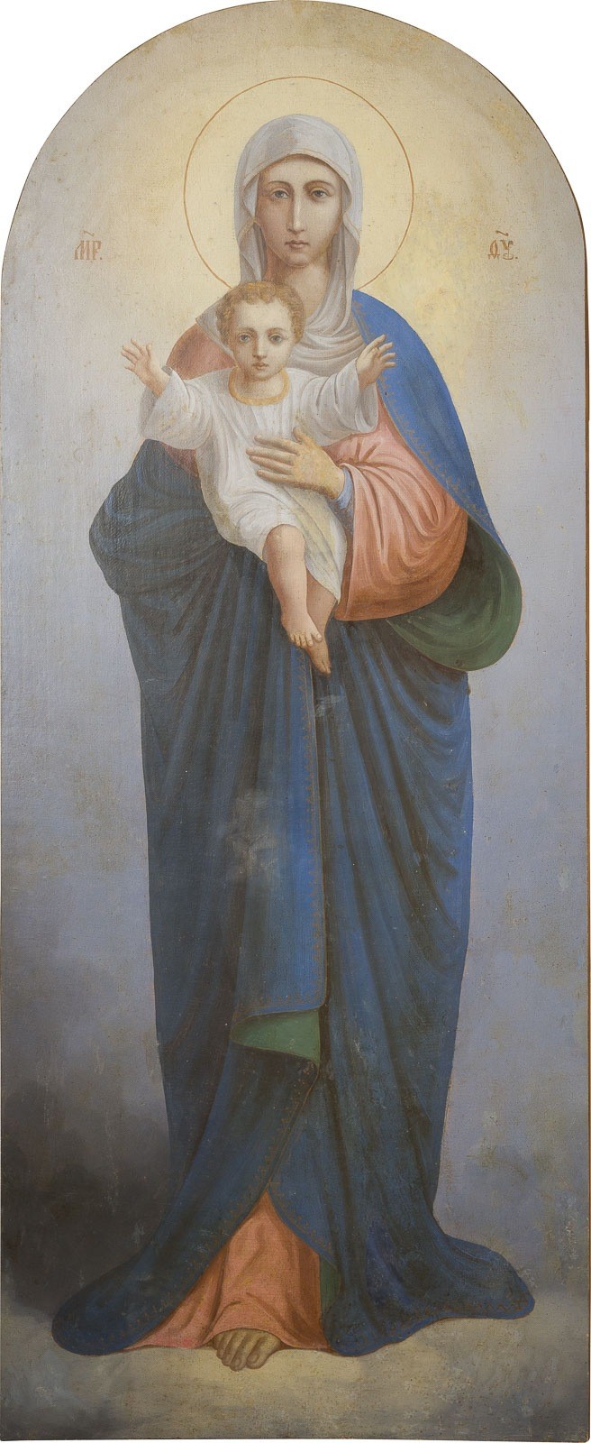 A PAIR OF MONUMENTAL ICONS SHOWING CHRIST THE SAVIOUR AND THE MOTHER OF GOD VASNETSOVSKAYA Russian, circa 1900 Oil on canvas laid down on wood panels. Restorations. Each 97.7 x 39.8 cm.