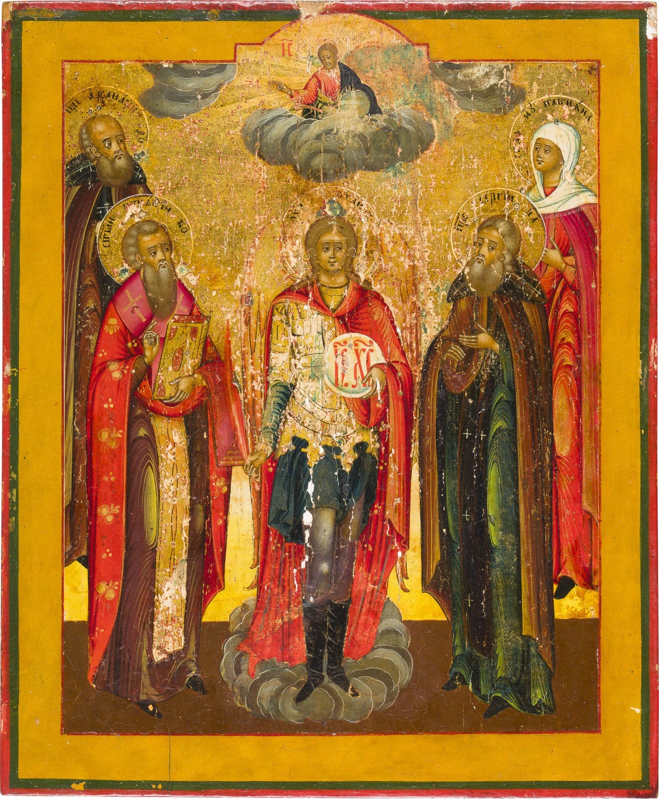 AN ICON SHOWING THE ARCHANGEL MICHAEL FLANKED BY FOUR SAINTS Russian, 19th century Tempera on wood panel, gold ground. Minor losses, some paint rising. 35.2 x 29 cm.