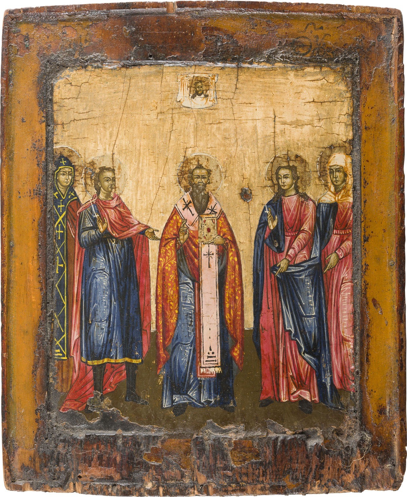 A PATRONAL ICON SHOWING FIVE SELECTED SAINTS Russian, 19th century Tempera on wood panel with double kovcheg. Losses, the background stripped to gesso. 30.5 x 25.8 cm.