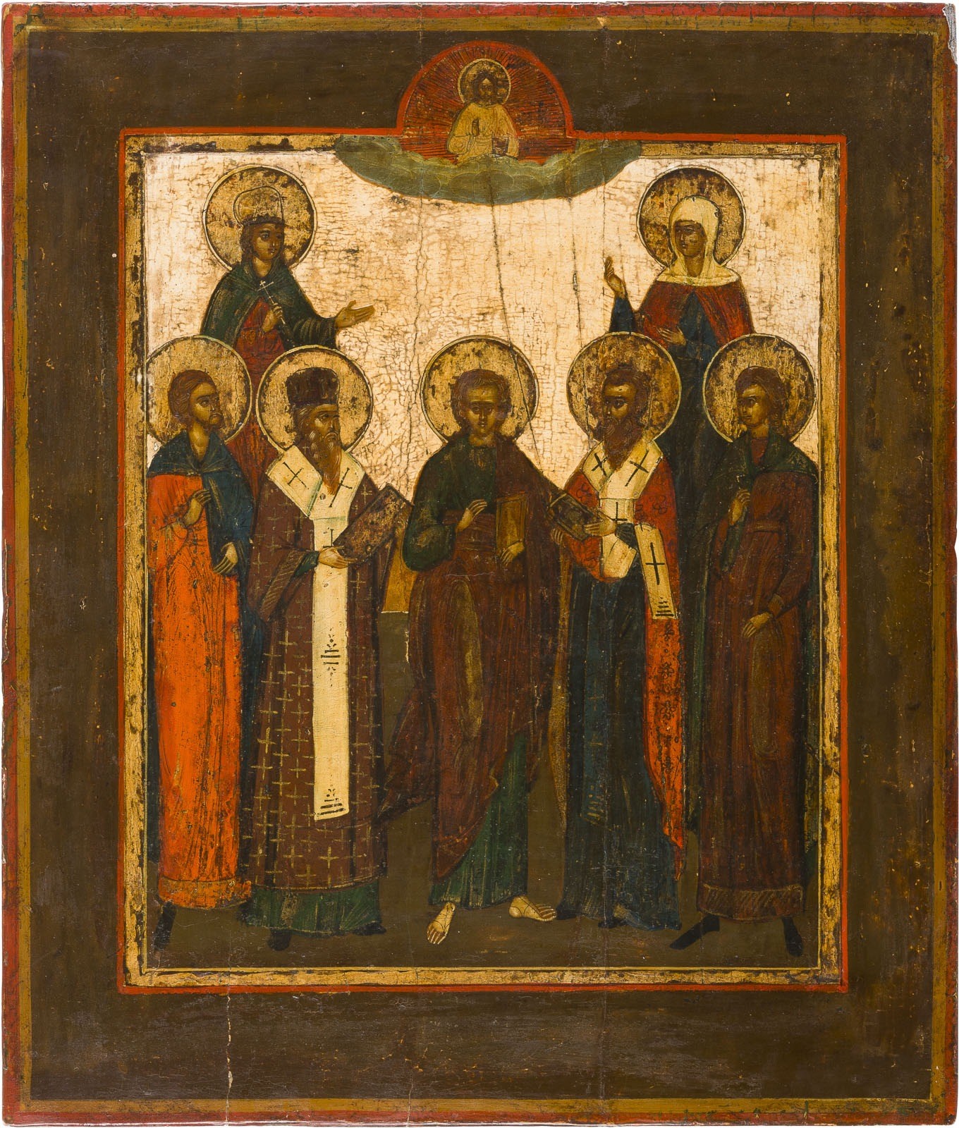A PATRONAL ICON SHOWING SEVEN SELECTED SAINTS Russian, 19th century Tempera on wood panel with kovcheg. The background stripped to gesso, restorations. 31 x 26.4 cm.