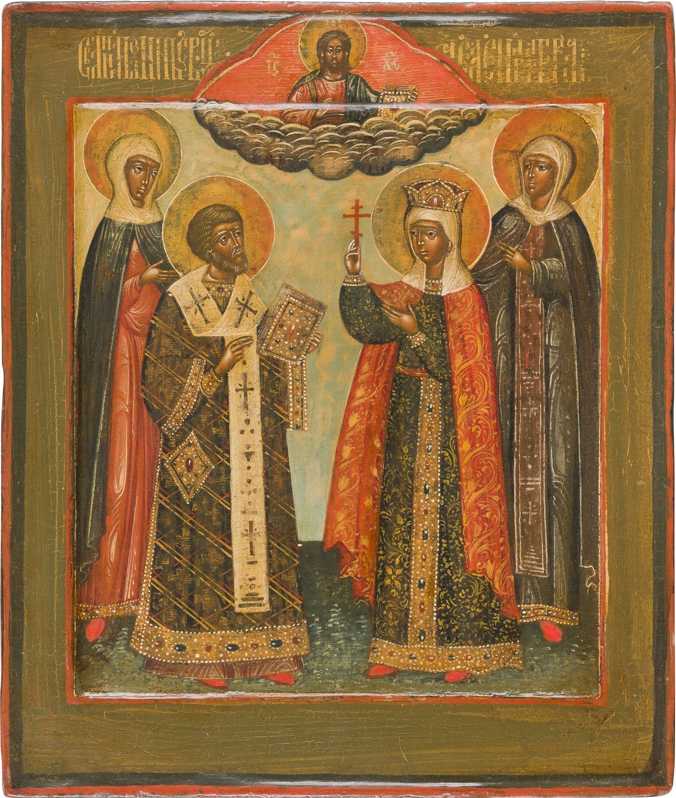 AN ICON SHOWING FOUR SELECTED SAINTS Russian, circa 1800 Tempera on wood panel with double kovcheg. Restorations. 30 x 25.8 cm.