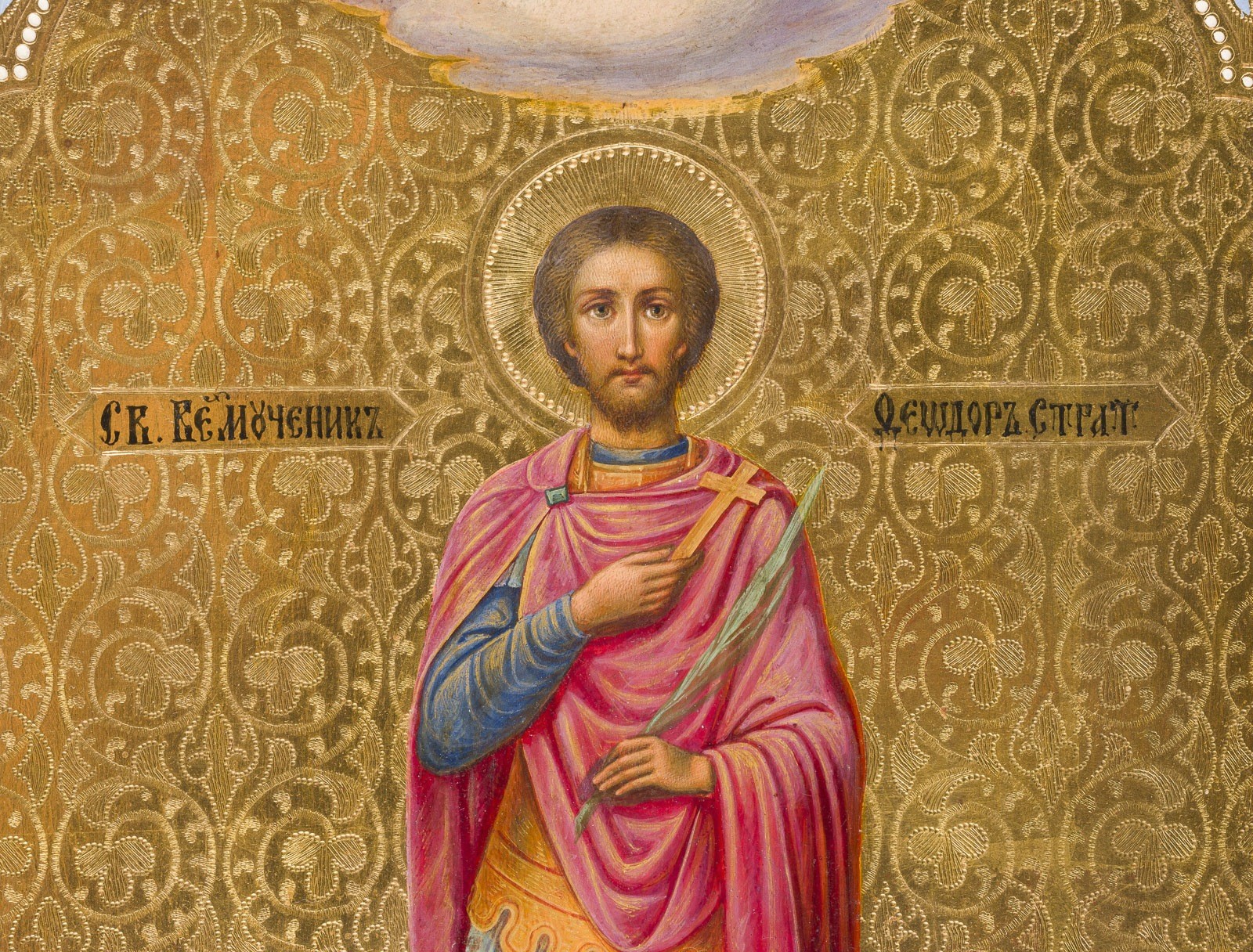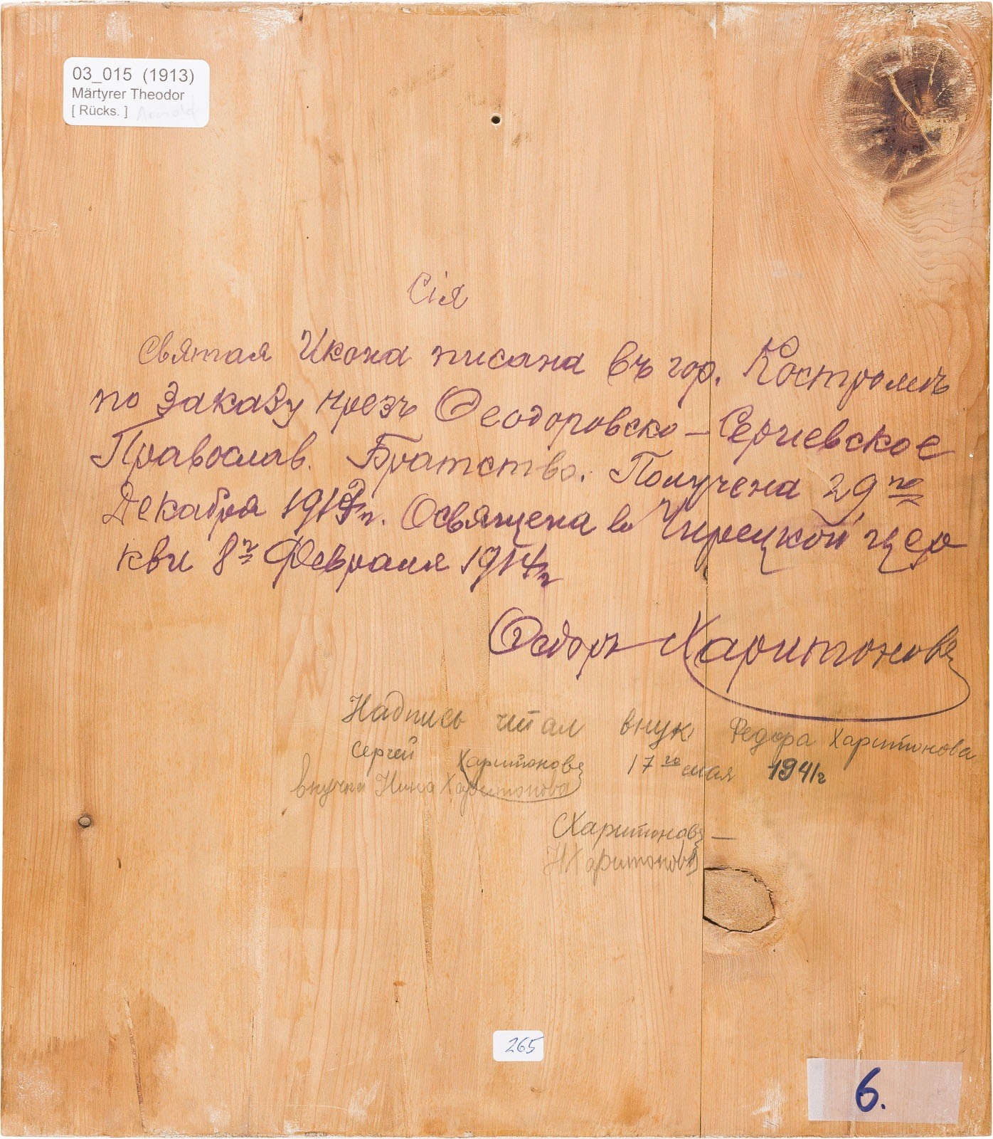 A VERY FINE DATED ICON OF THE WARRIOR SAINT THEODOR STRATELATES Russian, Kostroma, dated 1913 Tempera on wood panel. The gilt background ornately incised. The borders ornately incised and painted in faux enameling. On the reverse Cyrillic dedicatory inscriptions: 'This holy icon was painted on commission of the Orthodox Fedorov-Sergievsky Brotherhood in Kostroma. Received on December 29, 1913. Consecrated in the Khriretsk Church on February 8, 1914. Fedor Kharitonov. The inscription was read on May 17, 1941 by Fedor Kharitonov's grandson Sergei Kharitonov and granddaughter Nina Kharitonova.' 35.6 x 30.8 cm. On October 15, 1887, in the Sretensky Church of the Kostroma Theological Seminary, the Orthodox Kostroma Brotherhood of Saint Sergius was founded (in 1892 renamed the Theodor-Sergius Brotherhood). It was supported by Grand Duke Sergei Alexandrovich, who later also became its honorary member. Literature: E. Haustein-Bartsch (ed.): Pforte des Himmels, Bielefeld 2008, cat. 161.