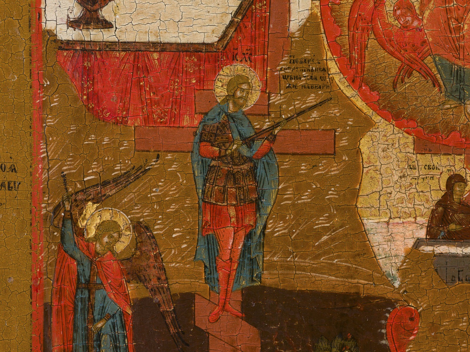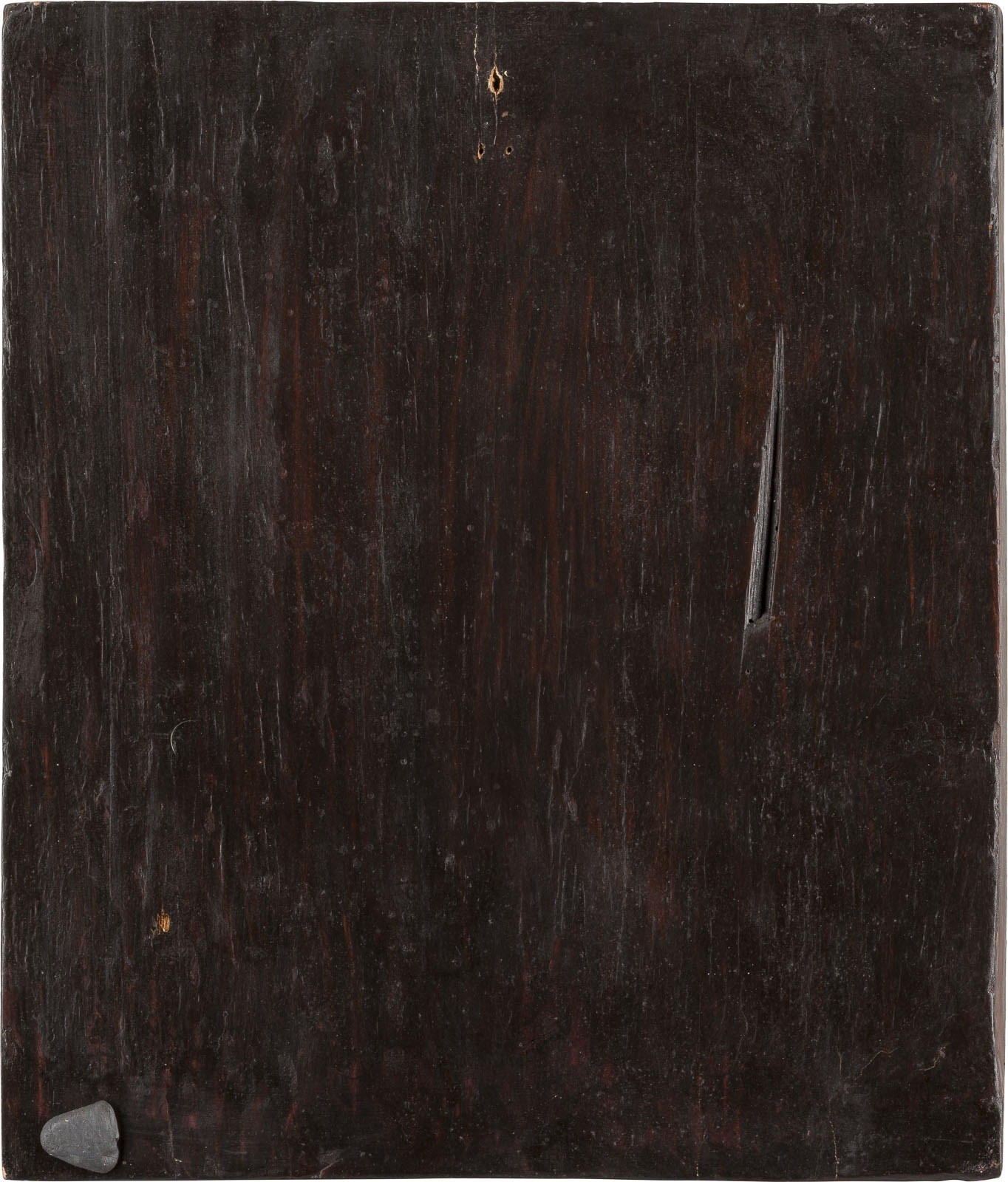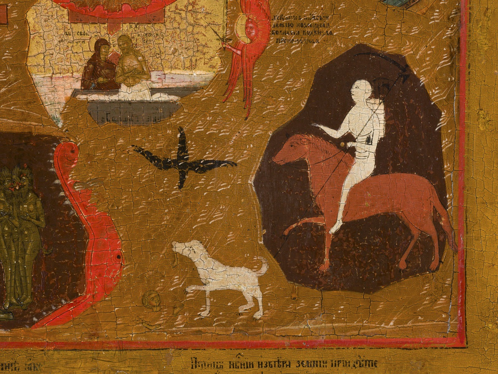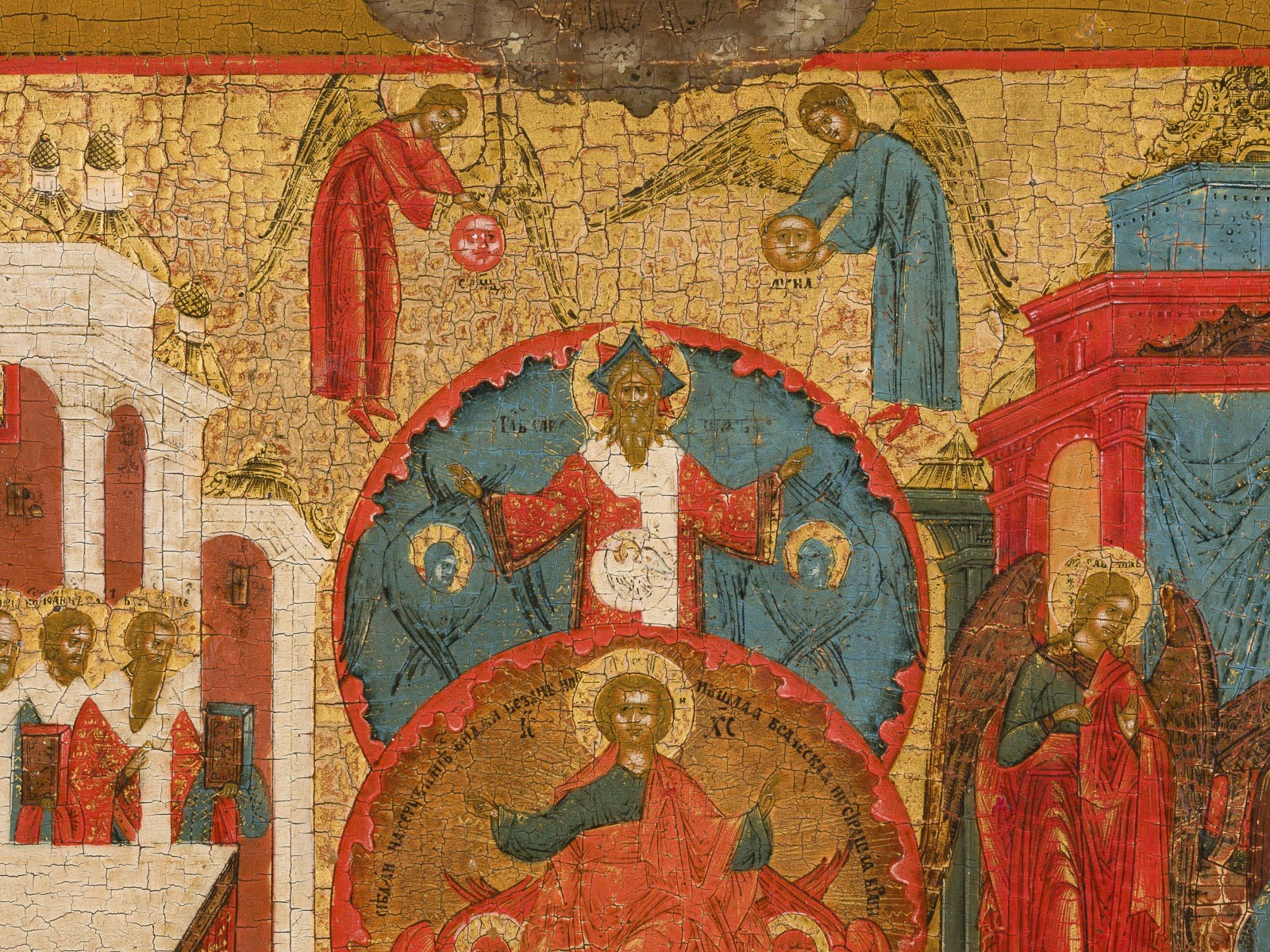 A VERY FINE ICON SHOWING CHRIST 'ONLY BEGOTTEN SON' Russian, Vyg region, circa 1800 Tempera on wood panel with kovcheg. The panel depicting Christ Emmanuel enthroned in the centre, surrounded by a large aureole, above are the Trinity and God Sabaoth with two angels to the left and to the right. In the lower right a triumphant skeleton holding a scythe astride an apocalyptic beast symbolising Death, a victorious Christ dressed in armour opposite. The lower border partially restored. 35.1 x 30 cm.