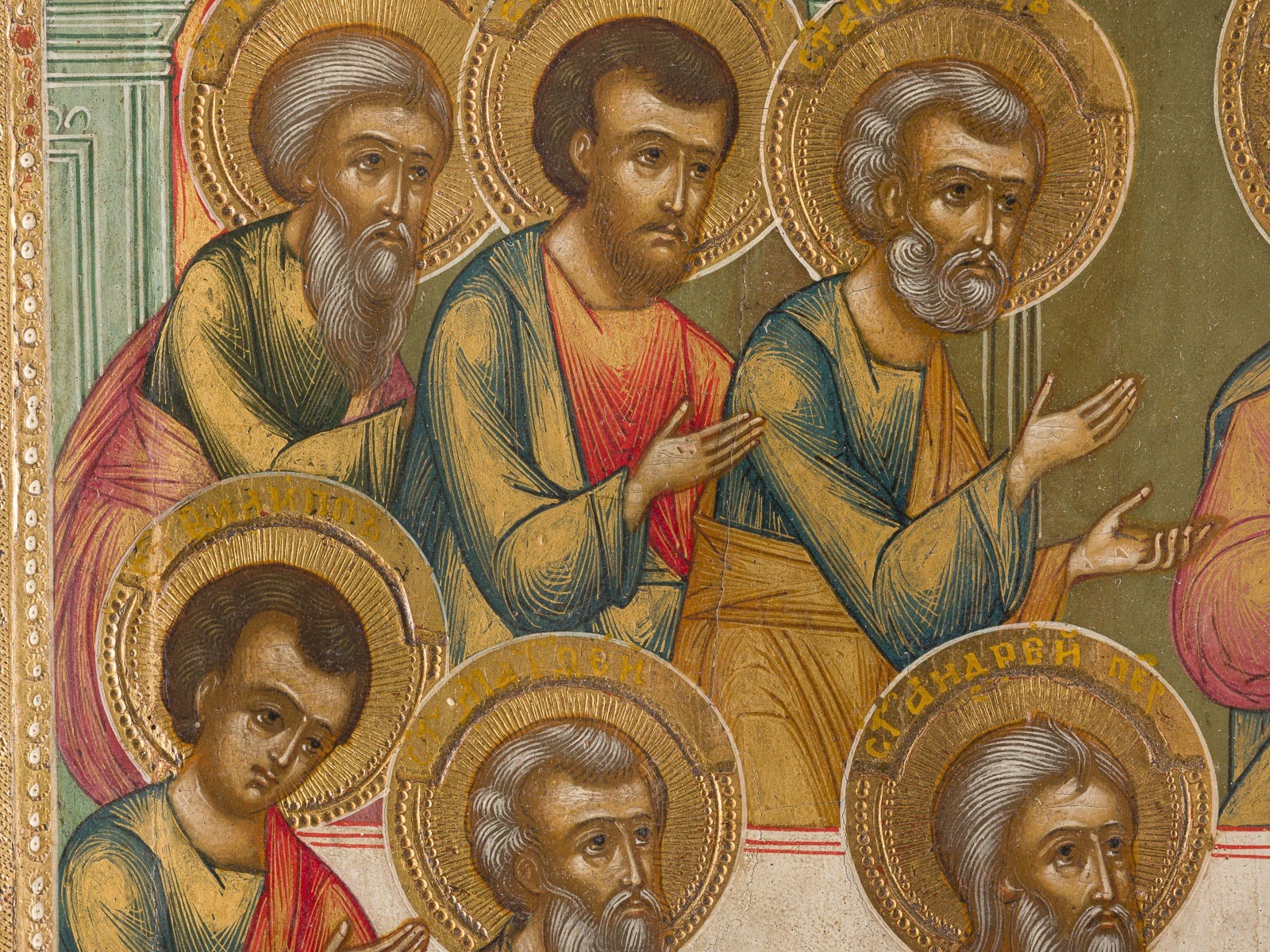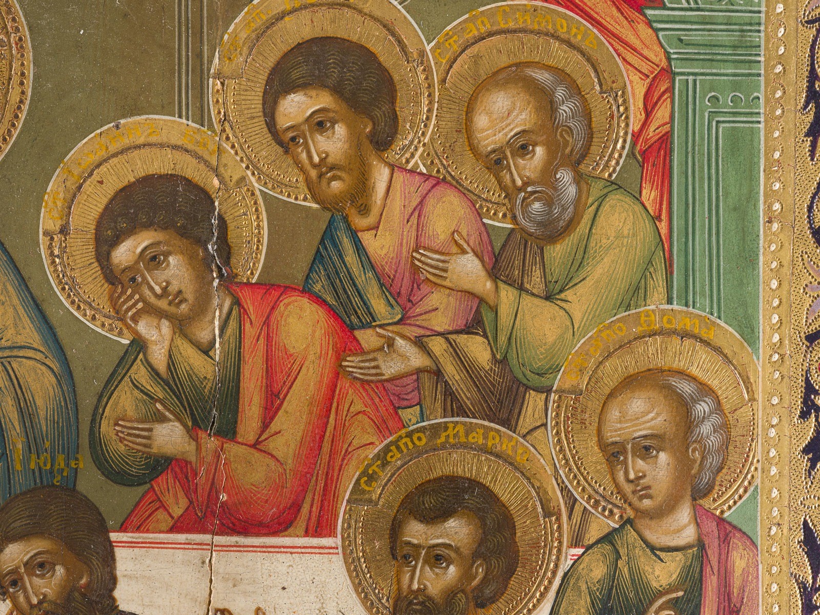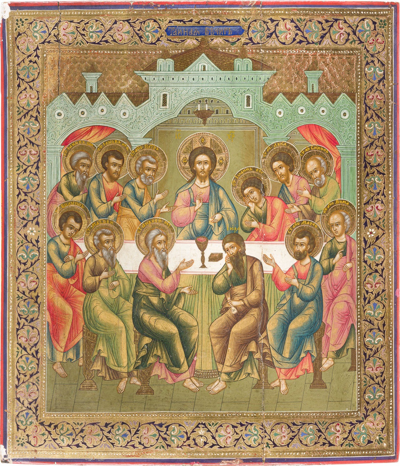 A VERY FINE ICON SHOWING THE LAST SUPPER Russian, Mstera, circa 1900 Tempera on wood panel. Finely painted in bright colours on gold ground. The background with etched tracery design, the border emulating contemporary enamelwork. Vertical crack minimally restored. 35.7 x 31.3 cm.