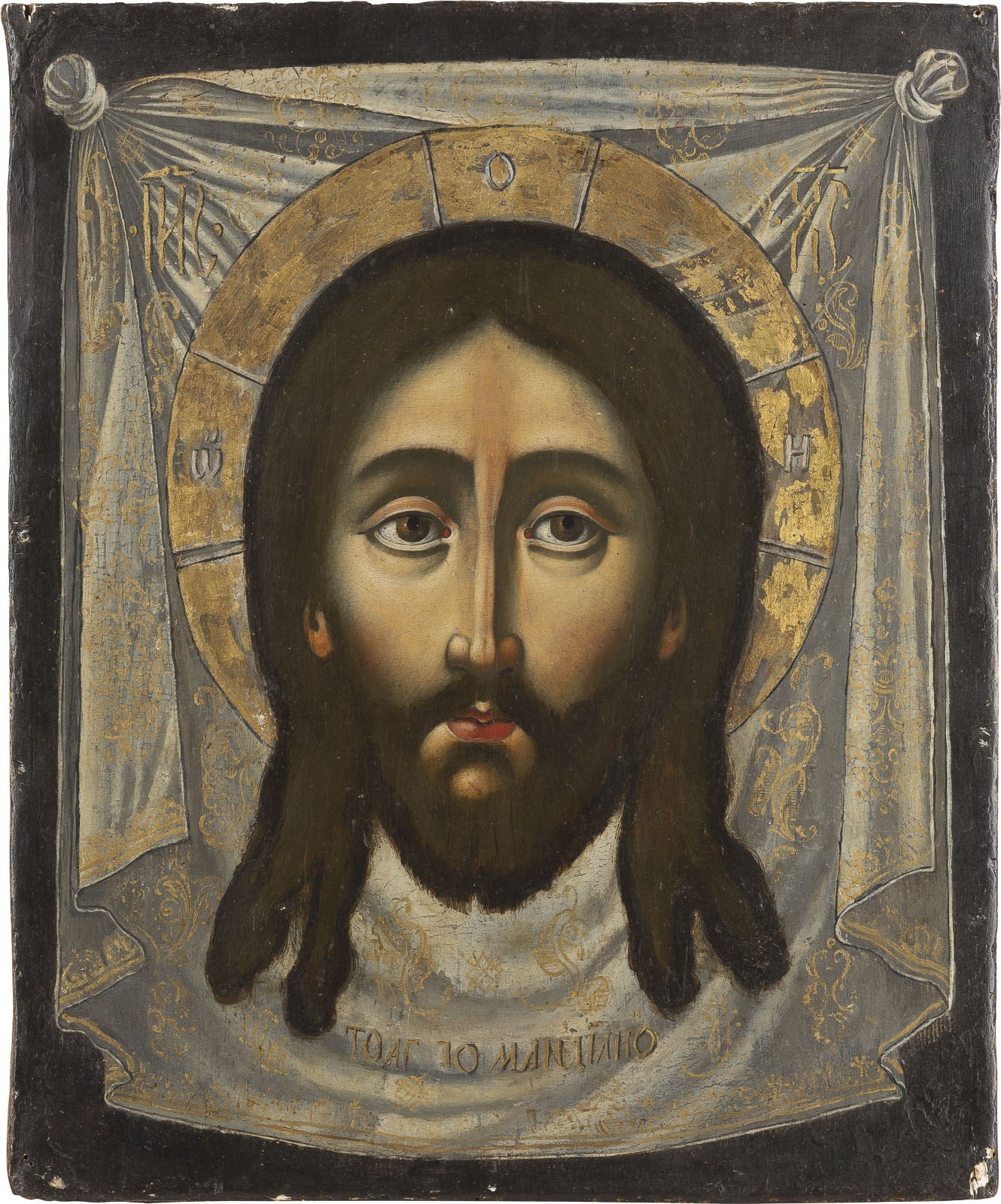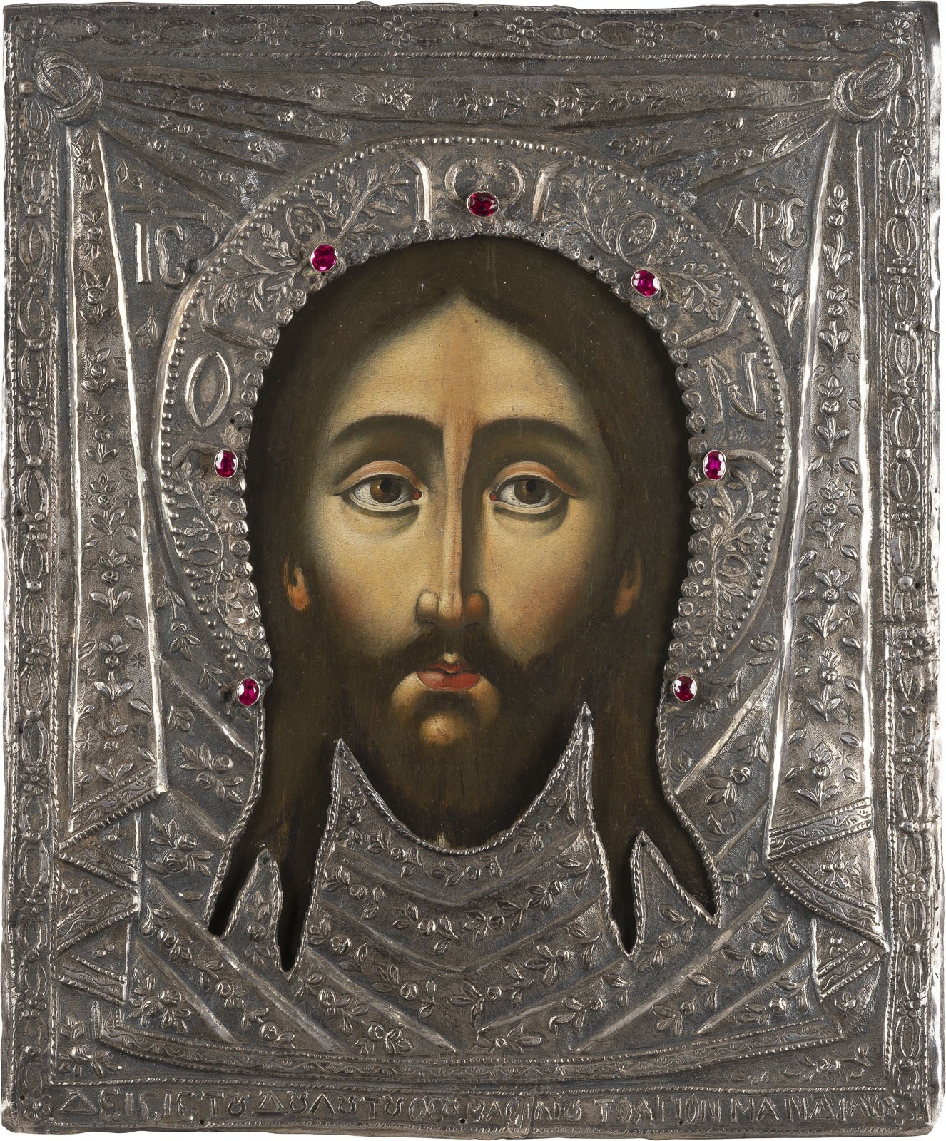 A VERY FINE ICON OF THE MANDYLION WITH A SILVER OKLAD Russian, circle of the Moscow Armory, circa 1700 (icon), Ottoman Empire, 1876-1909 (oklad) Tempera on wood panel. The halo made of gold. The silver oklad chased and repoussé. Oklad struck with guarantee mark and master's mark. Edges partially damaged, partially restored. 31.3 x 26 cm.