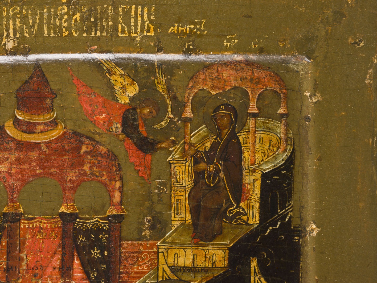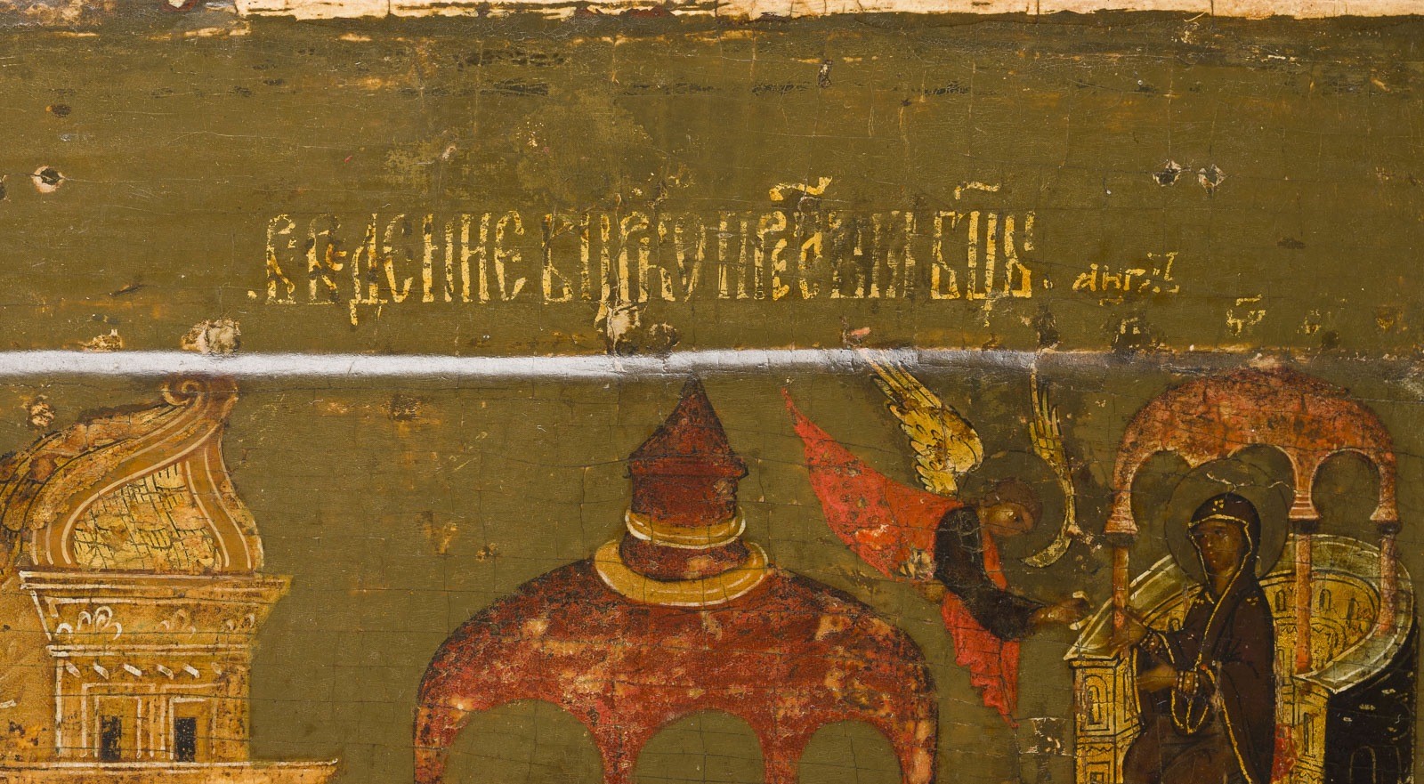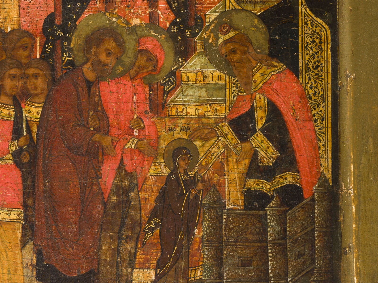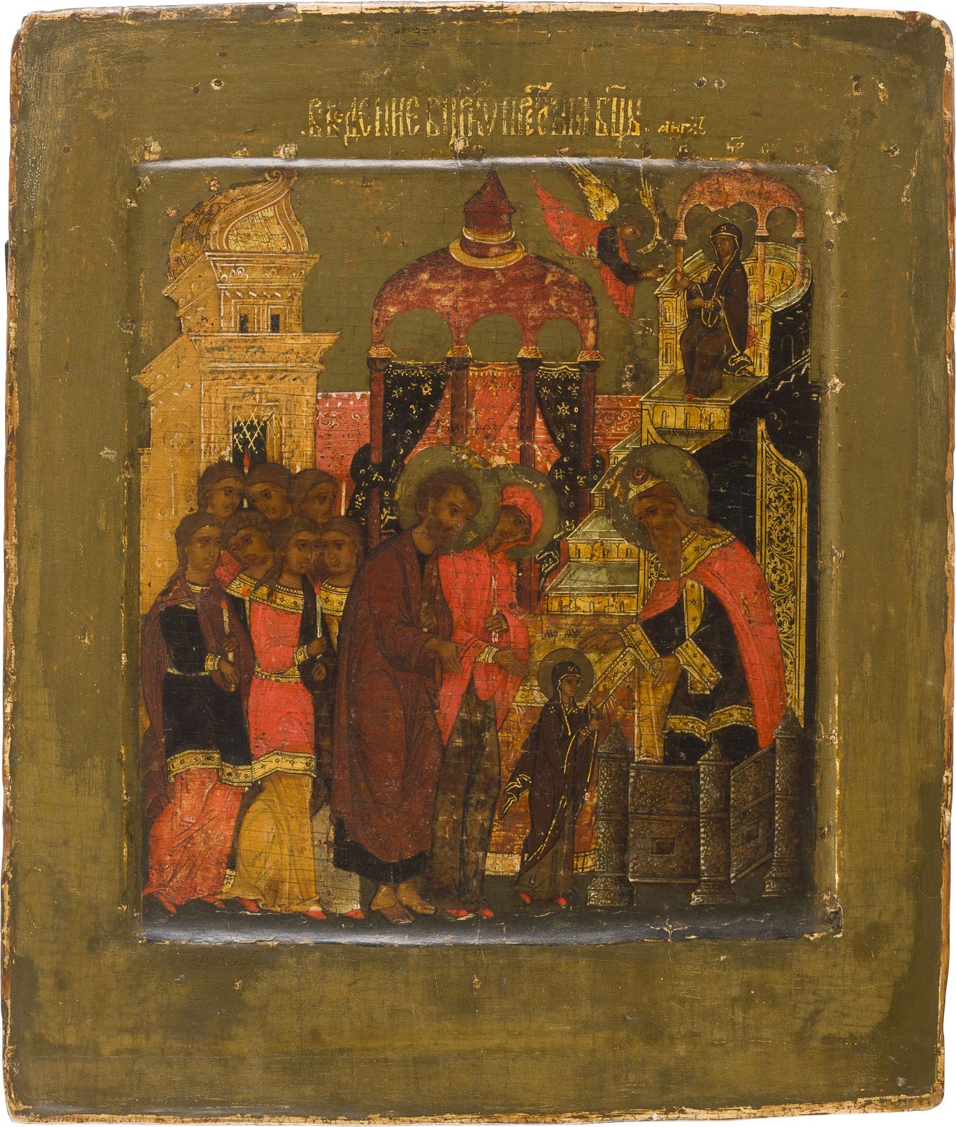 A VERY FINE ICON SHOWING THE ENTRY OF THE MOTHER OF GOD INTO THE TEMPLE Russian, 16th century Tempera on wood panel with double kovcheg. The hems of the garments and the details of the architecture made of gold. The border minimally restored. 31.8 x 27.7 cm.