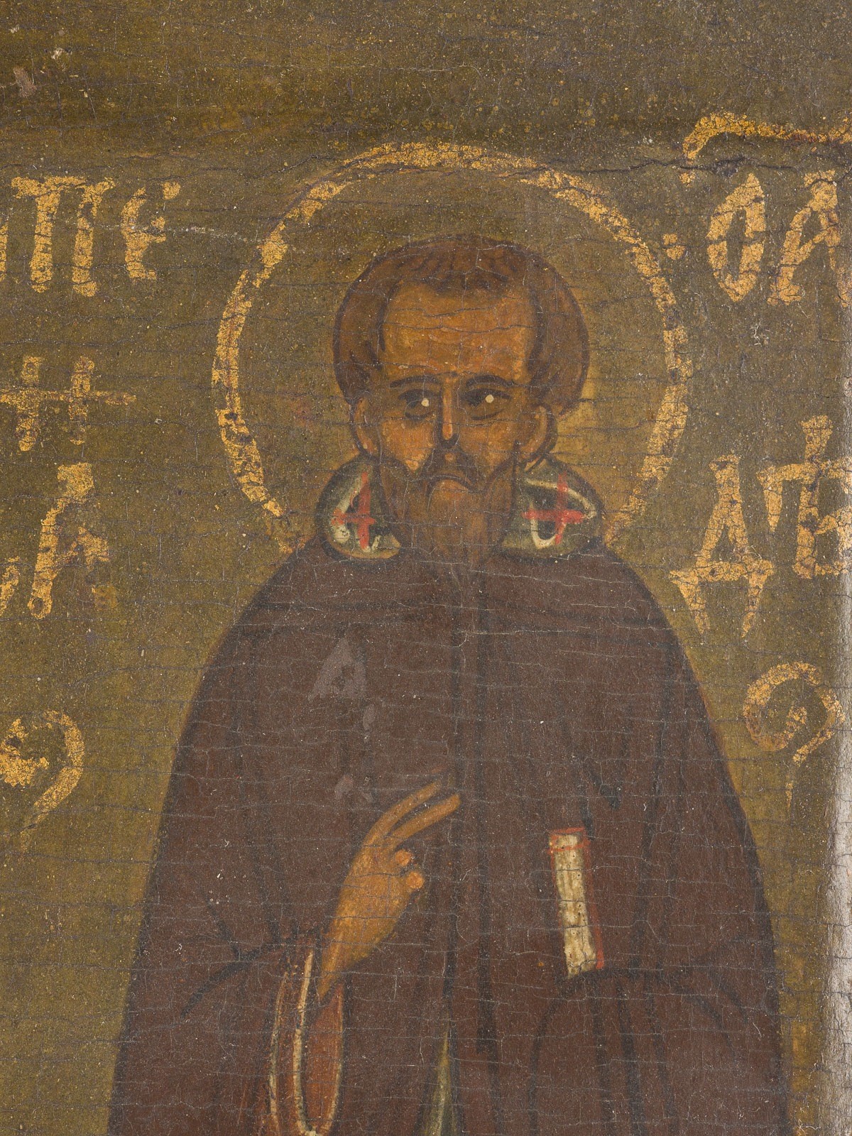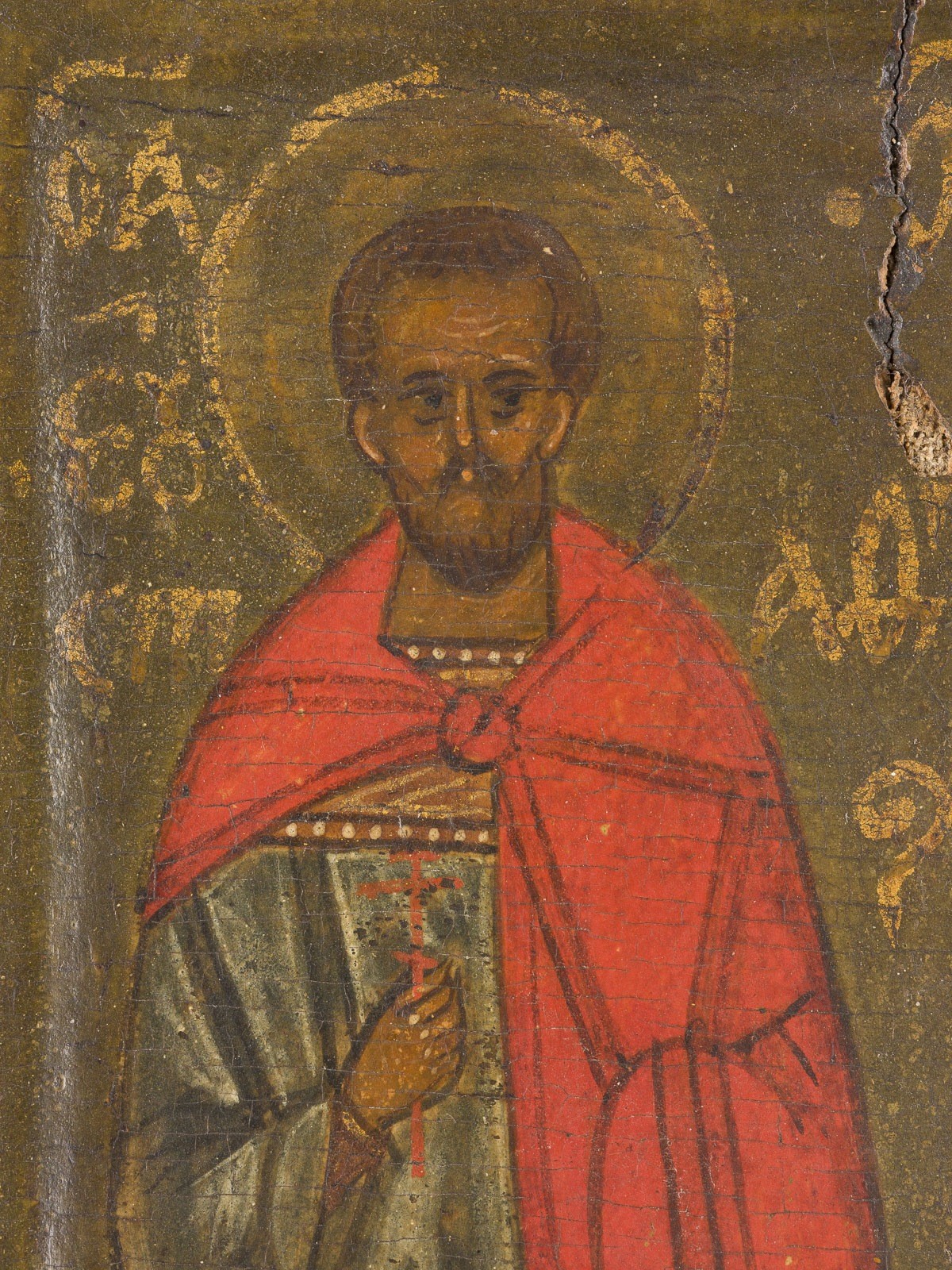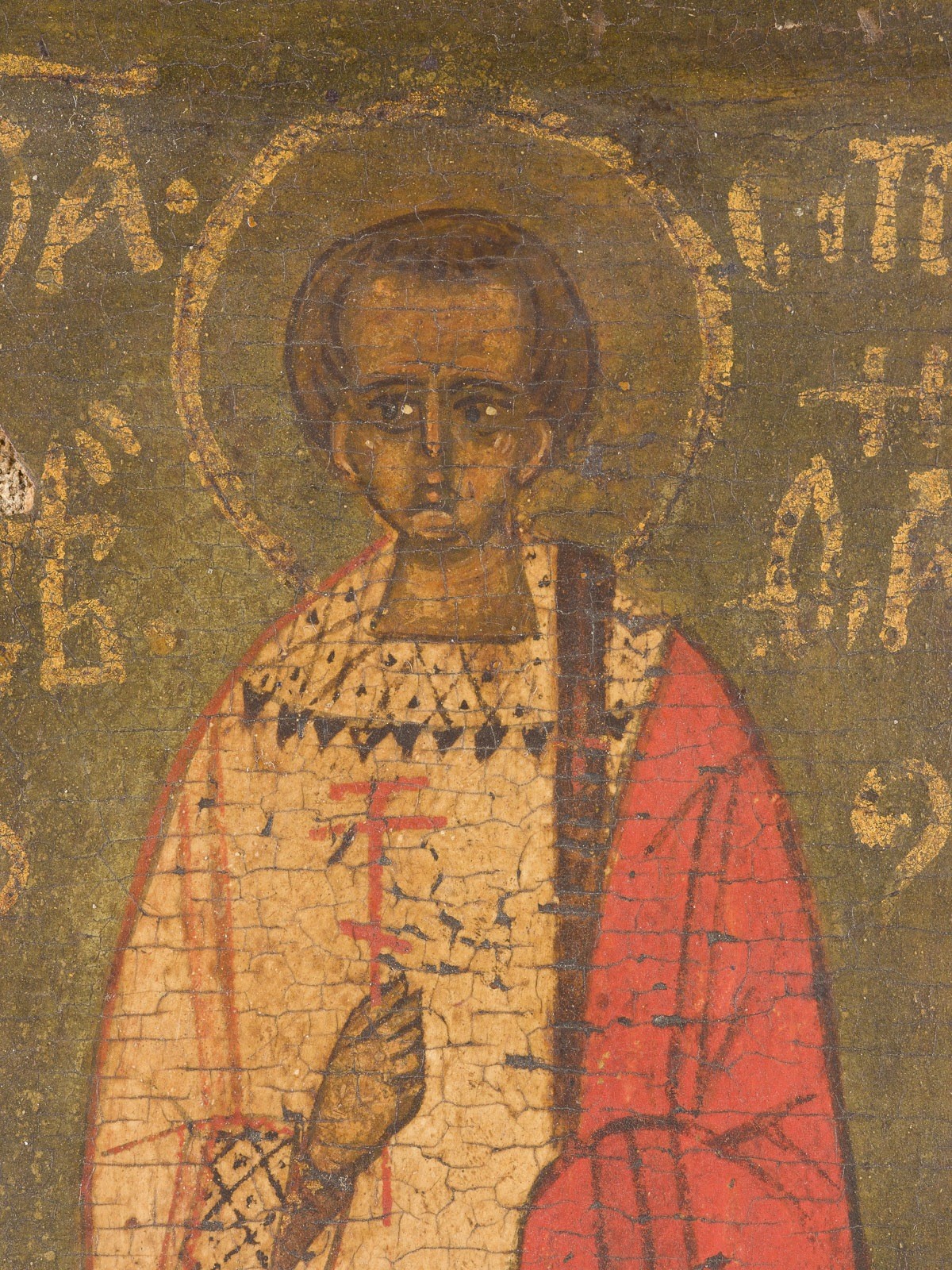 SEHR FEINE IKONE MIT DEN HEILIGEN EUSTATHIOS, STEPHANUS UND EINEM MÖNCHSHEILIGEN