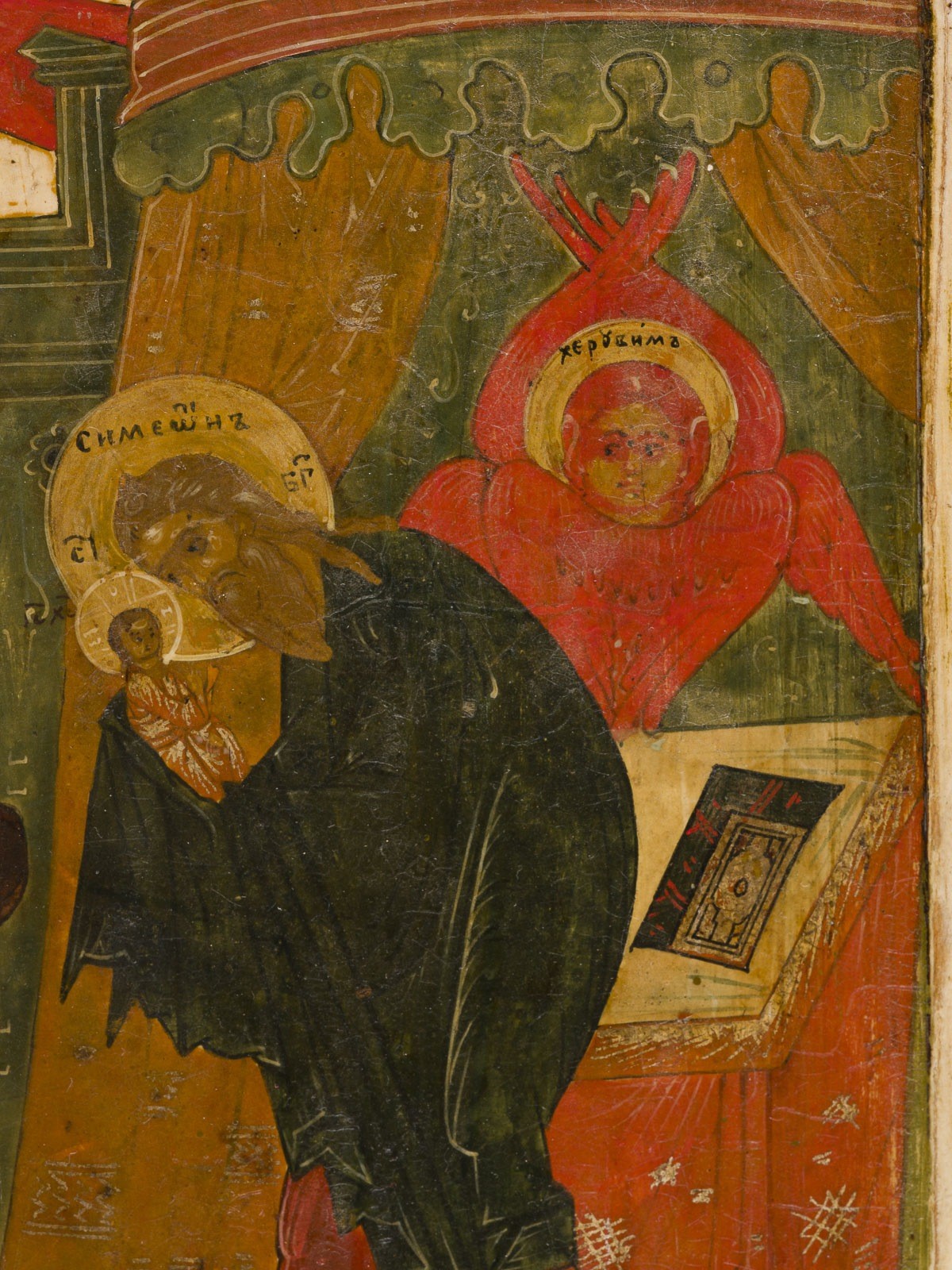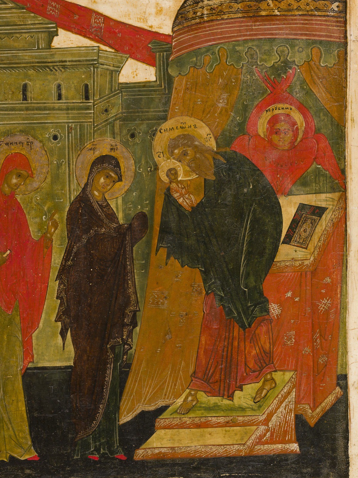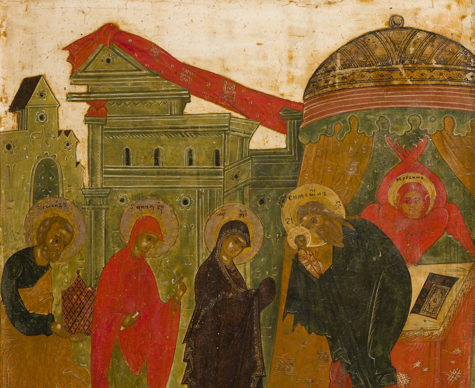 A VERY FINE ICON SHOWING THE PRESENTATION OF CHRIST TO THE TEMPLE Russian, circa 1600 Tempera on wood panel with kovcheg. Symeon the Righteous with veiled hands holding Christ in front of an altar. The Mother of God extending her hands to receive the baby, the Prophetess Anna standing behind her, at the left Joseph bearing a cage. An architectural setting in the background, the garments rendered with saturated tones. The background and border stripped to gesso. 31.6 x 26.7 cm.