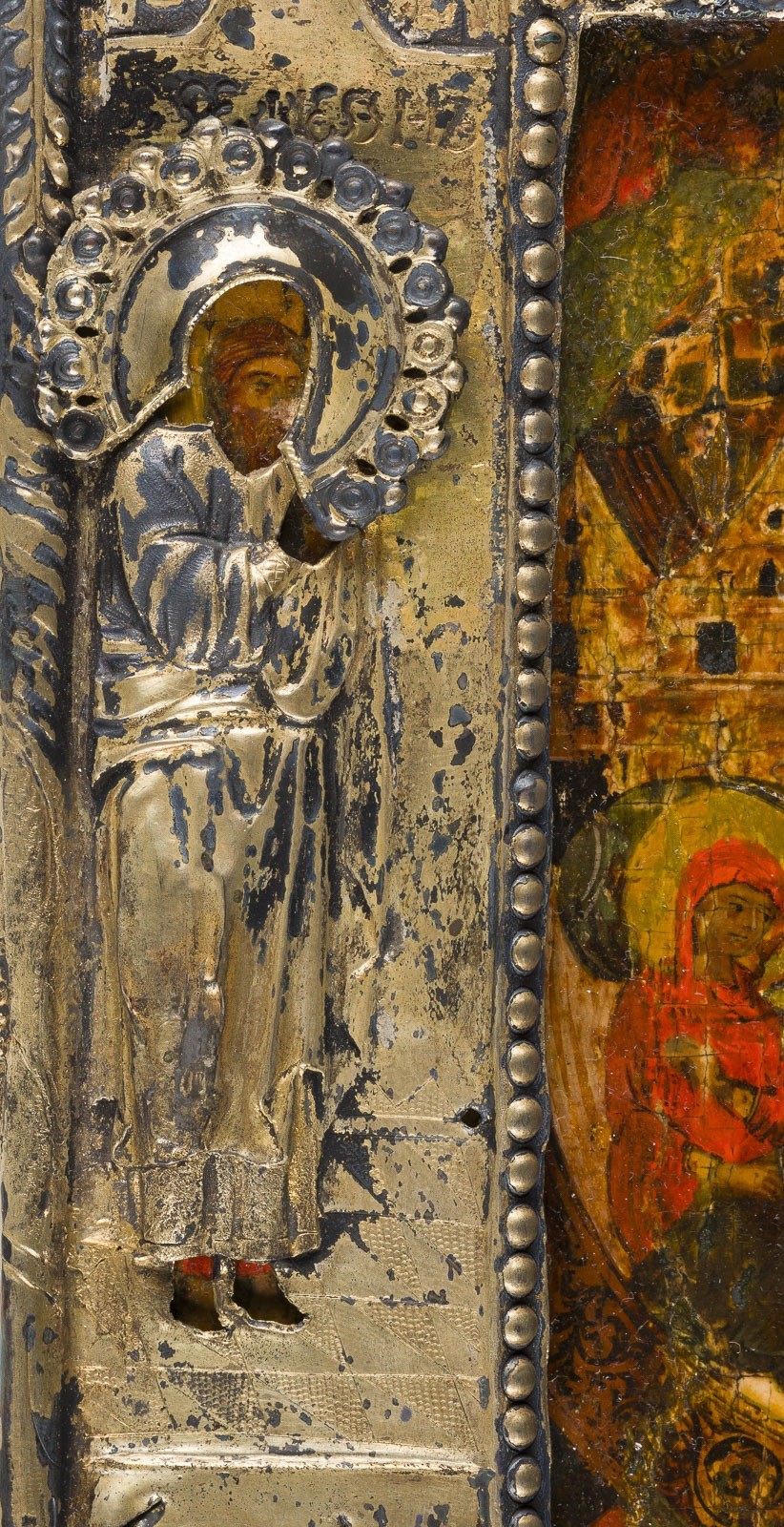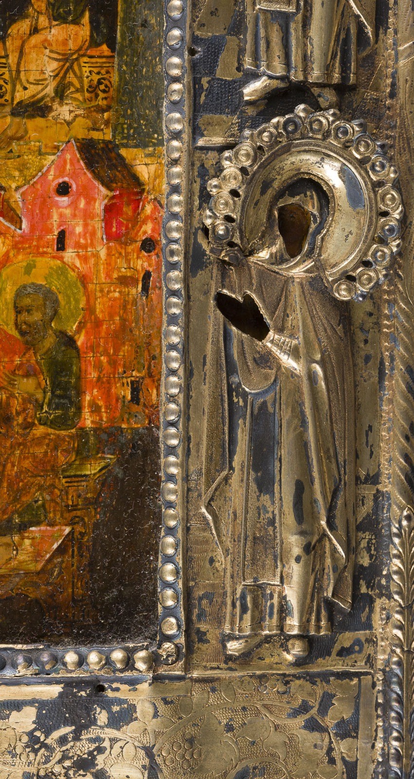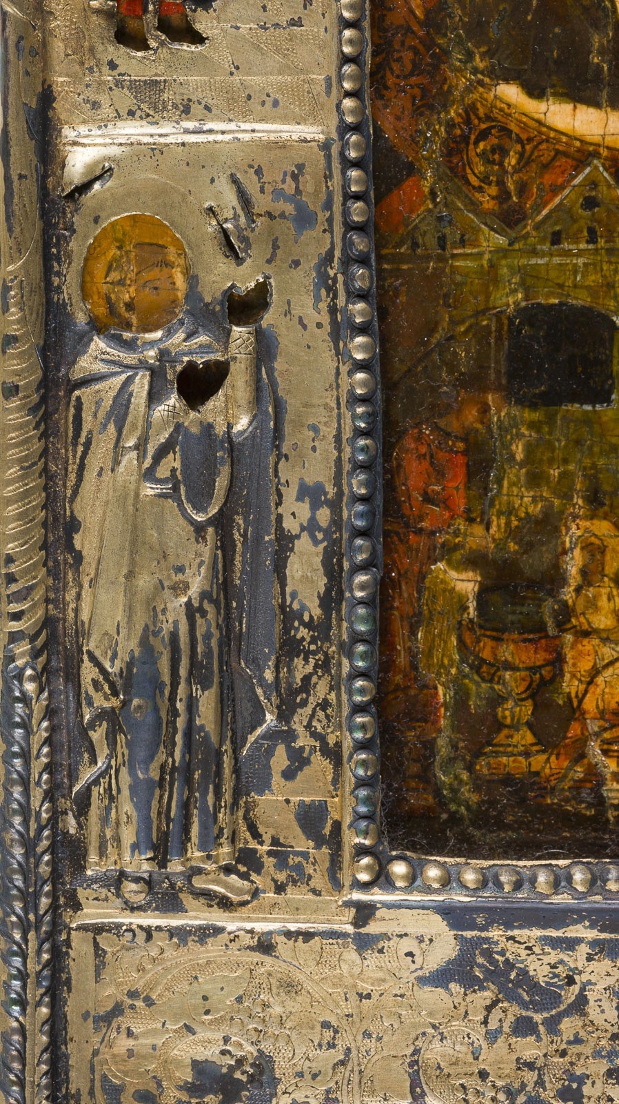 A VERY FINE ICON SHOWING THE NATIVITY OF THE MOTHER OF GOD AND THE ENTRY OF THE MOTHER OF GOD INTO THE TEMPLE WITH SILVER-GILT BASMA Russian, 16th century (icon), Russian, circa 1800 (basma) Tempera on wood panel with kovcheg. Four selected saints on the borders. The borders overlaid with a silver-gilt basma engraved with scrolling foliage. Partially restored. 31.5 x 26 cm.