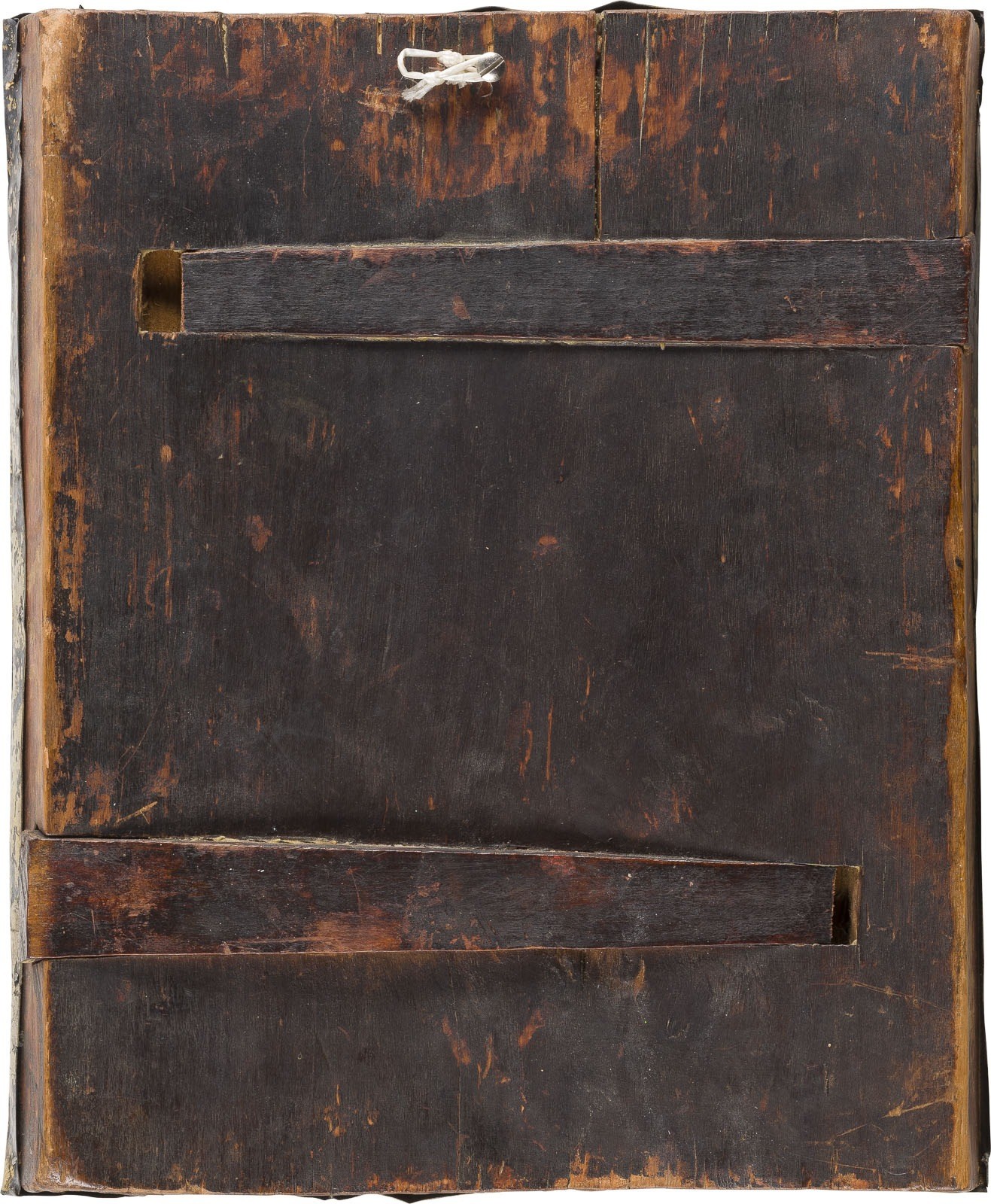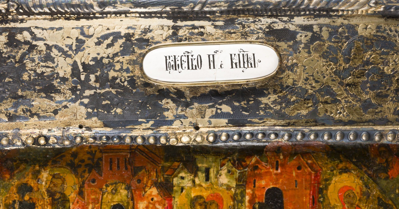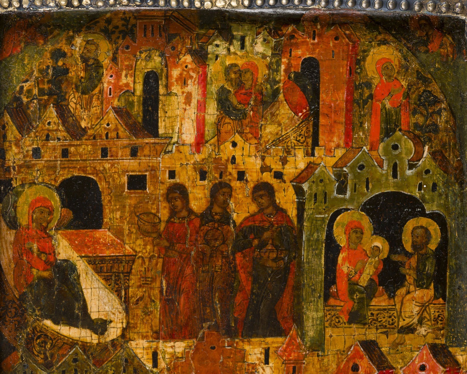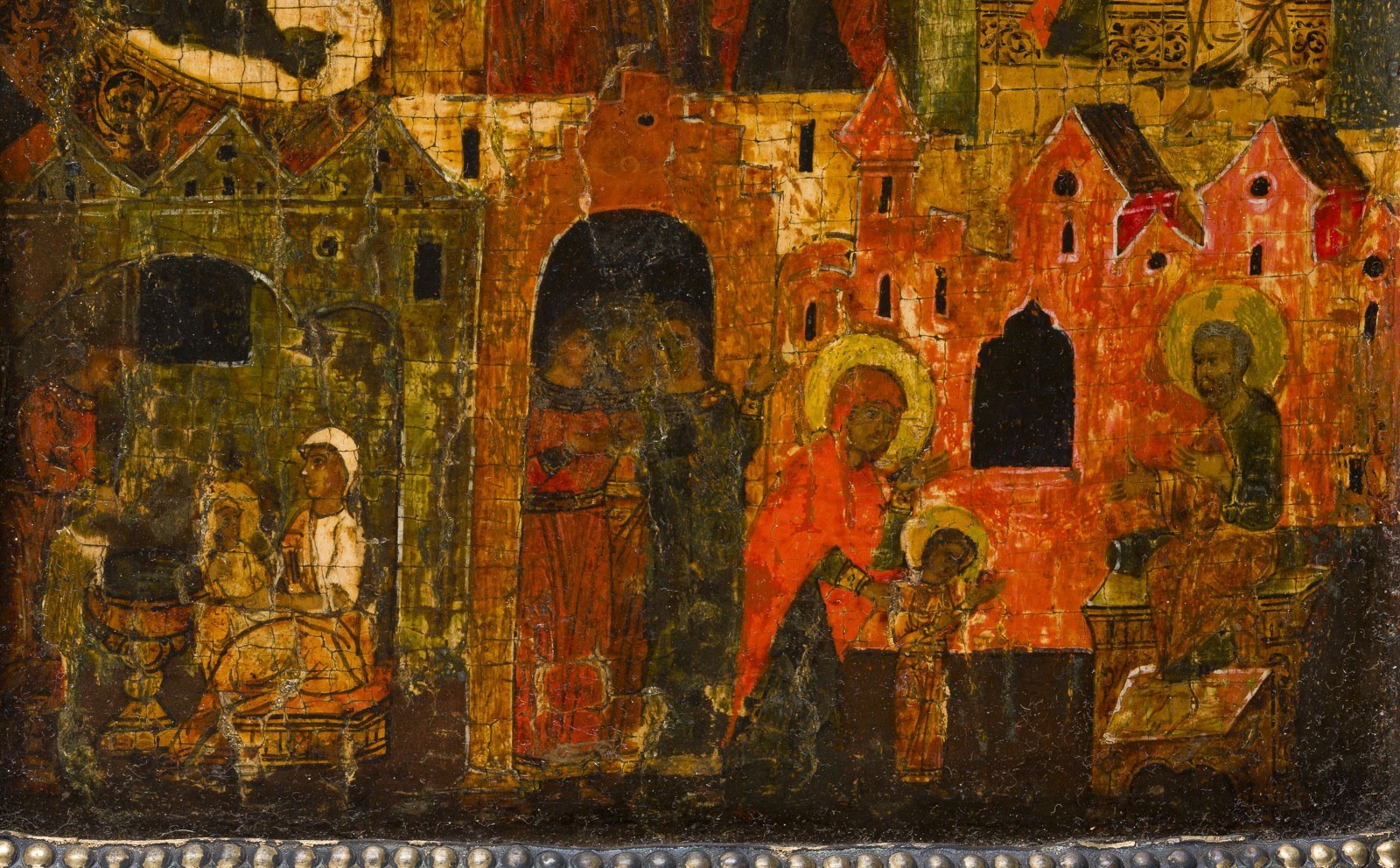 A VERY FINE ICON SHOWING THE NATIVITY OF THE MOTHER OF GOD AND THE ENTRY OF THE MOTHER OF GOD INTO THE TEMPLE WITH SILVER-GILT BASMA Russian, 16th century (icon), Russian, circa 1800 (basma) Tempera on wood panel with kovcheg. Four selected saints on the borders. The borders overlaid with a silver-gilt basma engraved with scrolling foliage. Partially restored. 31.5 x 26 cm.