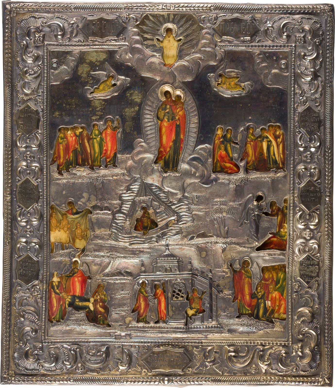 A VERY FINE ICON OF THE MOTHER OF GODD' JOY TO ALL WHO GRIEVE' WITH A FINE SILVER-GILT RIZA Central Russian, early 19th century (icon), Russian, Moscow, Aleksey Fedorovitch Frolov, 1849 (riza) Tempera on wood panel. Finely executed in great detail. Painted finely with complimentary greens and reds, the garment folds emphasised with strong gold striations. The silver-gilt riza repoussé and chased with rocaille motifs. Marked with city hallmark, assayer's mark, 84 standard and master's mark 'AF' in Cyrillic. Partially restored. 36 x 31 cm.