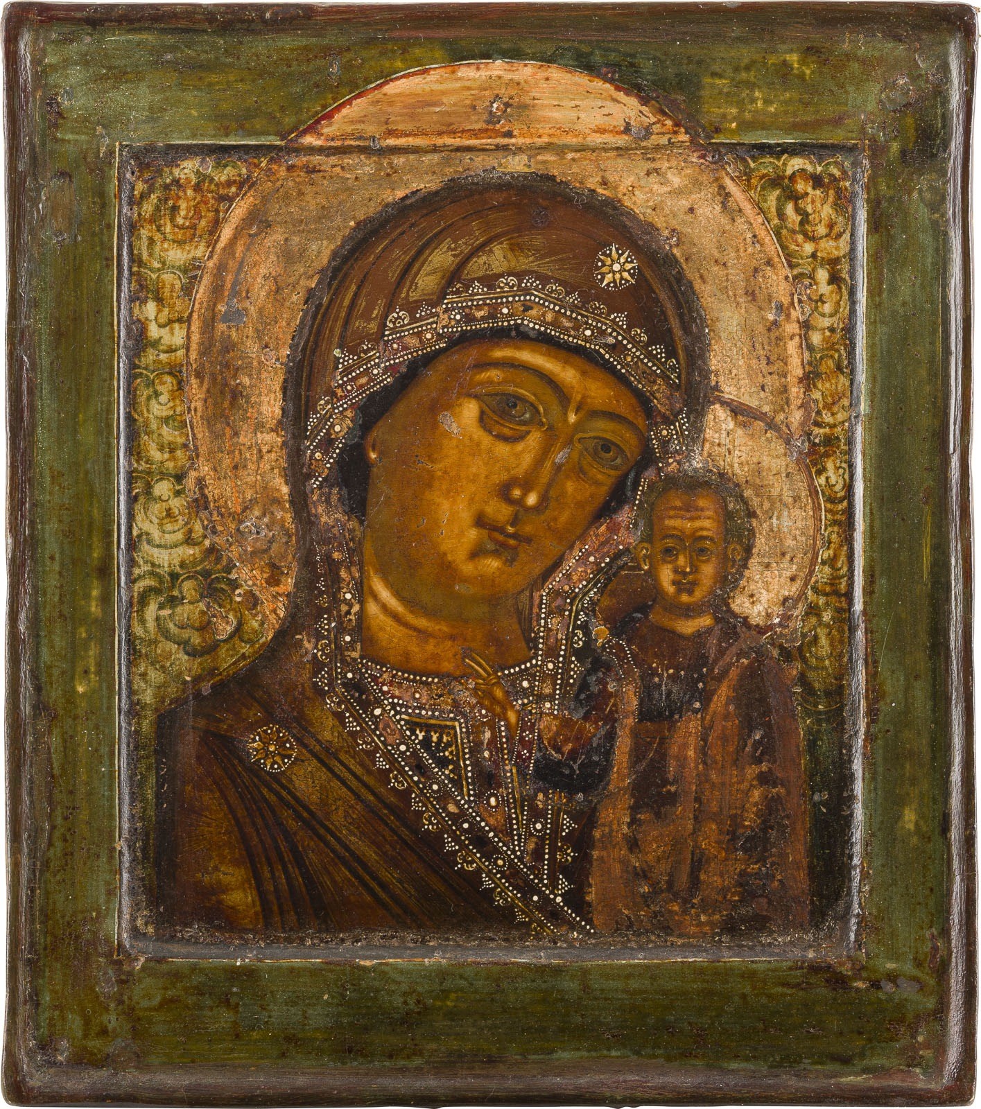 A VERY FINE ICON SHOWING THE KAZANSKAYA MOTHER OF GOD Russian, Yaroslavl, 2nd half of the 17th century Tempera on wood panel with double kovcheg. The haloes made of gold. The background decorated with green clouds. The flesh modeled in light tan colour, brightened by natural tones. The border minimally restored. 31.5 x 27.7 cm.