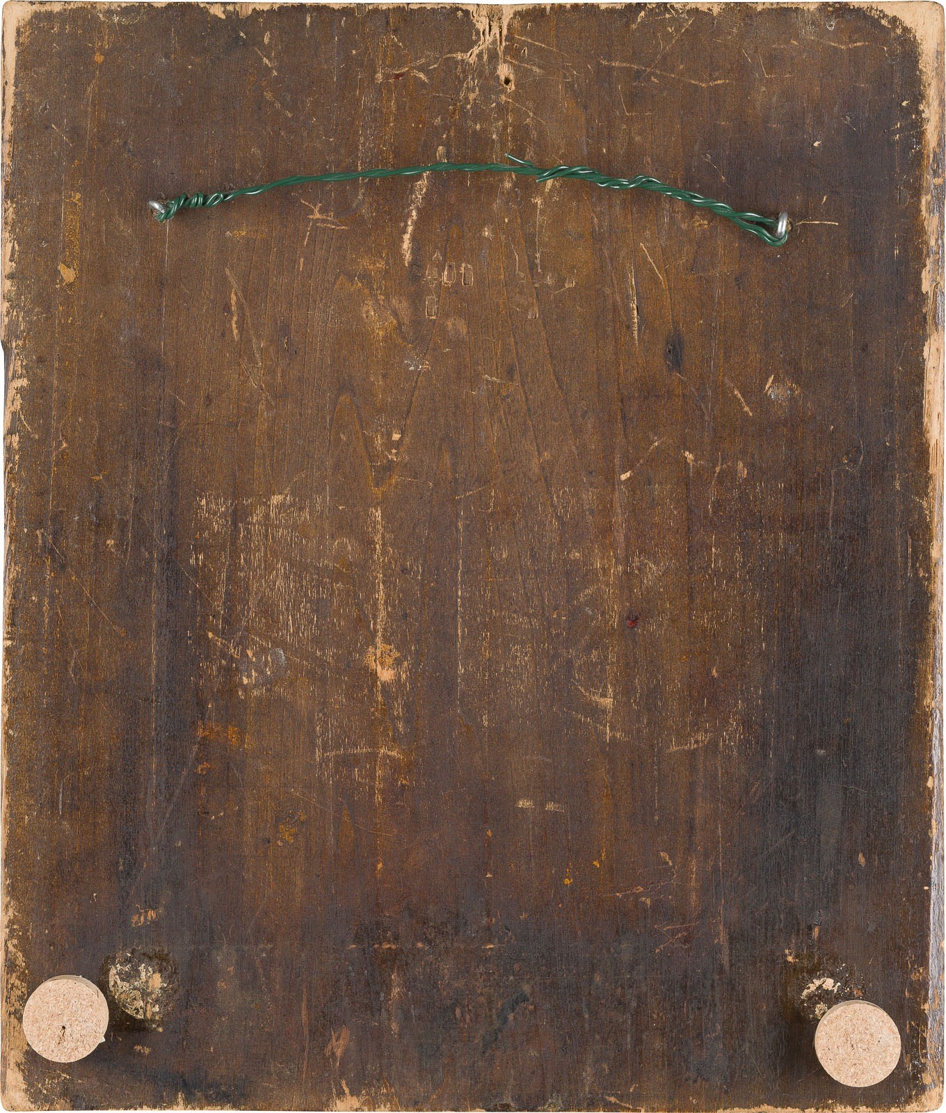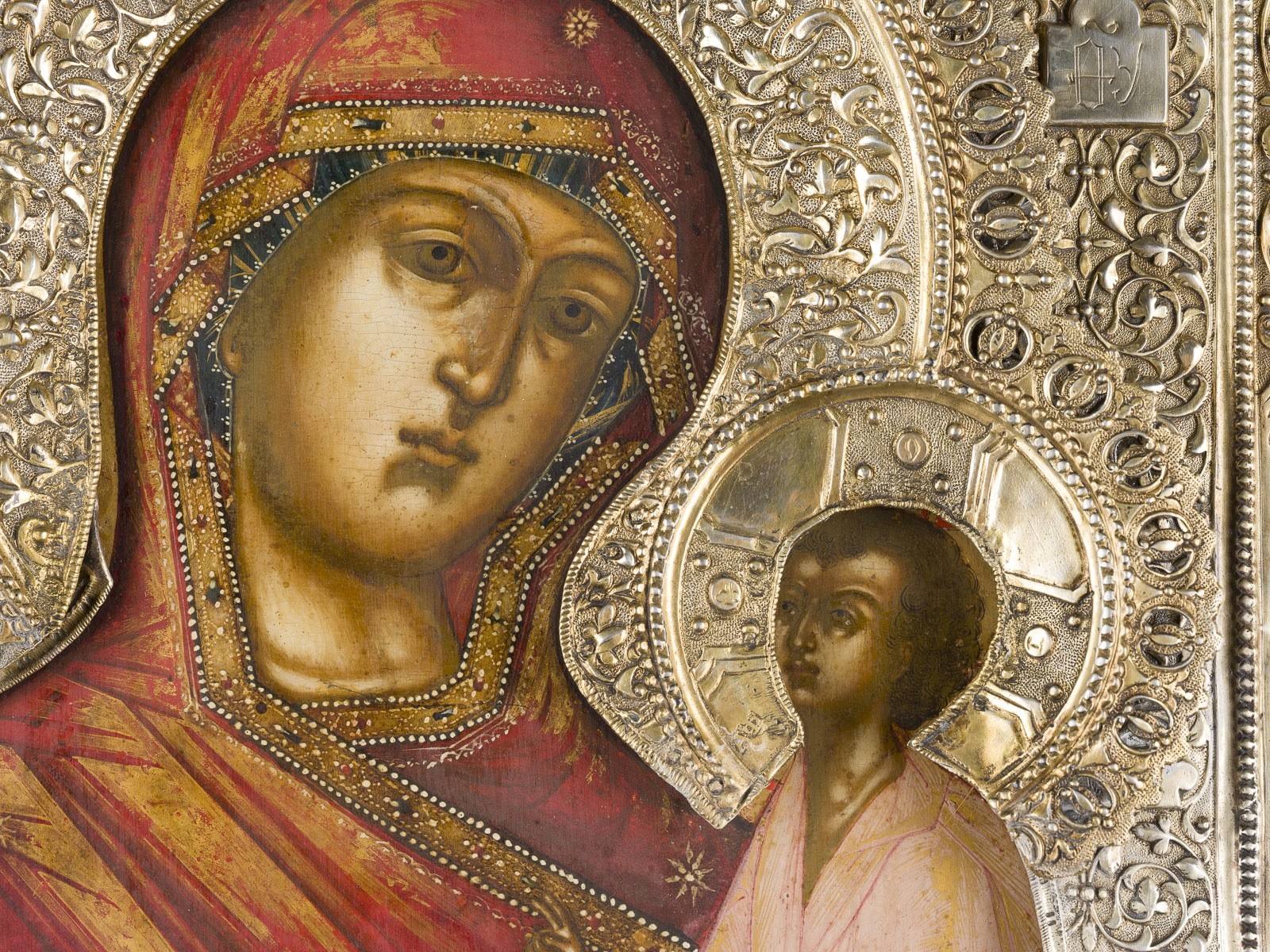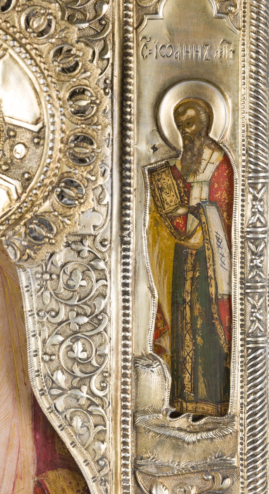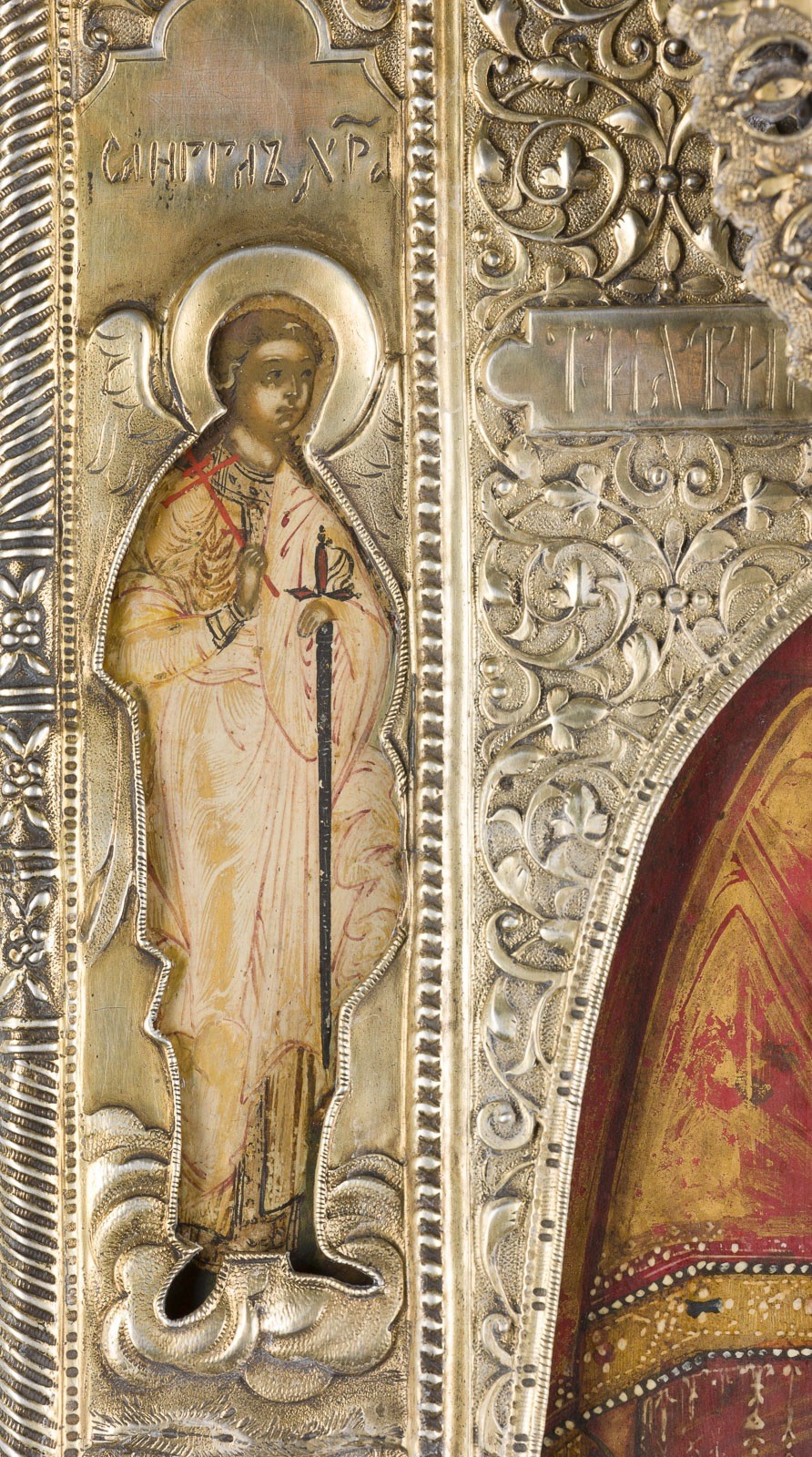 A VERY FINE ICON OF THE MOTHER OF GOD OF TIKHVIN WITH SILVER-GILT RIZA Russian, early 18th century (icon); Moscow, Aleksei Fedorovich Frolov, 1865 (riza) Tempera on wood panel, partly gilded, with chrysography. The riza of silver-gilt, repoussé, engraved and struck with city mark, assayer's mark, '84' standard and master's mark 'AF' in Cyrillic. With two saints on the borders, the Guardian Angel among them. Executed in very fine painting, the garments enriched with elaborate gold folds, the faces modelled in shades of brown and beige. Minor areas of retouching. 31 x 26.5 cm.