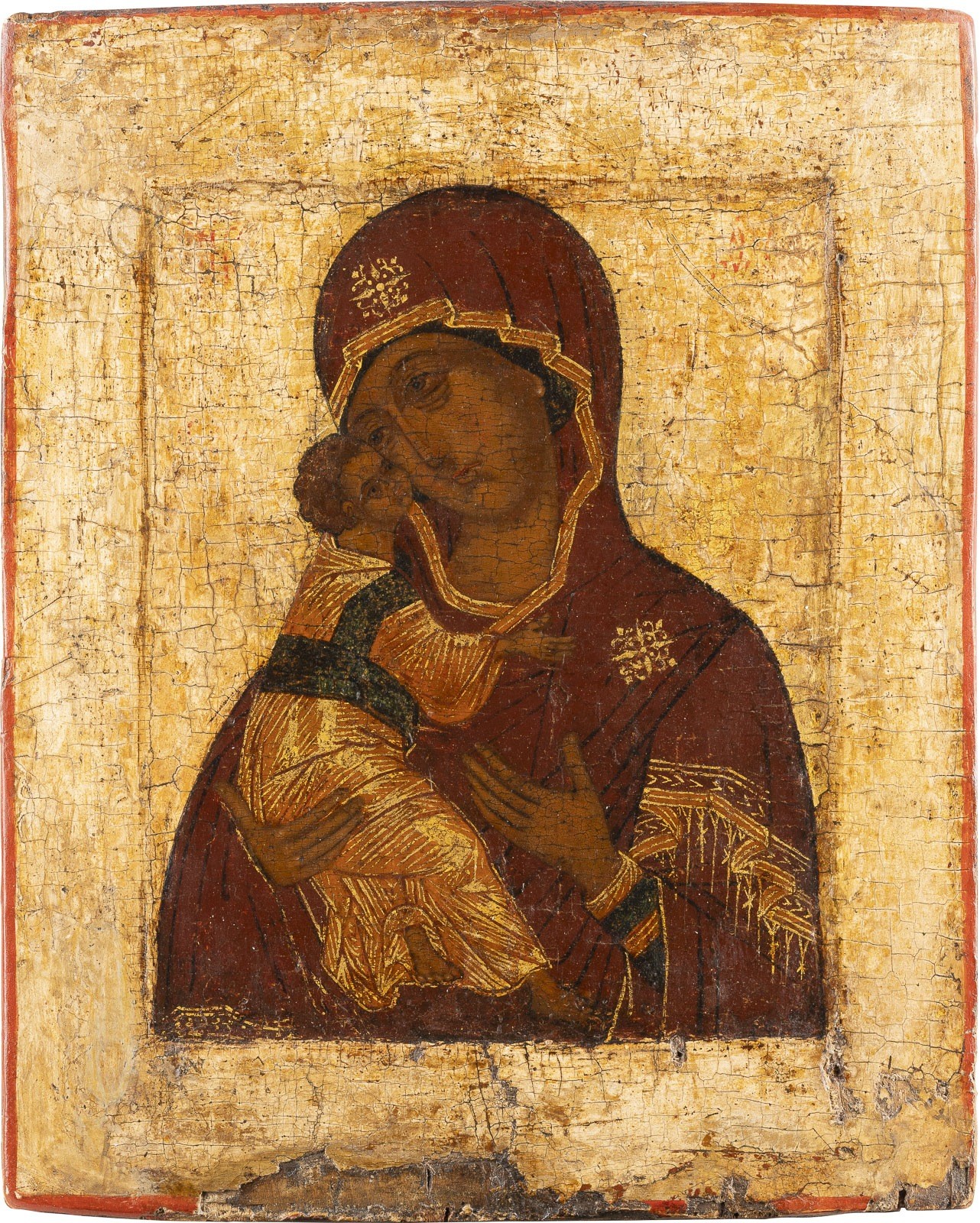 A VERY FINE ICON SHOWING THE VLADIMIRSKAYA MOTHER OF GOD Russian, Moscow, late 15th century Tempera on wood panel with kovcheg. Executed on a gold ground. Painted in ochre colours, the Mother of God carrying Christ on her right arm, gesturing with her left hand towards her Son, the Christ Child pressing his cheek against his Mother's. Minimally restored. 31.3 x 25.5 cm.