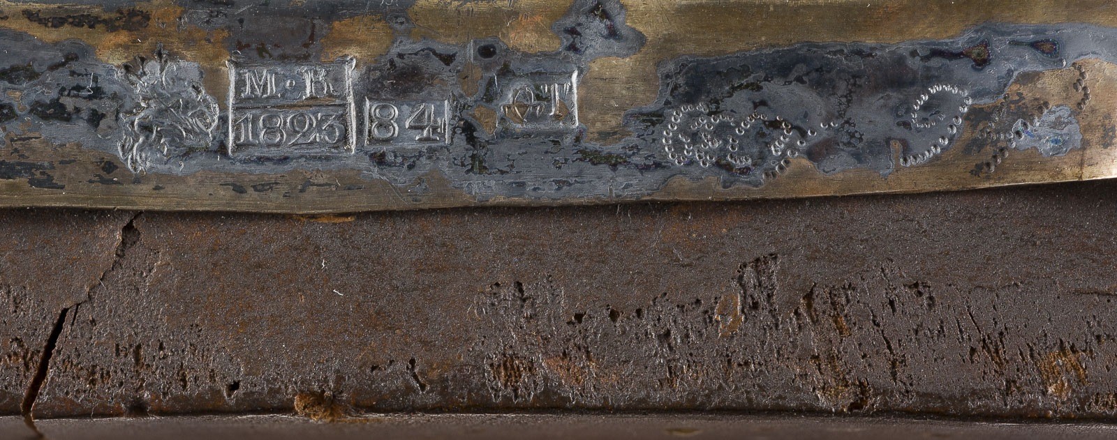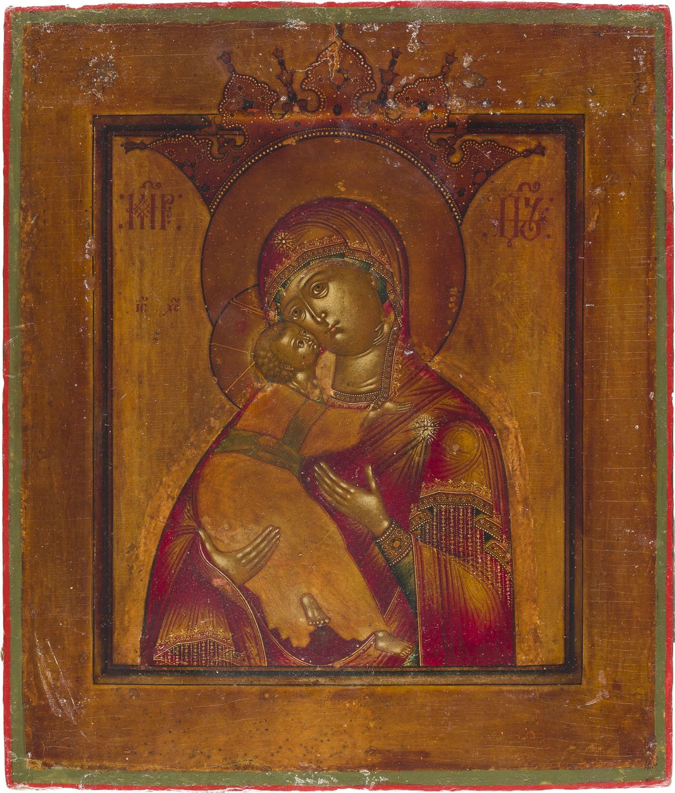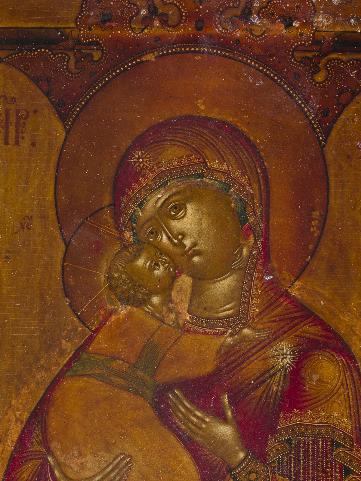 A VERY FINE ICON SHOWING THE VOLOKOLAMSKAYA MOTHER OF GOD WITH AN EMBROIDERED SILVER-GILT OKLAD Russian, late 18th century (icon), Russian, Moscow, 1823 (oklad) Tempera on wood panel with kovcheg. The haloes and folds of the garments made of gold. The silver-gilt oklad finely chased and engraved with foliage and geometric motifs. The maphorion of the Mother with an elaborate embroidery with foliate and stylised designs, set with paste. Marked with city hallmark, assayer's mark, 84 standard and master's mark. Minor areas of retouching. 31.3 x 26.9 cm.