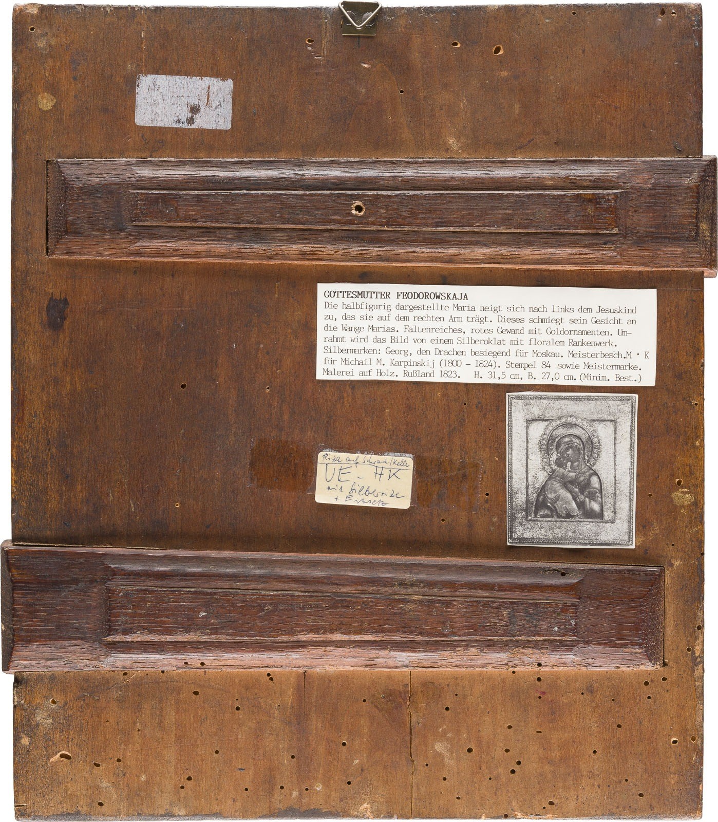 SEHR FEINE IKONE MIT DER GOTTESMUTTER 'WOLOKOLAMSKAJA' MIT PERL-VERMEIL-OKLAD