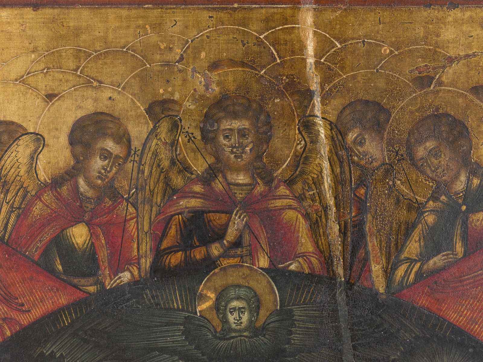 A VERY FINE ICON SHOWING THE CORONATION OF THE MOTHER OF GOD Russian, 18th century Tempera on wood panel. Rendered in a fine detailed manner with reds and greens against a golden background. Two selected saints on the borders: St. John the Forerunner and St. Catherine. Vertical crack restored. 32.8 x 26.2 cm.