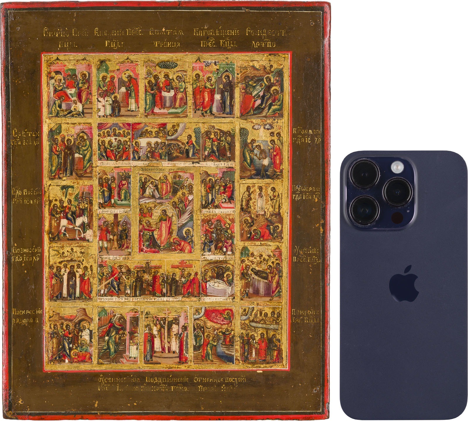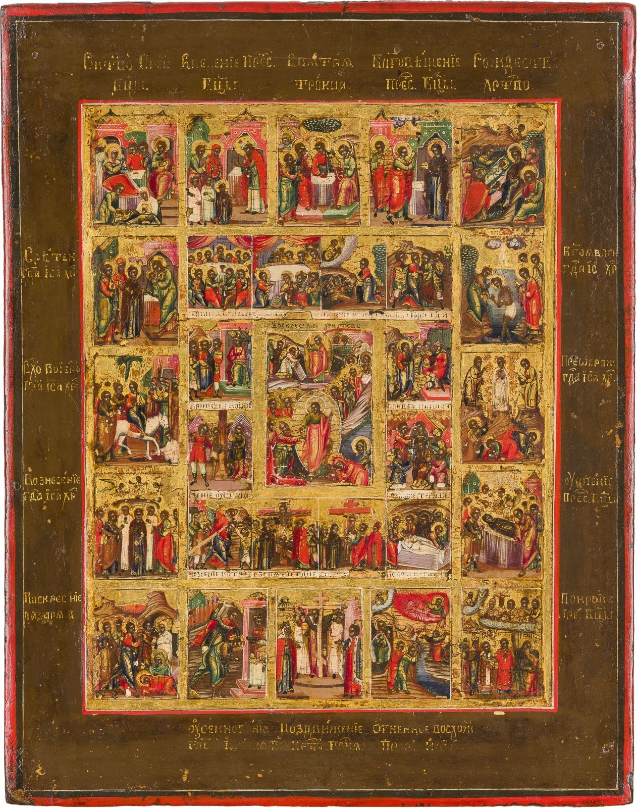 A VERY FINE AND SMALL ICON SHOWING THE RESURRECTION AND DESCENT INTO HELL SURROUNDED BY THE PASSION AND 16 MAJOR FEASTS OF THE CHURCH Russian, 19th century Tempera on wood panel with kovcheg. Finely painted in great detail against a golden background. Minor areas of retouching. 22.2 x 17.5 cm.