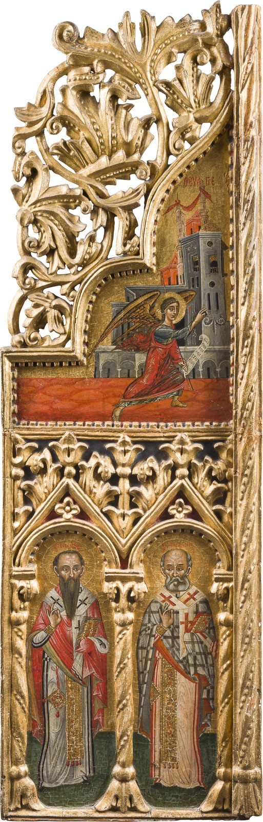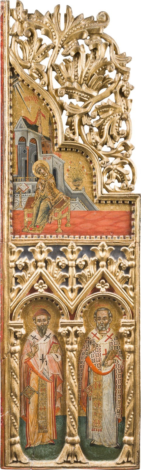 A VERY FINE PAIR OF ROYAL DOORS FROM A CHURCH ICONOSTASIS SHOWING THE ANNUNCIATION AND FOUR SELECTED SAINTS Greek, 17th century Tempera on wood panels. Painted with the Scene of the Annunciation and Sts. Basil the Great, Gregory the Theologian, Spyridon and Nicholas of Myra, each standing frontally and holding a Book, all figures portrayed within individual frames shaped as niches divided by columns. With foliate carved and pierced surmounts. Minor areas of restoration. 137.7 x 83.5 cm.