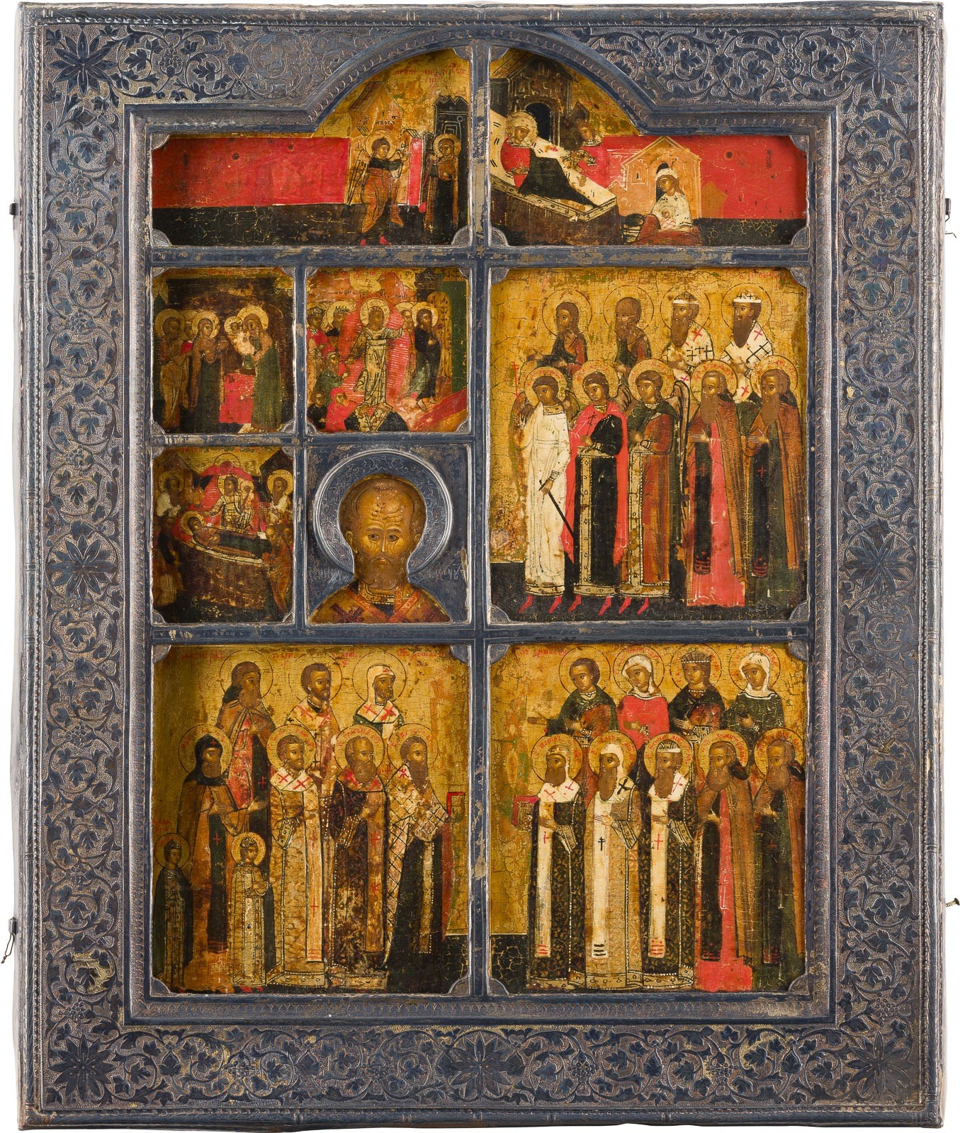A VERY FINE MULTI-PARTITE ICON SHOWING THE ANUNCIATION, THE NATIVITY OF THE MOTHER OF GOD, FEASTS AND SAINTS WITH A SILVER RIZA Russian, Moscow or Solvychegodsk, Stroganov School, 17th century (icon), Russian, Kazan, 1877 (riza) Tempera on wood panel with kovcheg. Finely painted in miniature on a gold ground. Inserted in a later panel (vrezka). The silver basma engraved with scrolling foliage. Marked with city hallmark, assayer's mark, 84 standard and master's mark. 37.7 x 30.5 cm.