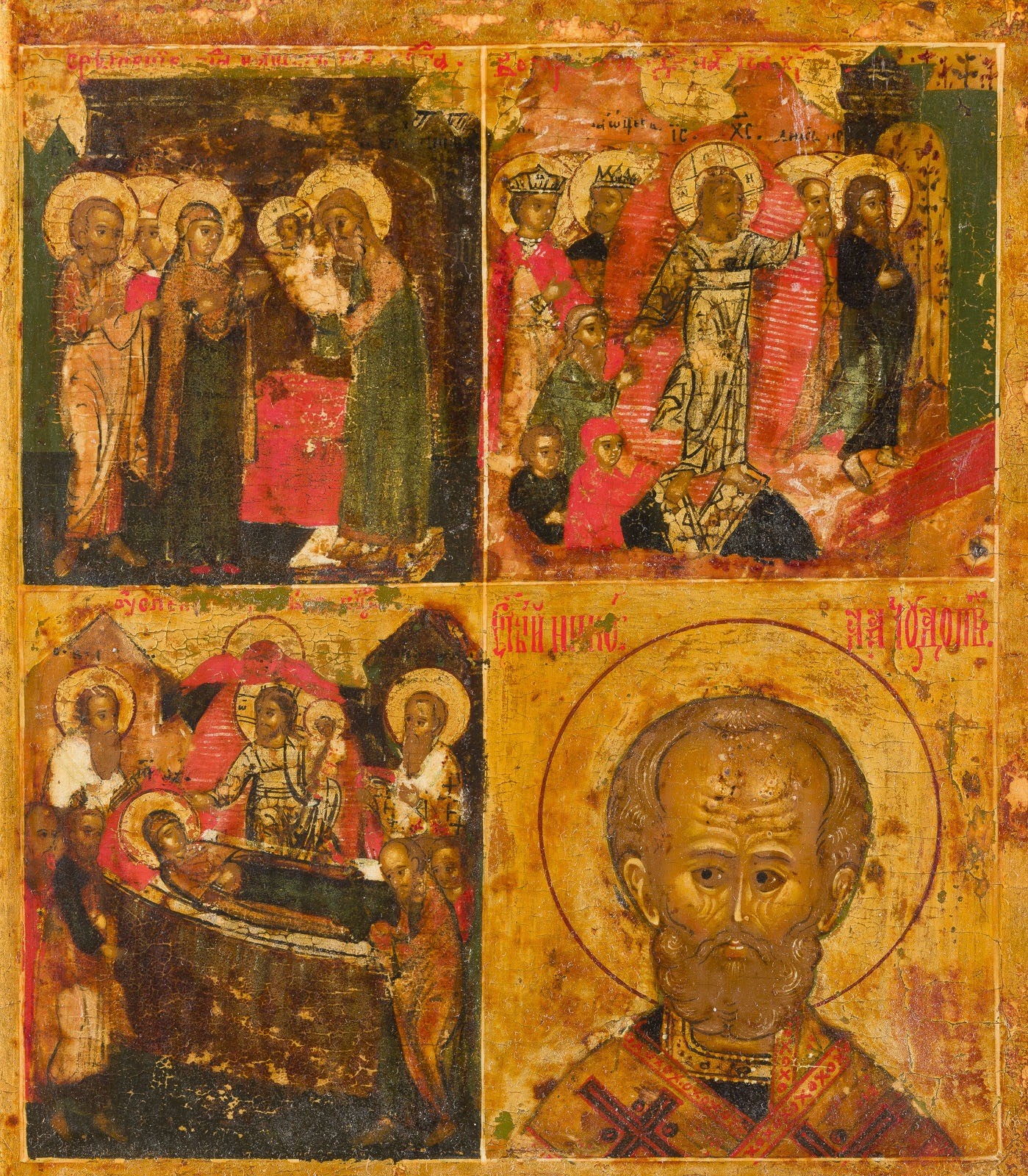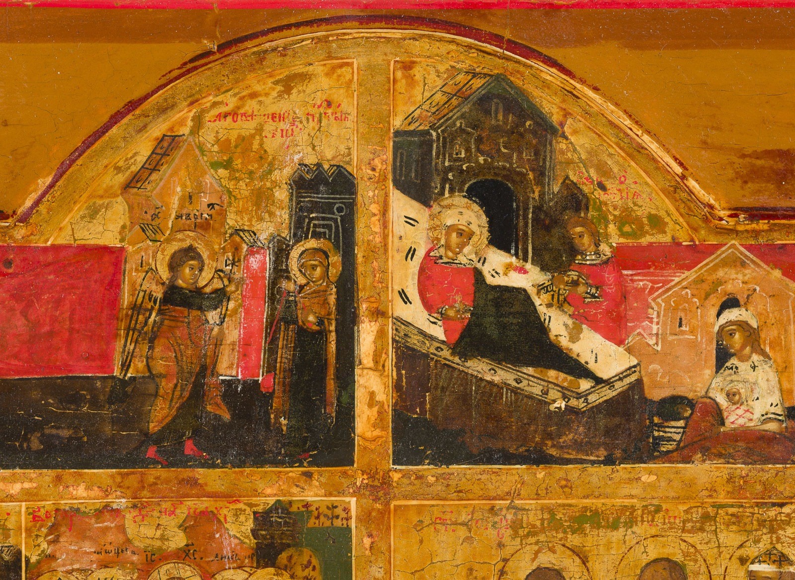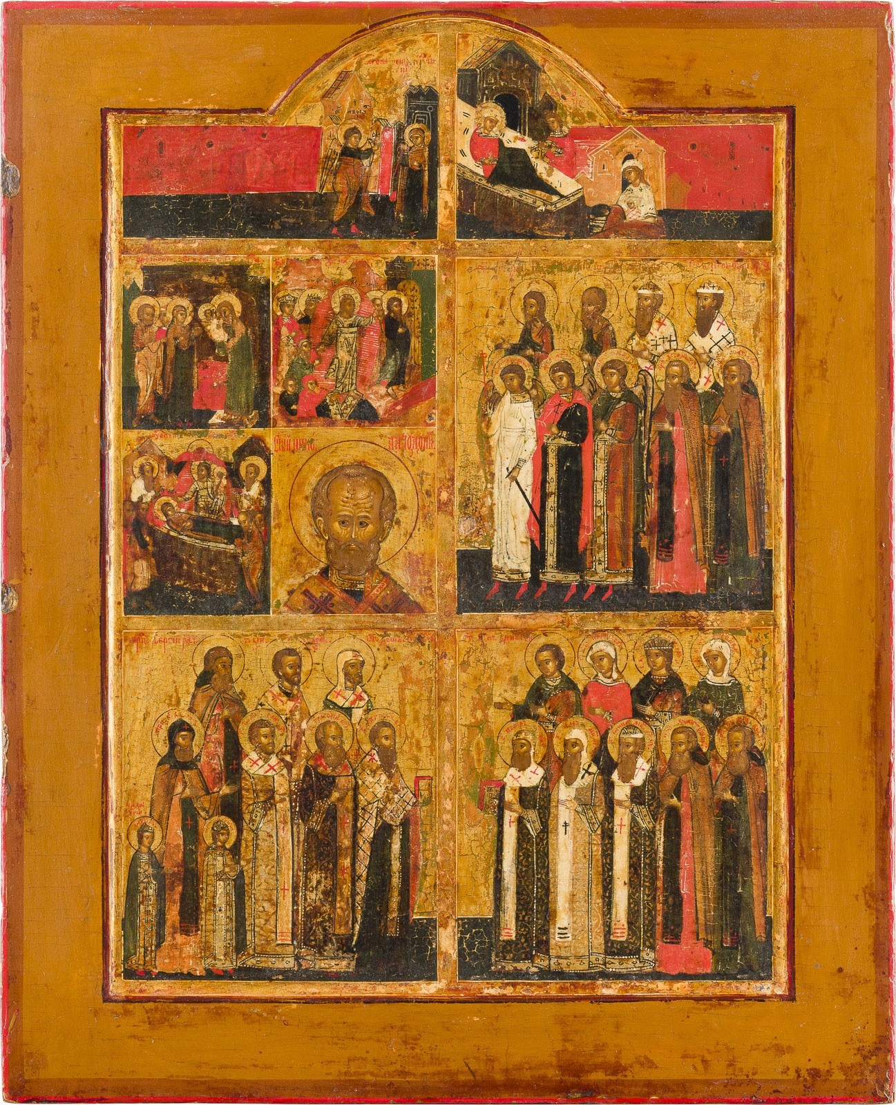 SEHR FEINE MEHRFELDER-IKONE MIT DER VERKÜNDIGUNG, DER GEBURT DER GOTTESMUTTER, HOCHFESTEN UND AUSGEWÄHLTEN HEILIGEN MIT SILBER-BASMA